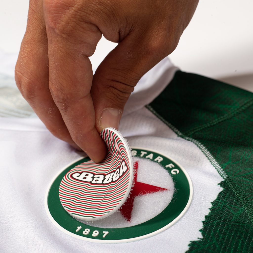 While Red Star’s club badge is present and correct, it is topped with the loop element of Velcro, with the option to affix hook-backed alternative discs within the identifying ring.