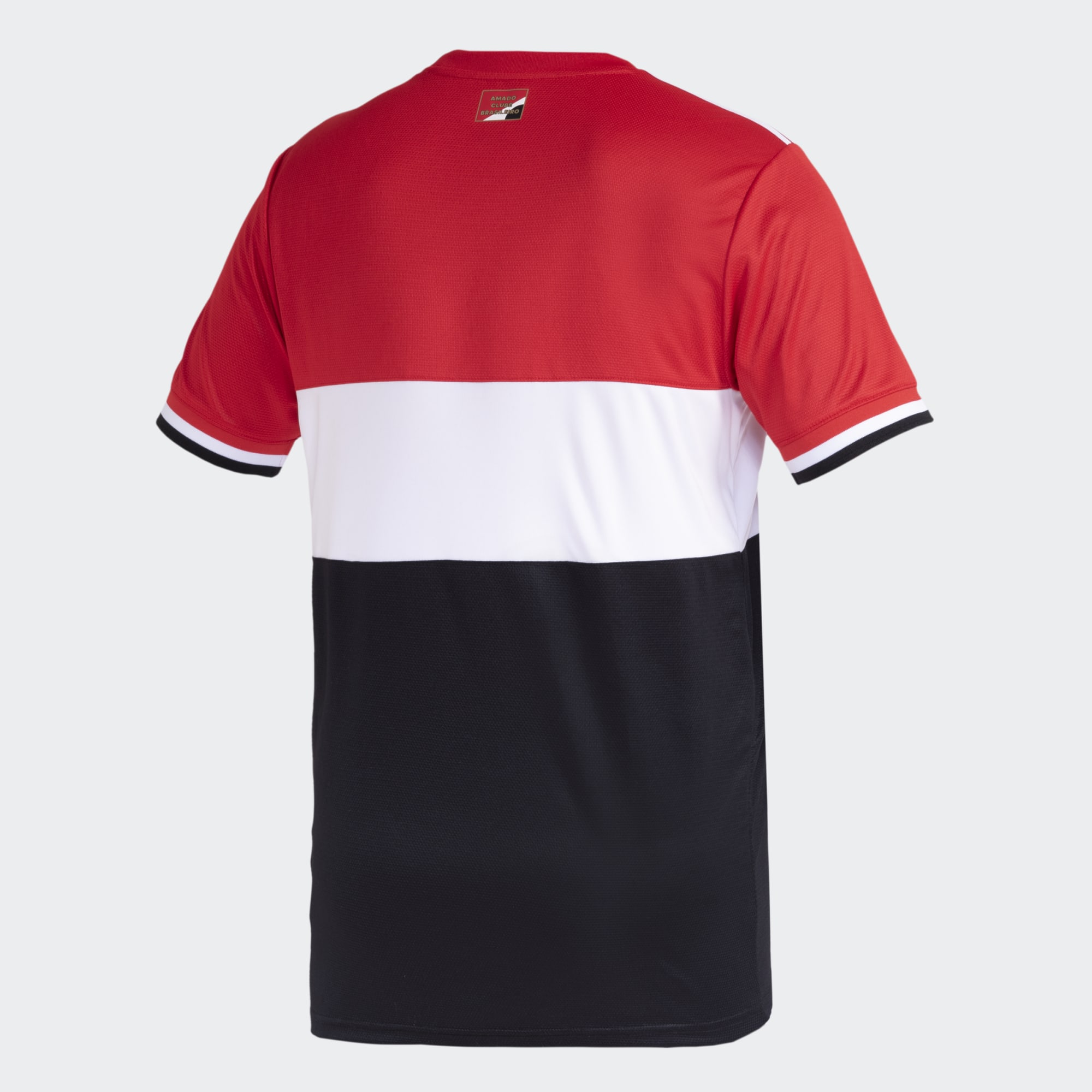 The new secondary change design by the German manufacturer - marketed as for 2021-22 - is in the famous tri-colour palette, with the upper portion, including the sleeves, in red, with a white band separating it from the black lower down.