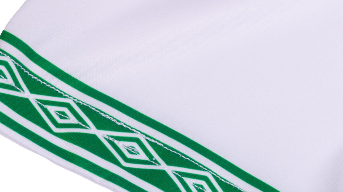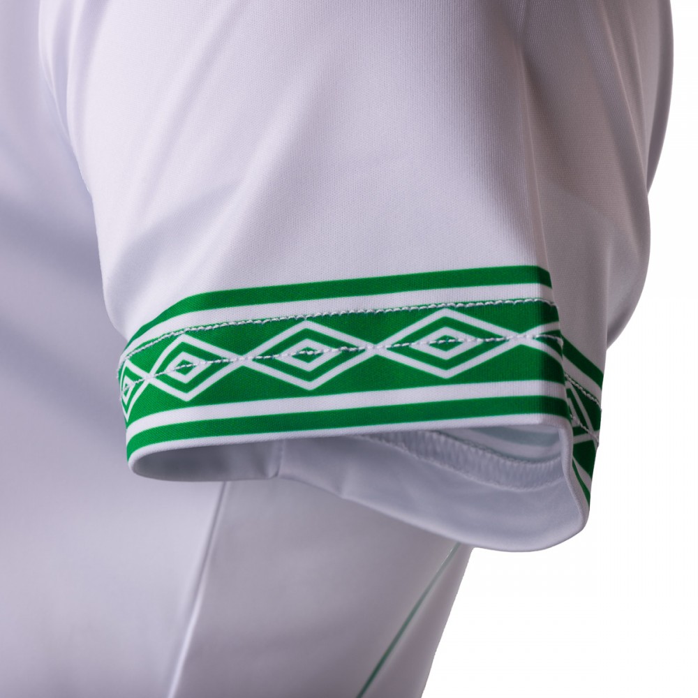 Inside the neck is a hashtag-motto “#TogetherAsOne” and the kit is completed with white shorts and green socks.