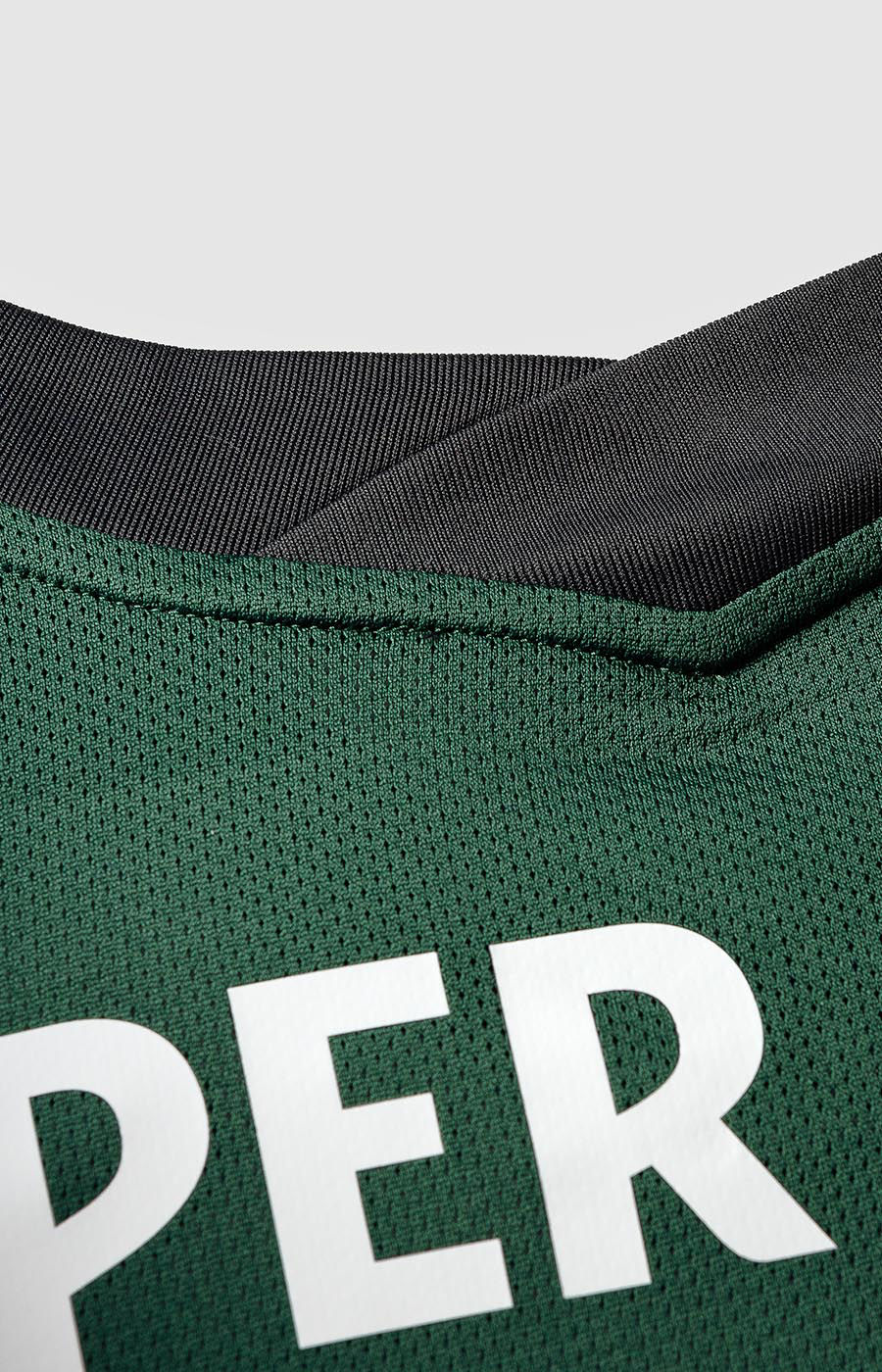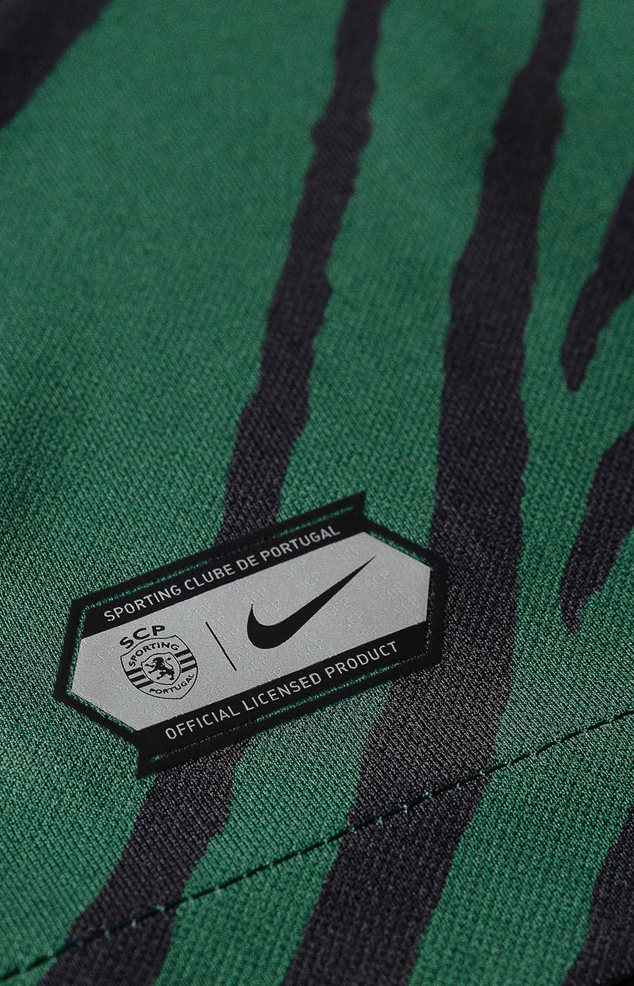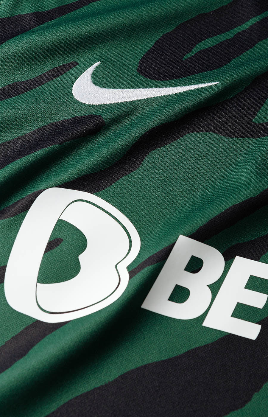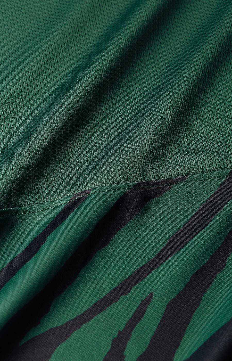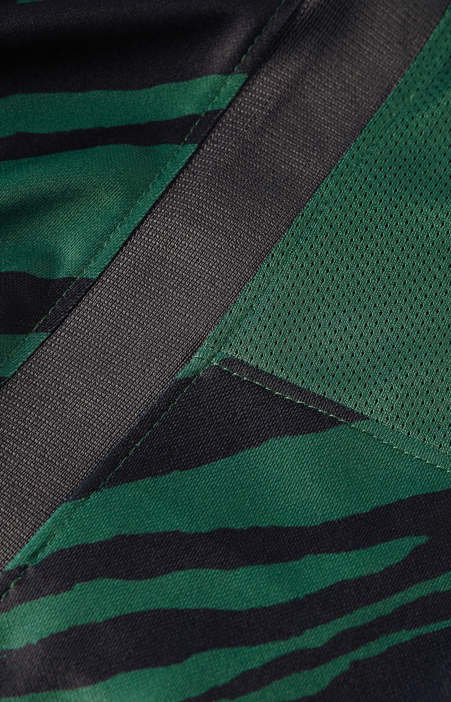 The Nike design’s green base is decorated with animal-style striping in black, matching the stylised overlapping v-neck and the cuffs.