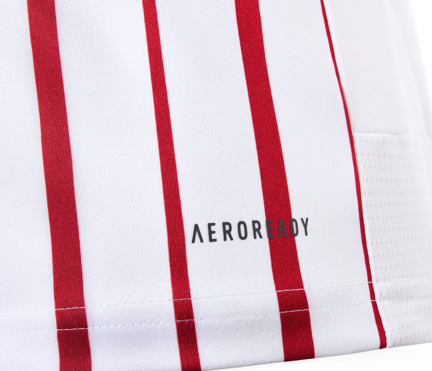 Matching the crest - celebrating Standard Liège’s 100 years at the top table of Belgian football - the adidas branding and that of other partners, there are spiked stripes of alternating thicknesses emanating from the hem, and the cuffs and v-neck are nicely trimmed in red also.