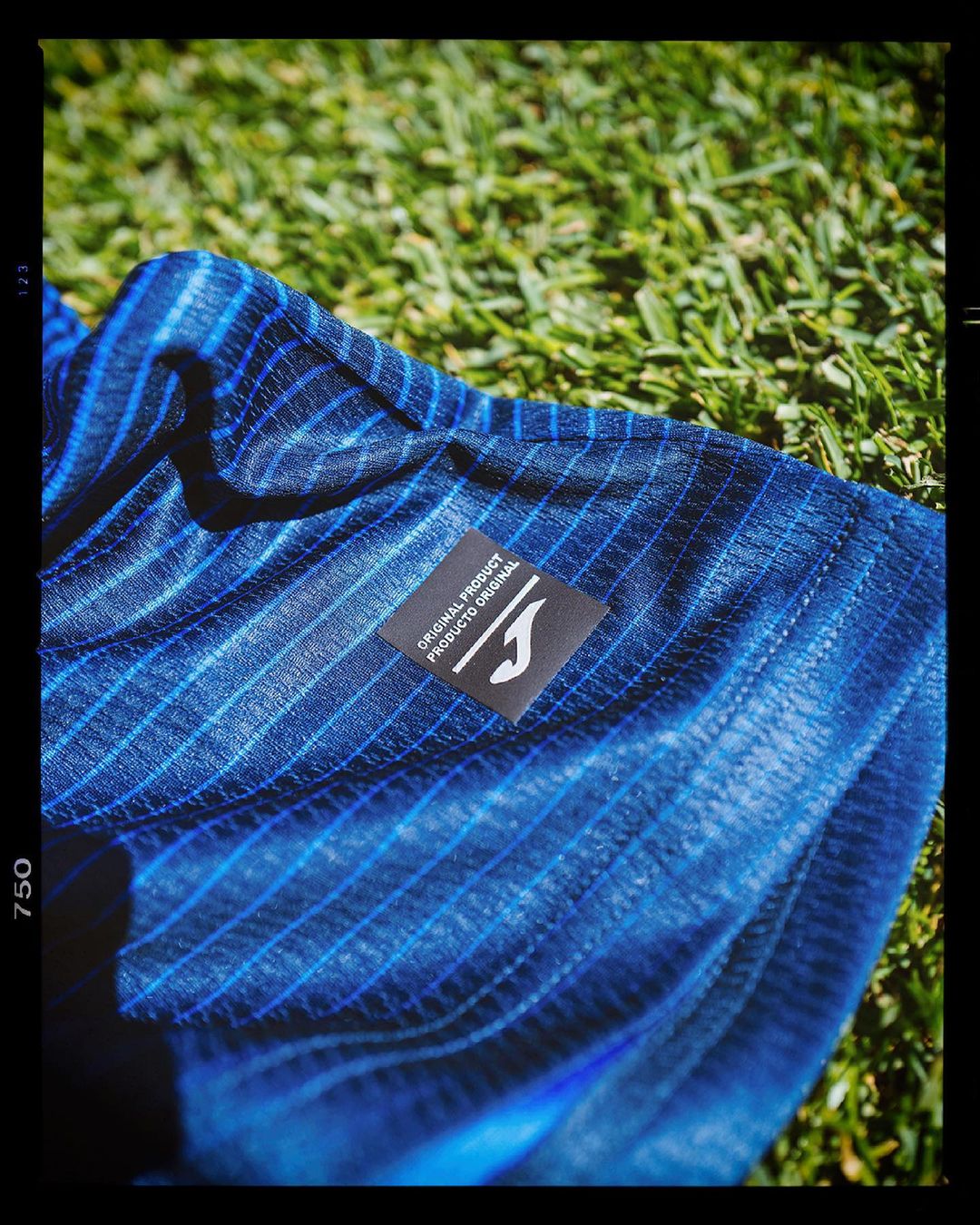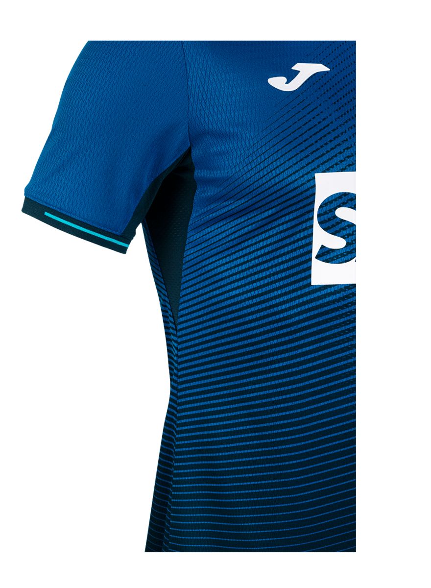 Featuring the usual Joma logos and main sponsor in contrast white, and the crest in full colour, the blue, textured base of the shirt gradates to navy - to match the shorts and socks - and the neck and cuffs are also in navy with light blue trim.