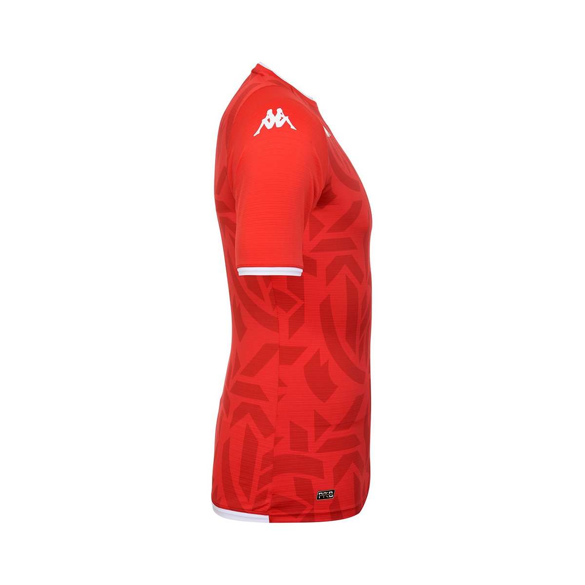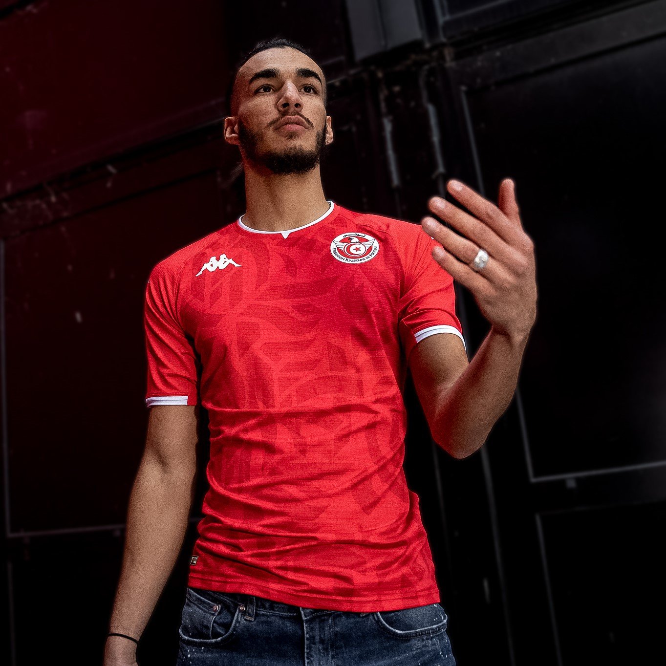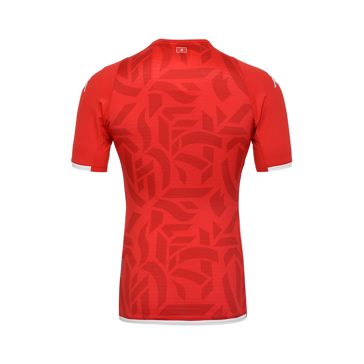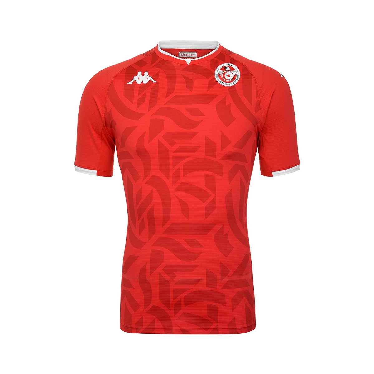 Tunisia’s latest primary shirt is in red with a tonal sublimation print in the style of Arabic calligraphy, while the change version is in white and similarly embellished.