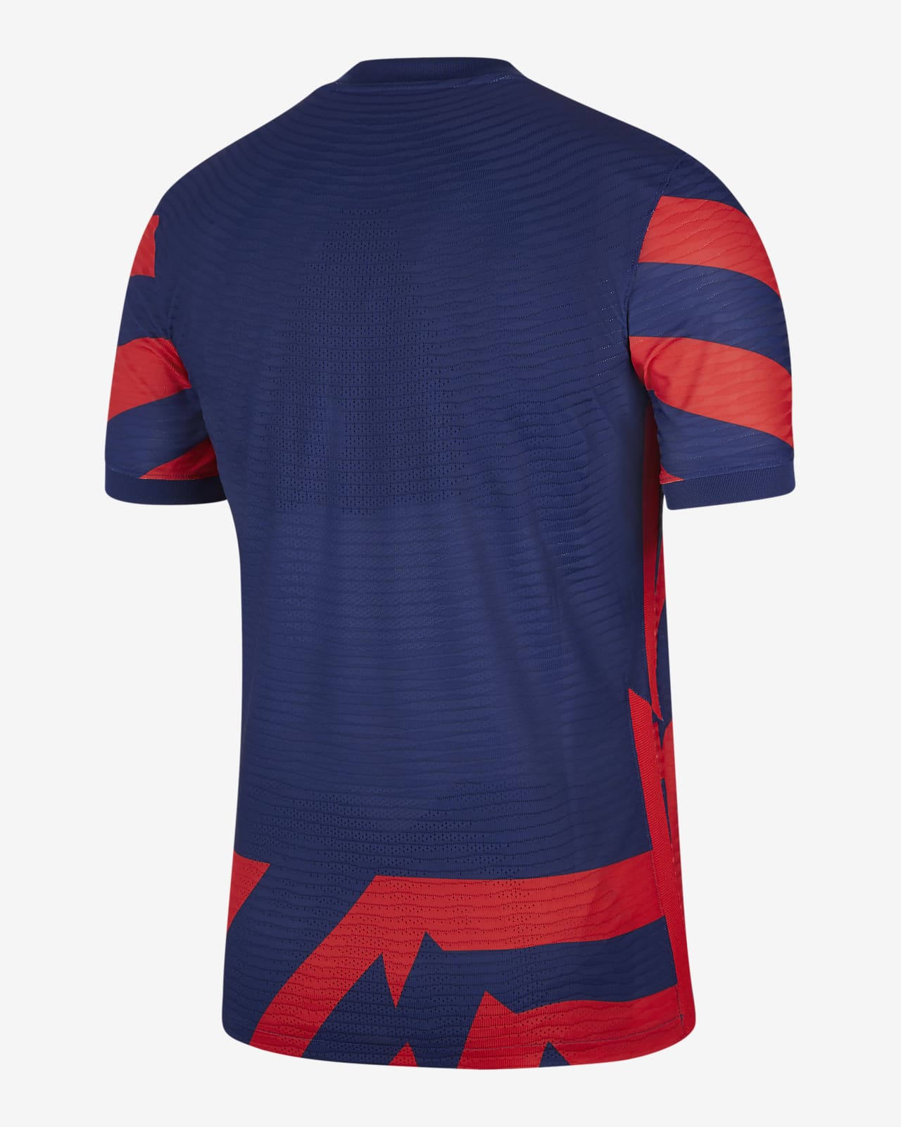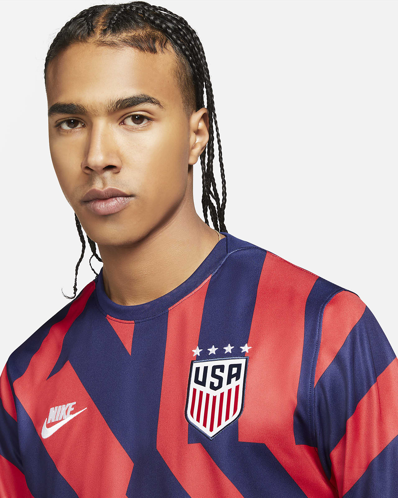 The away jersey features a zigzag pattern of Loyal Blue/Speed Red and is inspired by a waving flag of the United States while it replicates the on-pitch energy of the iconic U.S. National Teams.