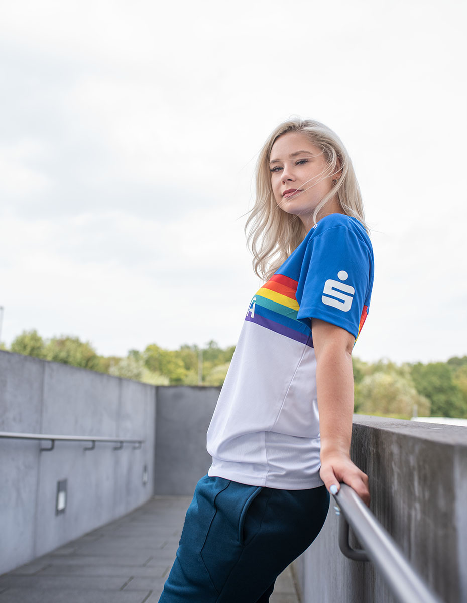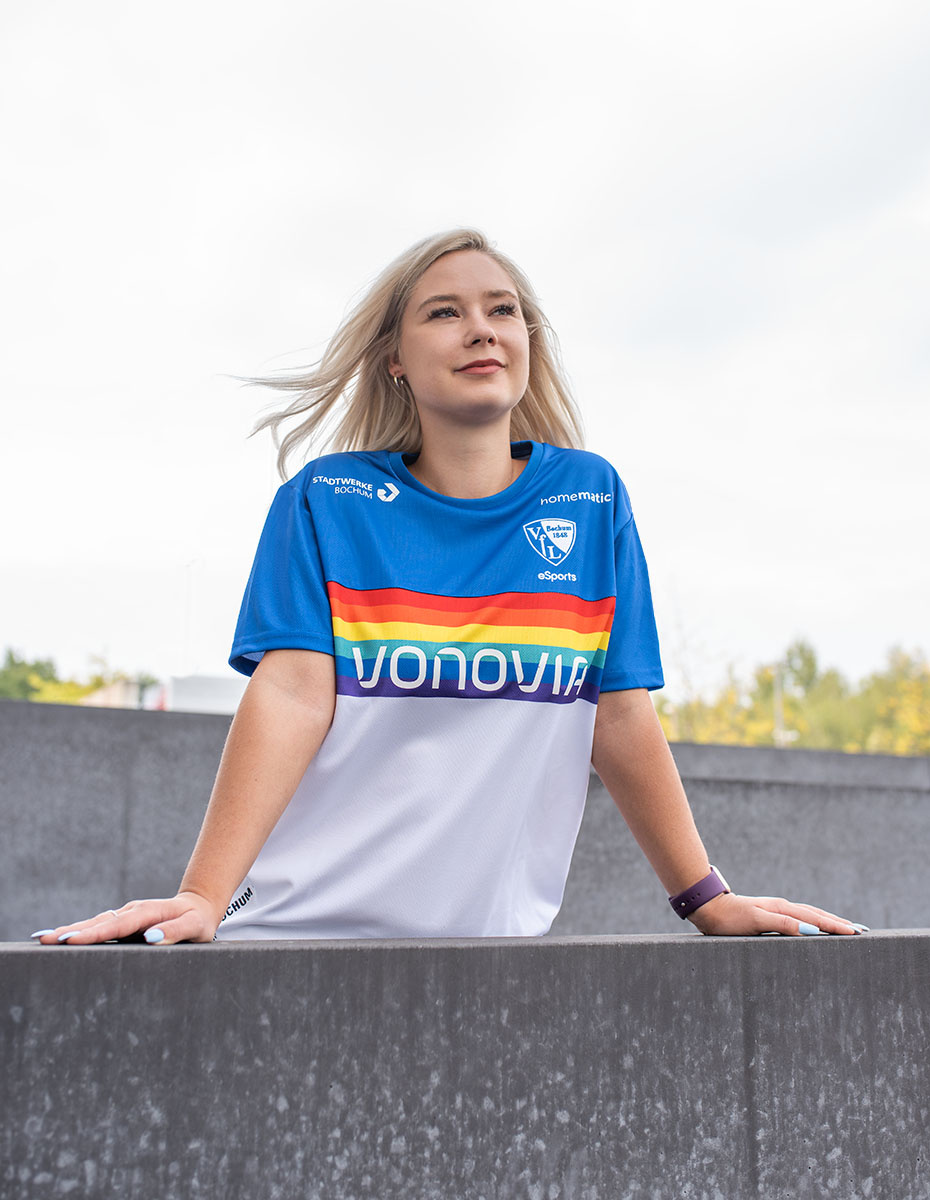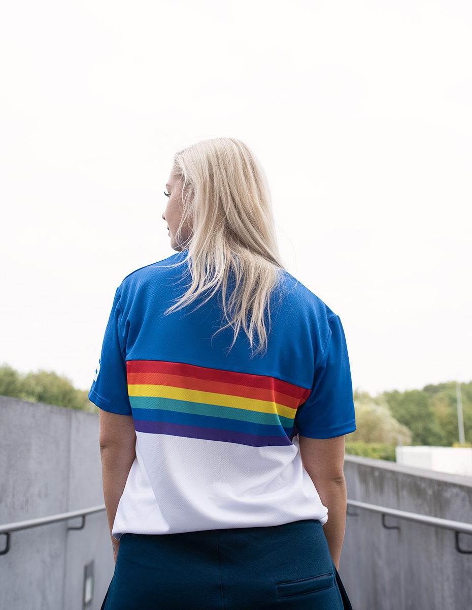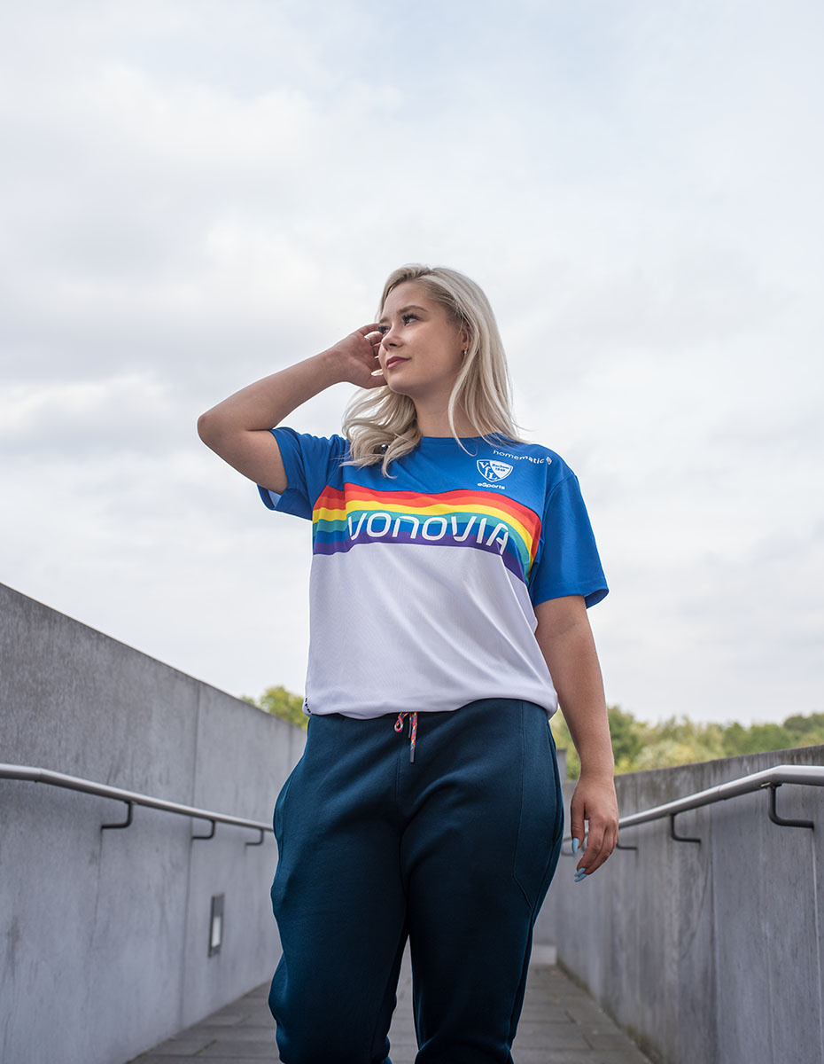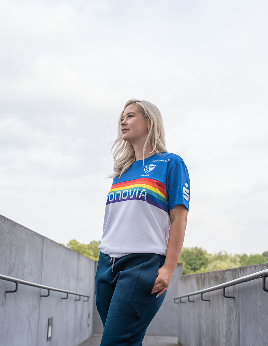 Nodding to Bochum’s famous shirts of the past, the generally blue and white release features a central horizontal band in rainbow colouring.