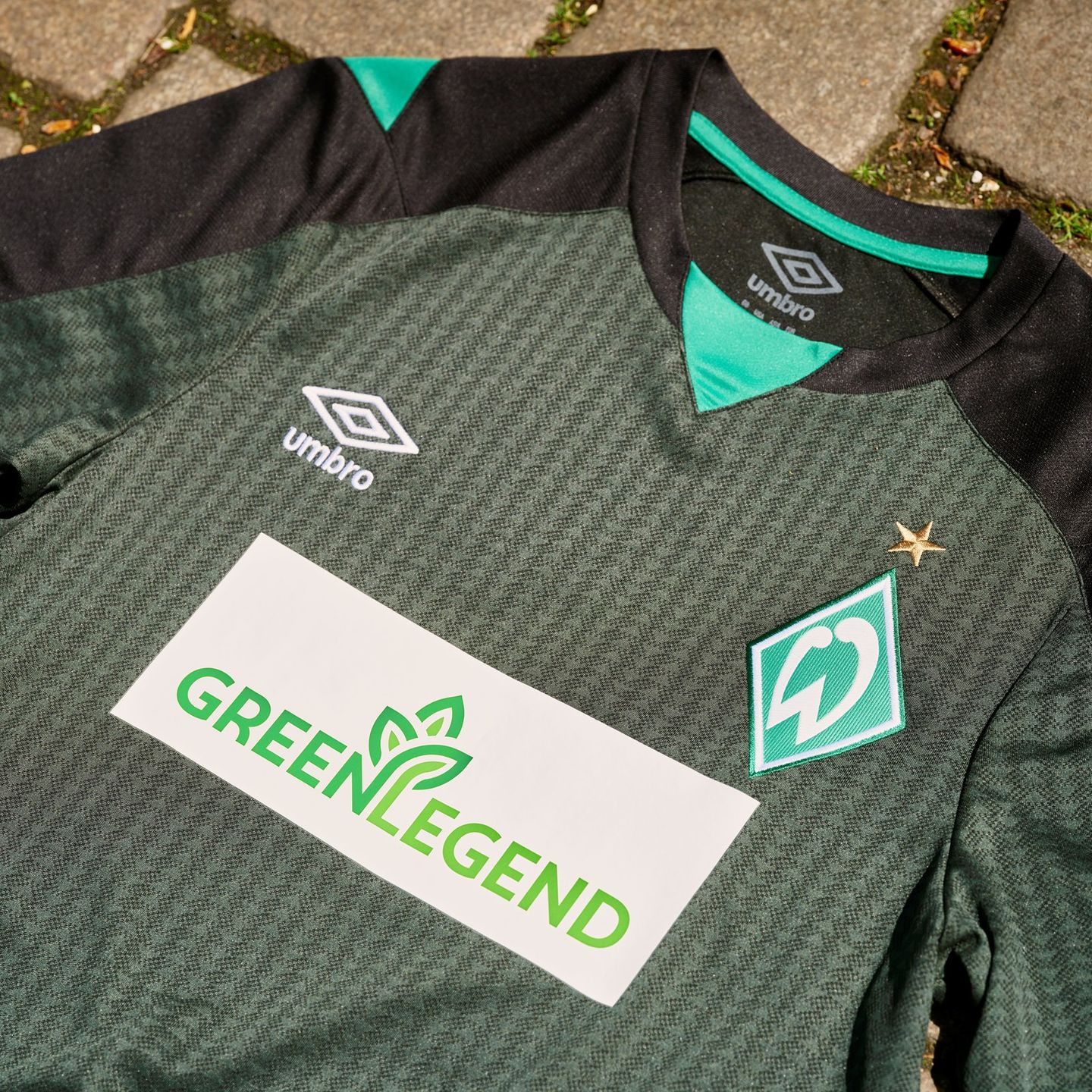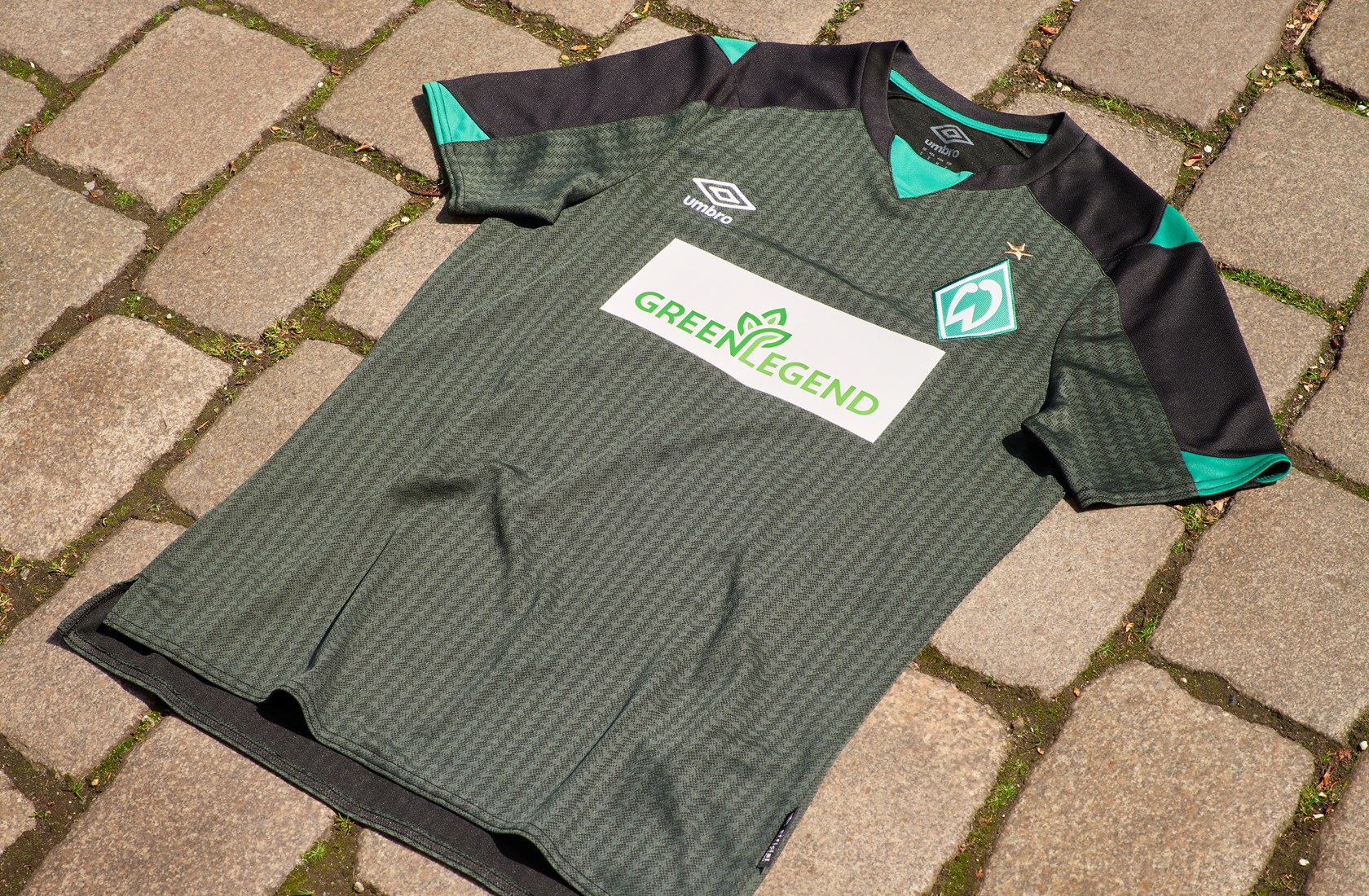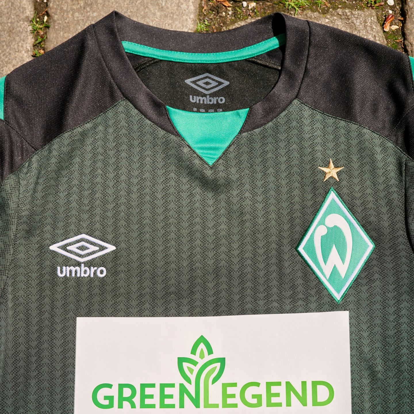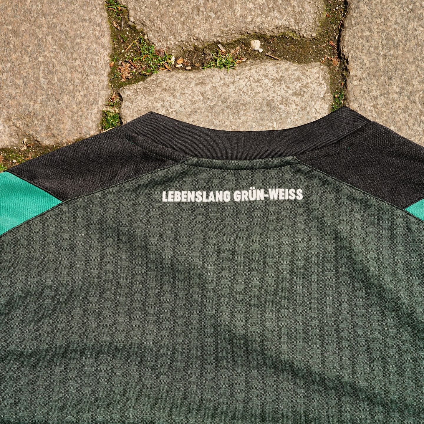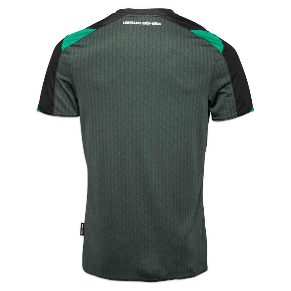 On the shoulders, black panels are highlighted with vibrant green inserts. Further details include a crew-neck collar and cuffs in black and green. To complete the look, ‘Lebenslang grun-weiss’ (green-white for life) is added as a neck sign off on the back.