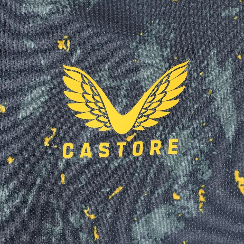 The shorts feature black strips and a gold Castore logo, while the socks display a black wolf head and gold Castore branding on the back.