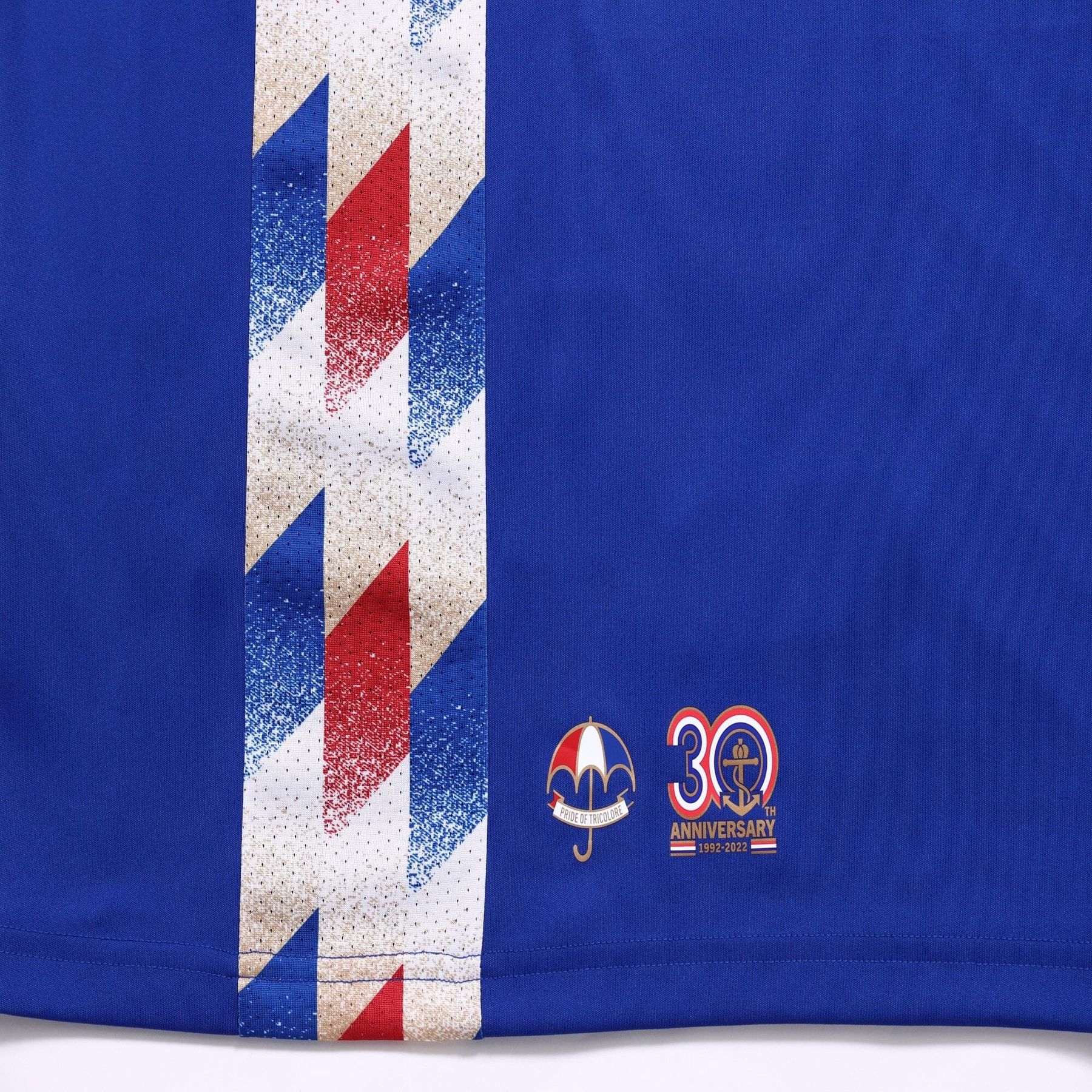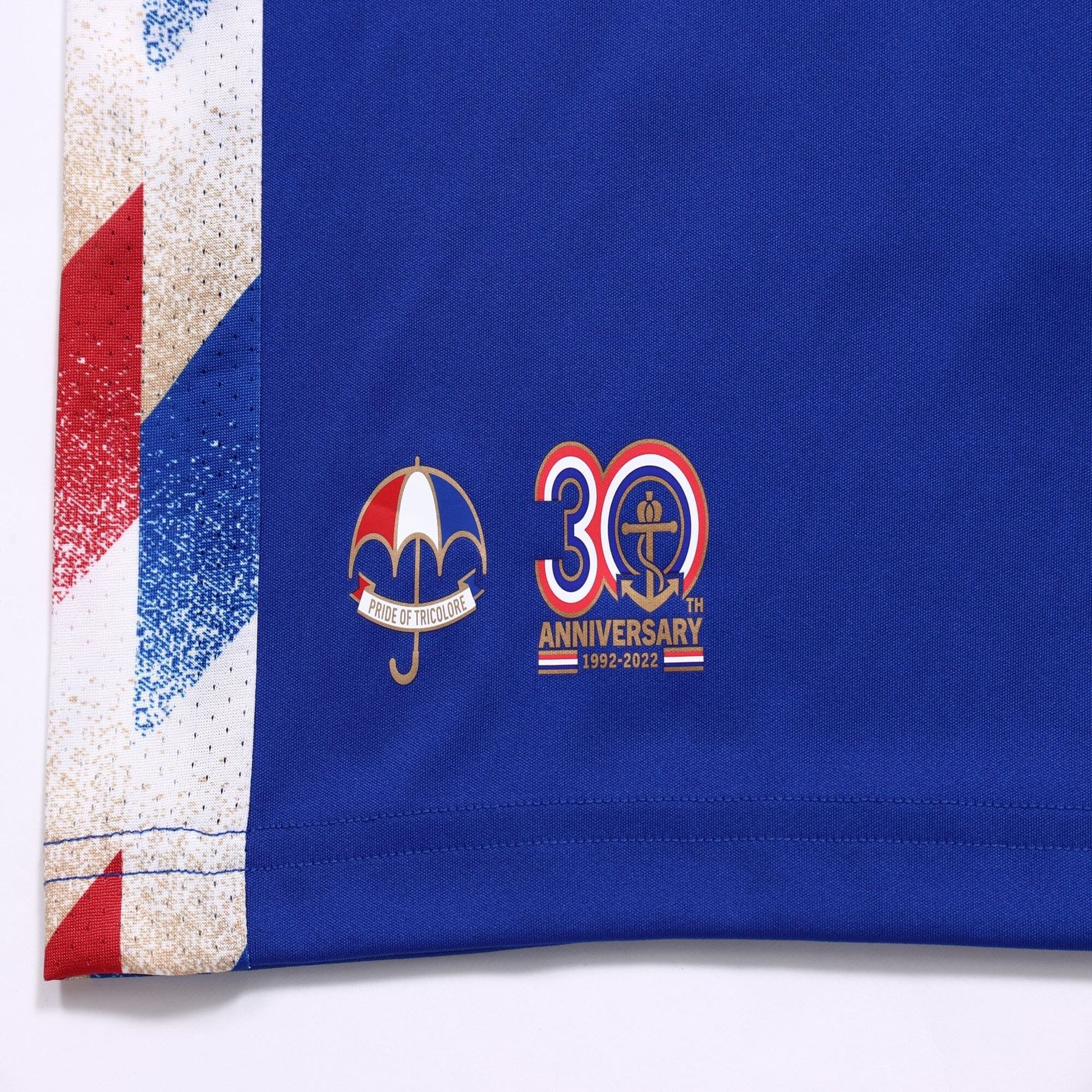 Complete with oversized contrast collar and stylised chequerboard patterning on the sides of the trunk, the shirt carries explicit references to the aforementioned 30th anniversary, with dates below the full-colour crest and another detail on the hem, alongside the “Tripara” logo.