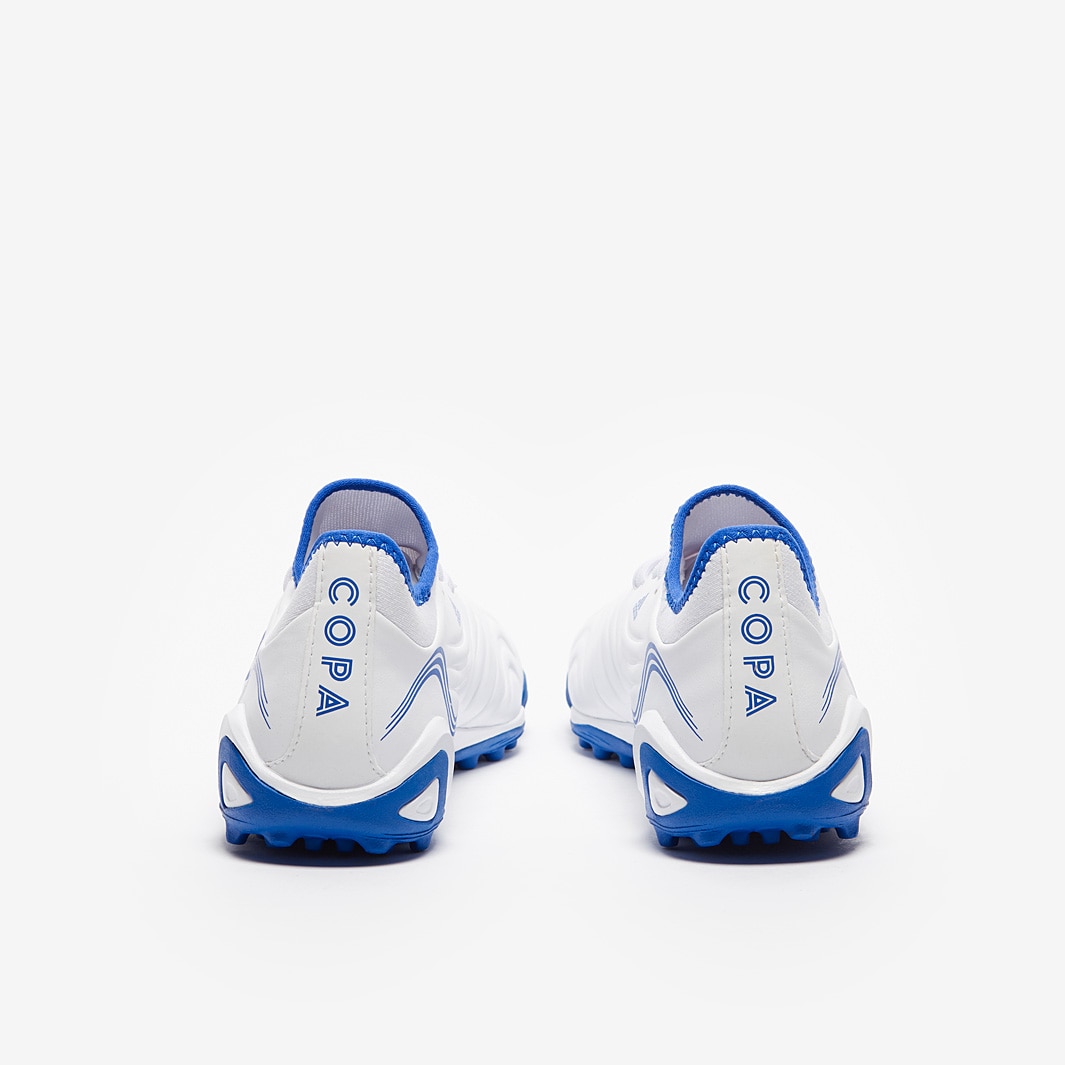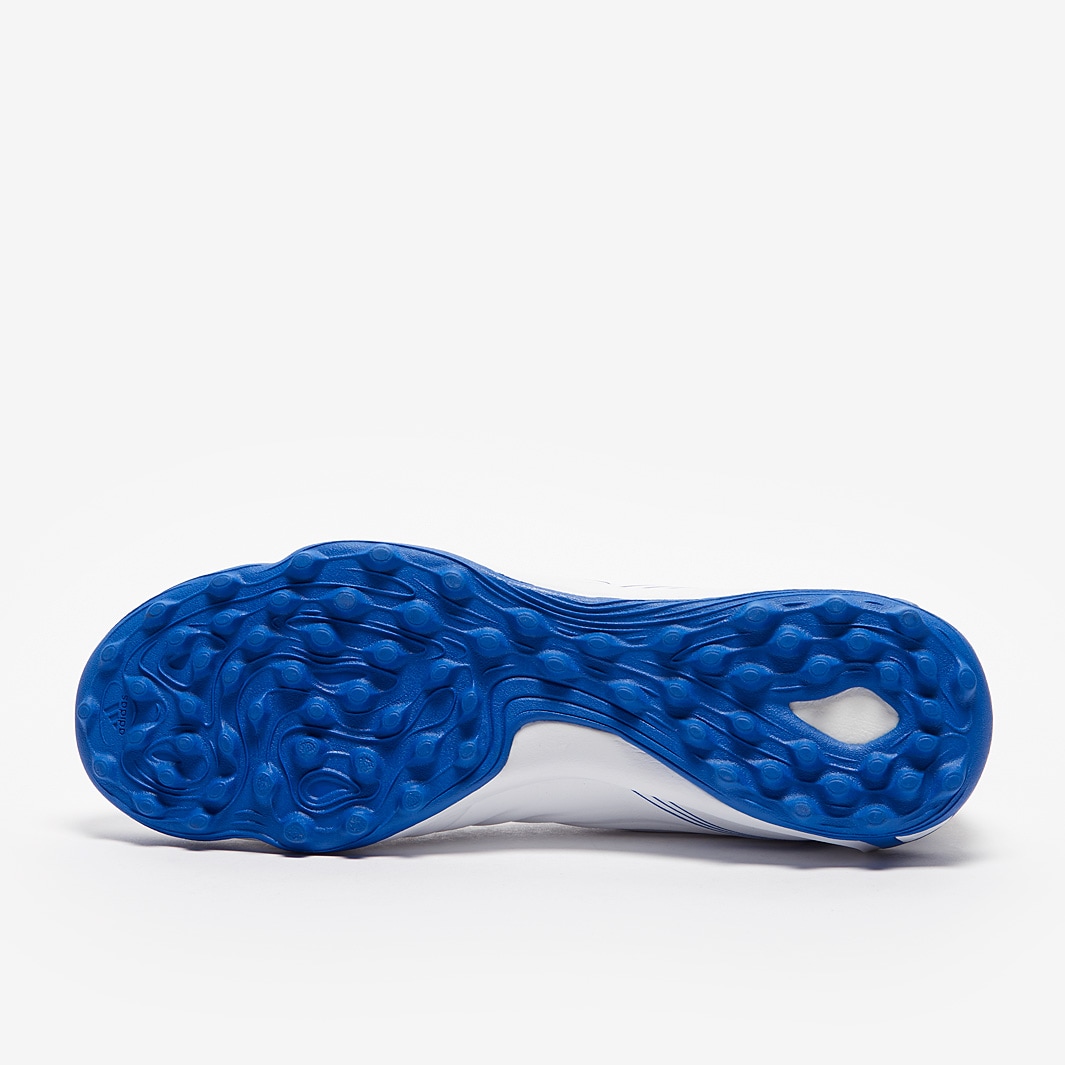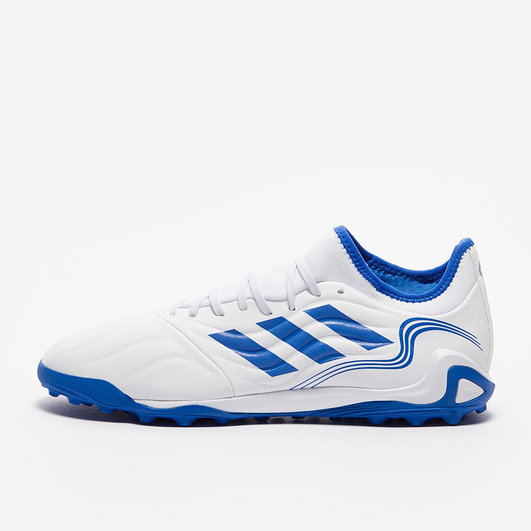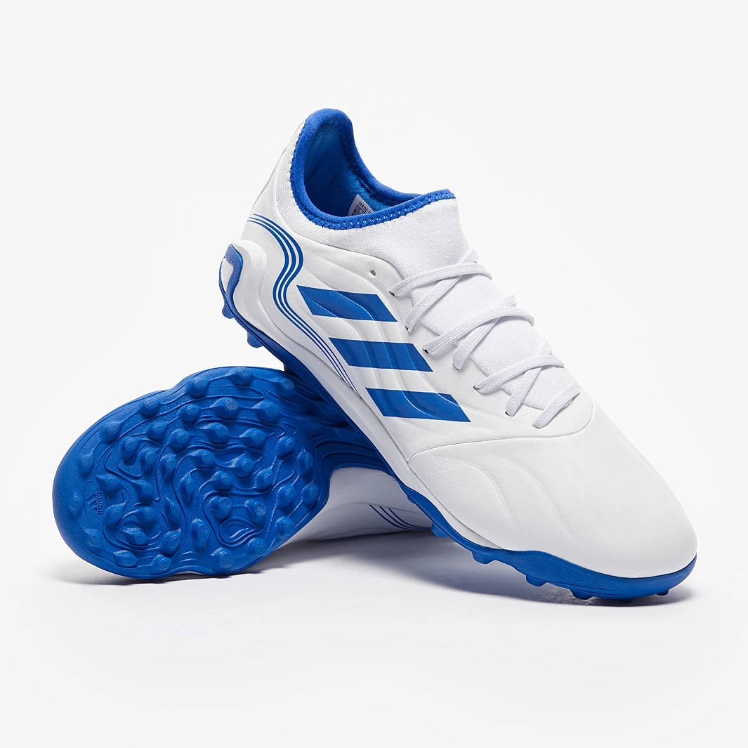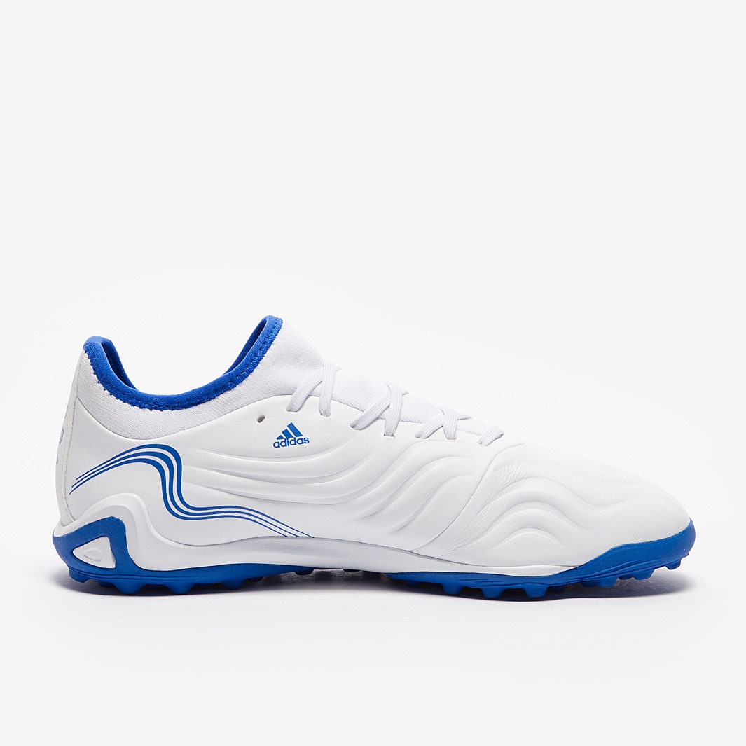 Feel the game and elevate your play wearing adidas Copa Sense.3 TF football shoes in White/Hi-Res Blue/Legacy Indigo, featuring an all-new design with a soft synthetic and leather upper for an anatomical fit and the purest first touch.