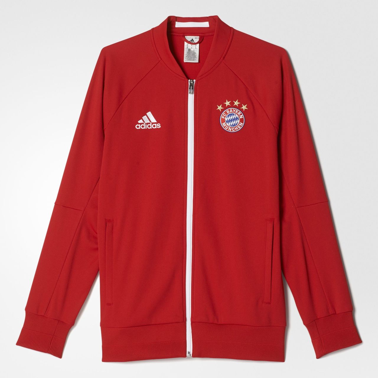 Proudly display FC Bayern's championship legacy with this Adidas FC Bayern München Anthem Jacket. Durably made with medium-weight polyester, this full-zip jacket has snug-fitting cuffs and is built for easy movement.