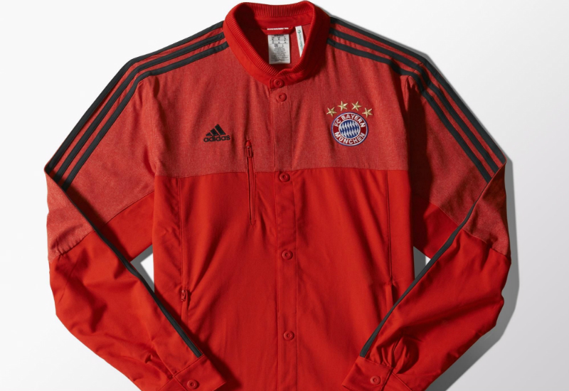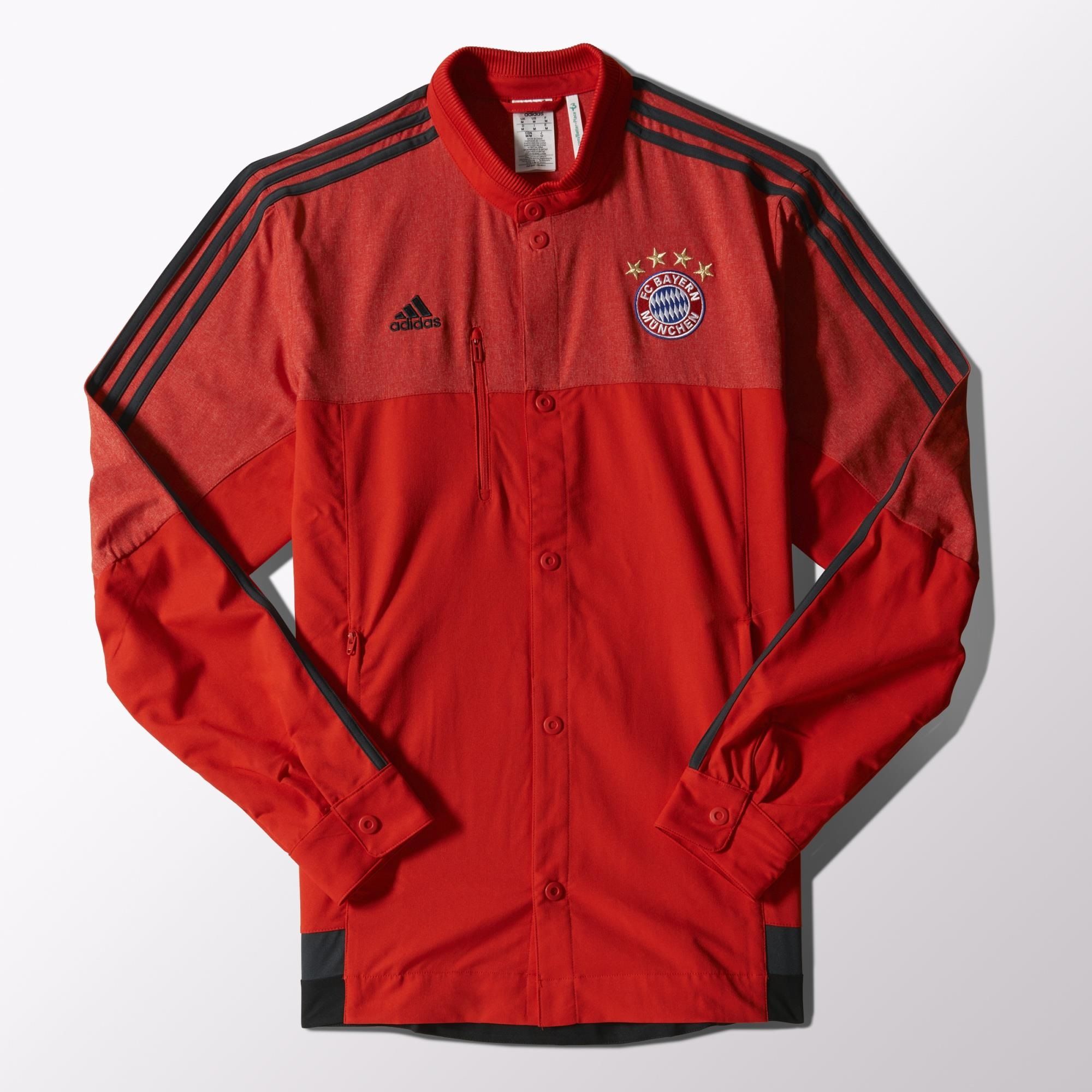 This Adidas FC Bayern München Anthem Jacket is just like the one they wear before every match. Showing off the proud team badge on the chest, it features a button front and zip pockets. Cut for a slim fit and made with recycled polyester.
