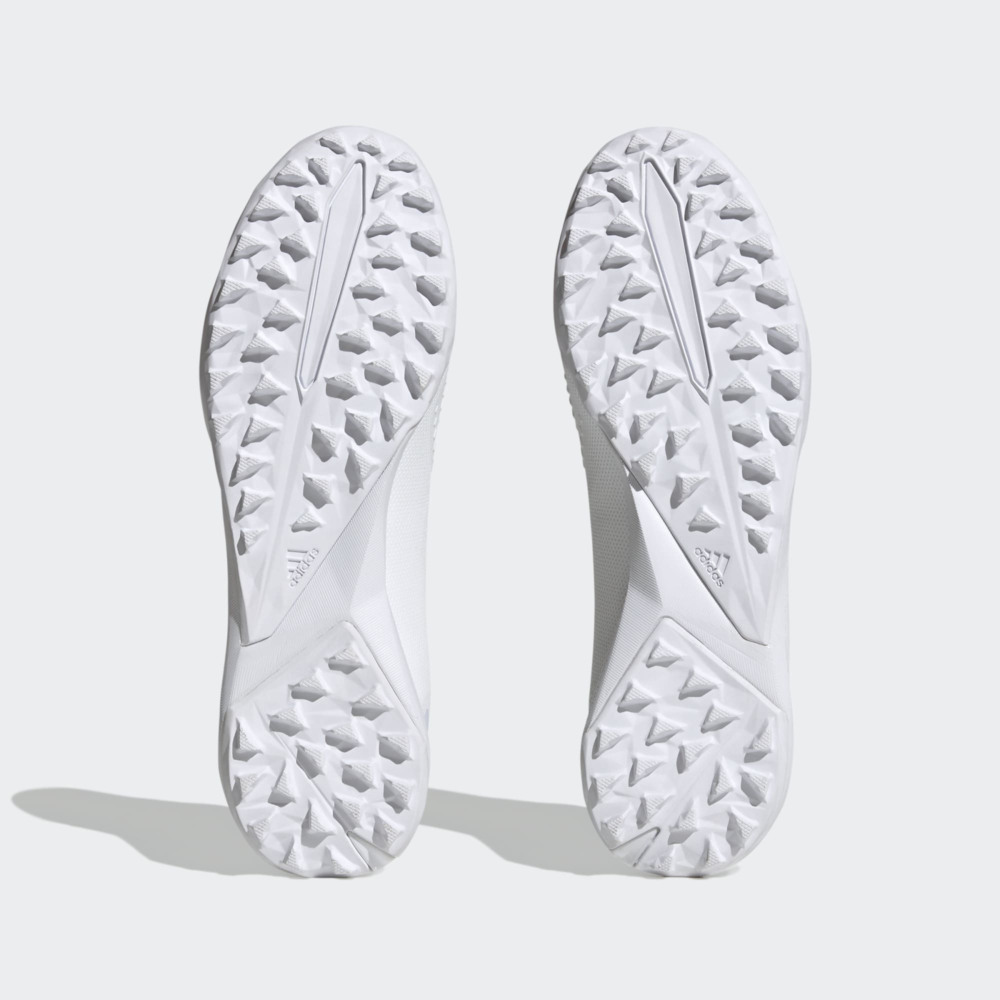 The lug rubber outsole provides stability on artificial turf surfaces, while the upper features at least 50% recycled content, contributing to adidas' efforts to reduce plastic waste.