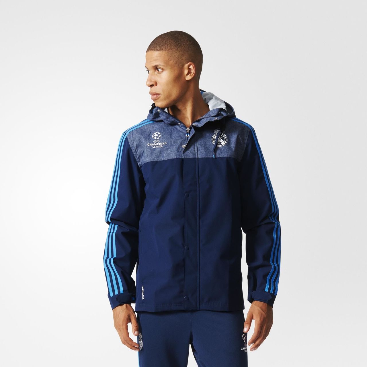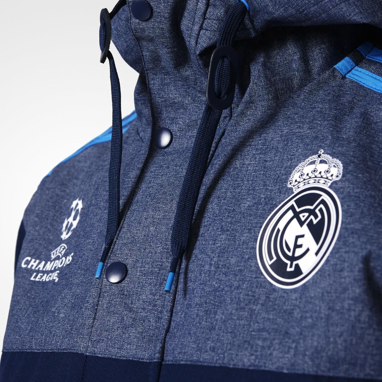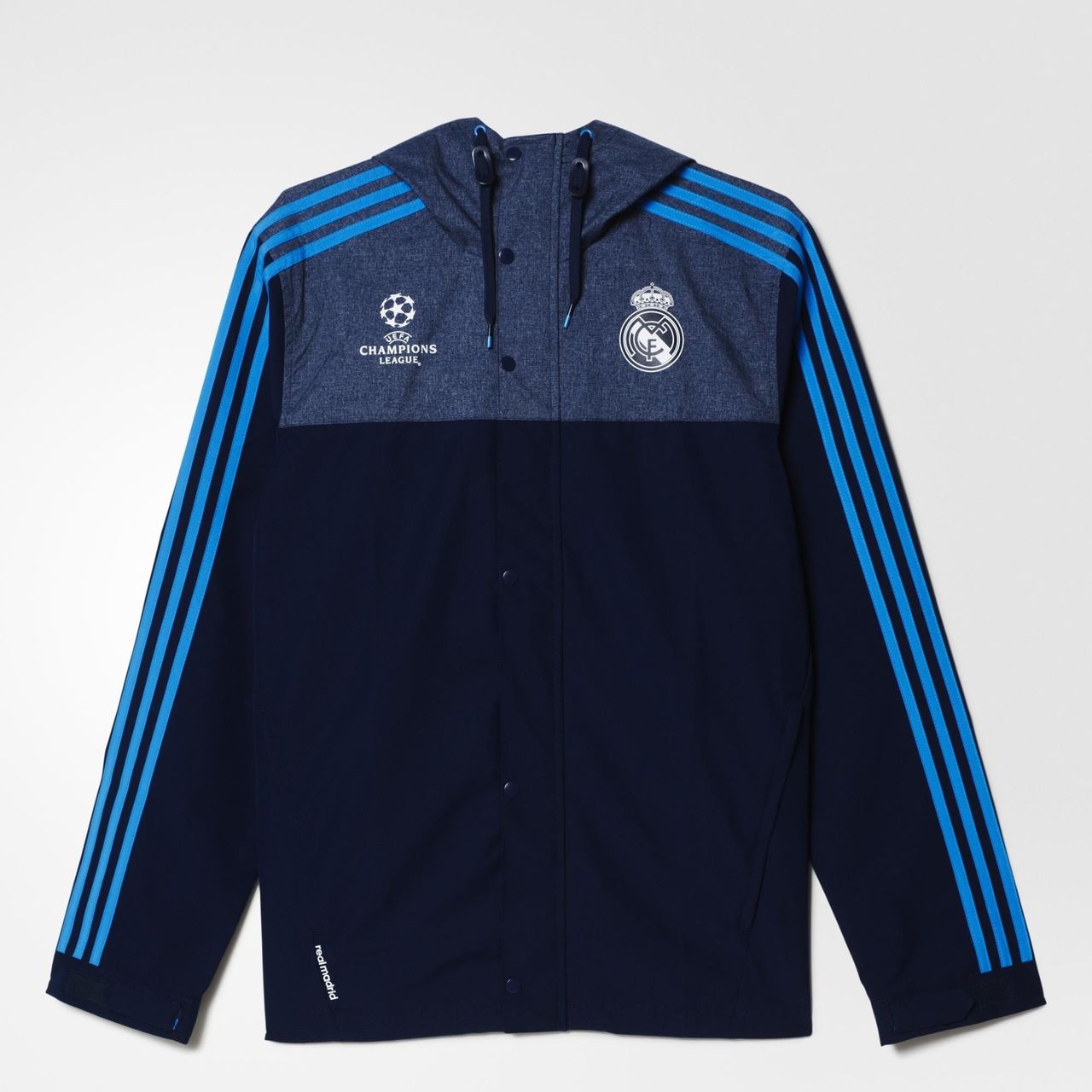 This is the 15/16 Adidas Real Madrid UCL All-Weather Jacket. Showing off their football team badge and a tournament logo, it features a storm flap and straps on the cuffs.