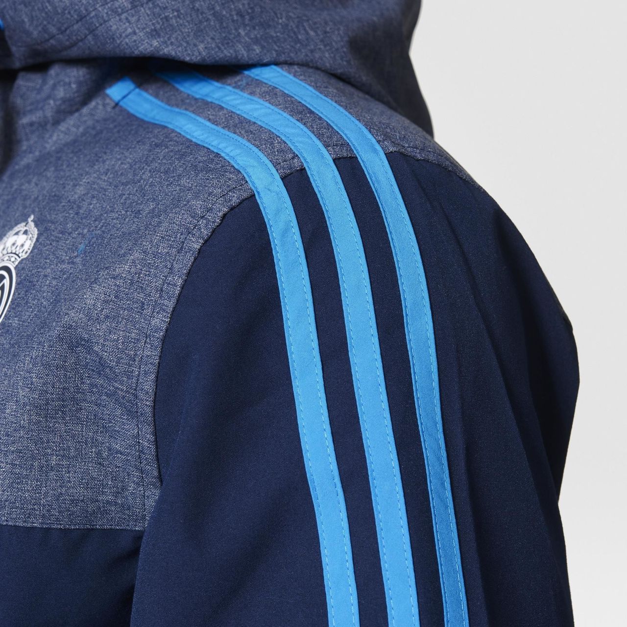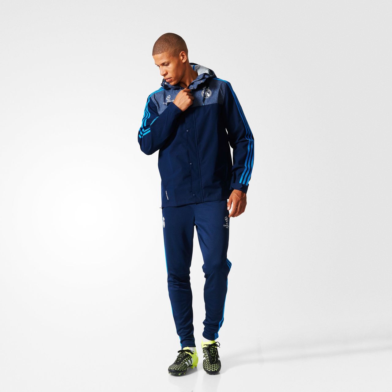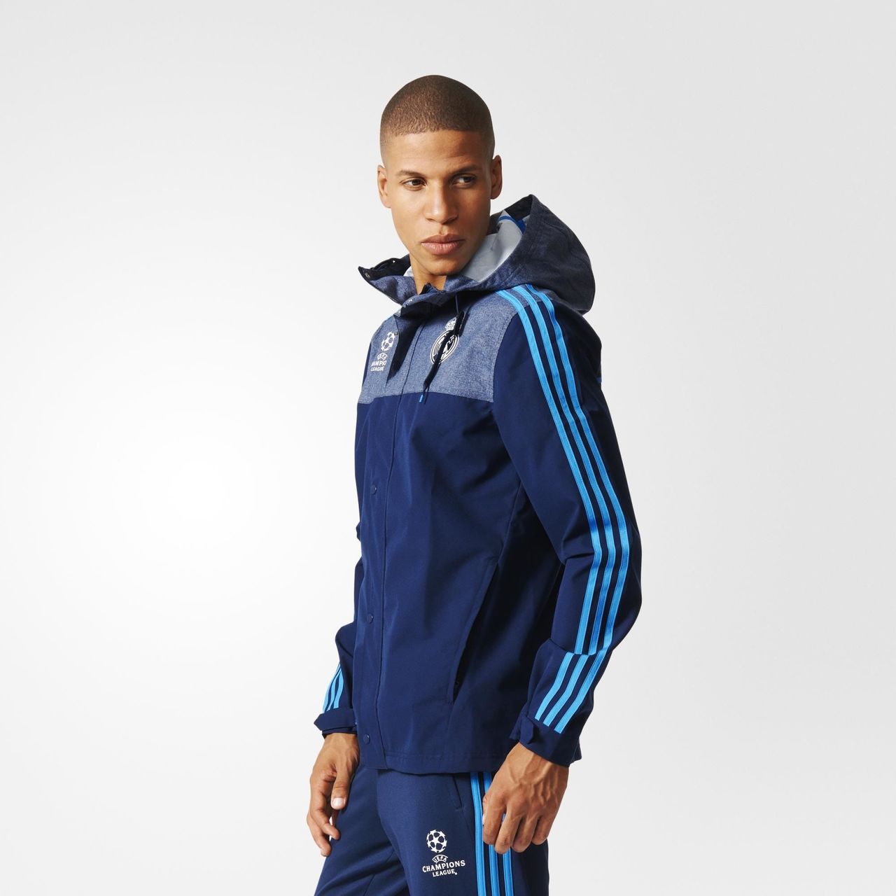 This is the 15/16 Adidas Real Madrid UCL All-Weather Jacket. Showing off their football team badge and a tournament logo, it features a storm flap and straps on the cuffs.