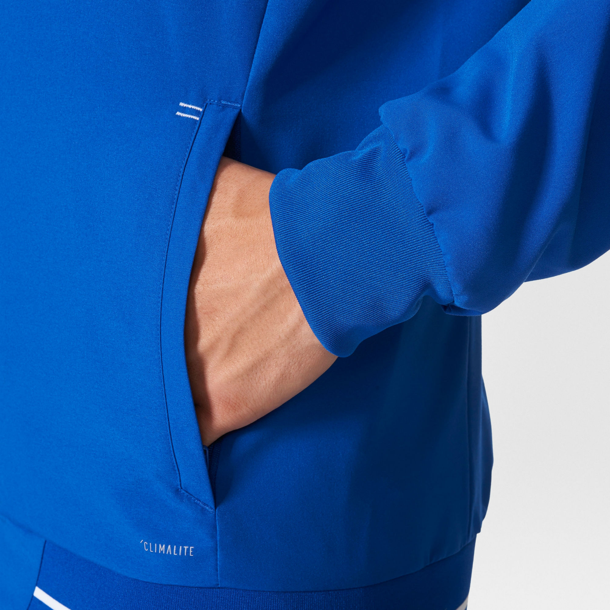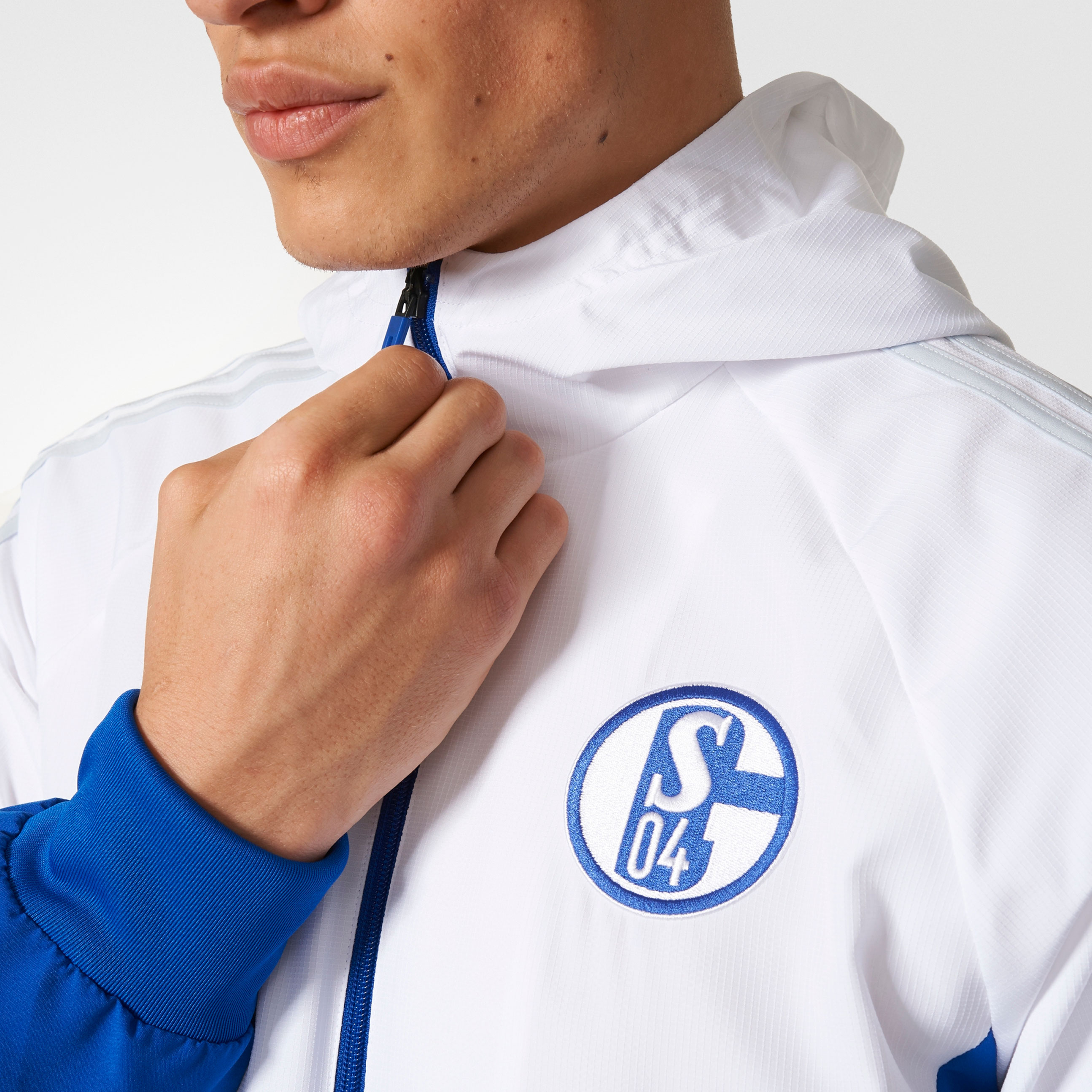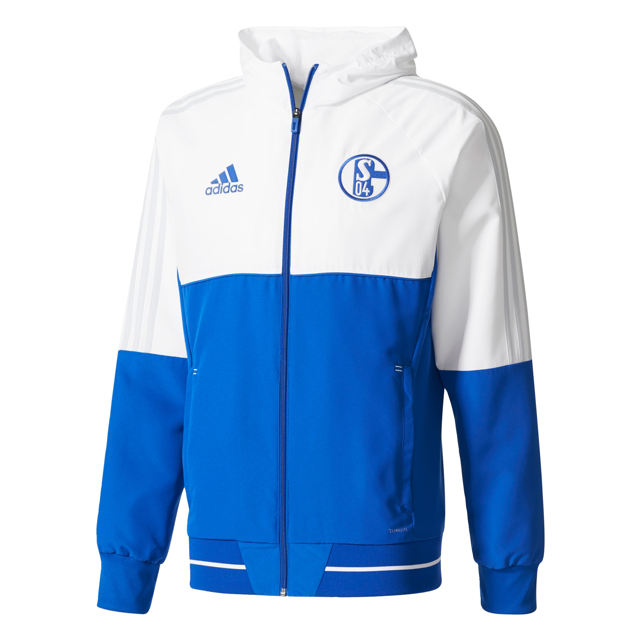 The Adidas 17/18 Schalke 04 Training Presentation Jacket features a classic royal blue and white two-tone design with the Schalke 04 club crest printed on the chest.