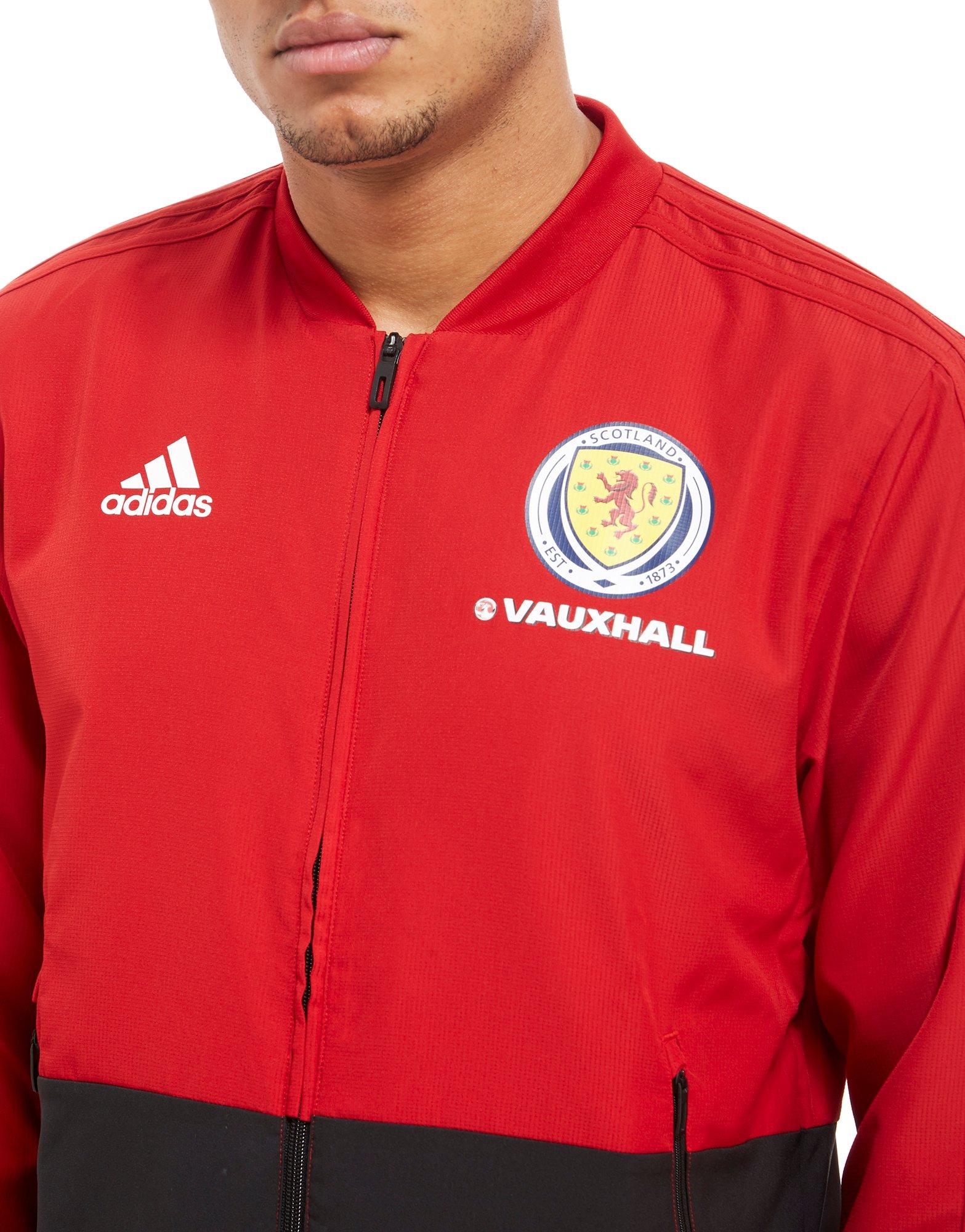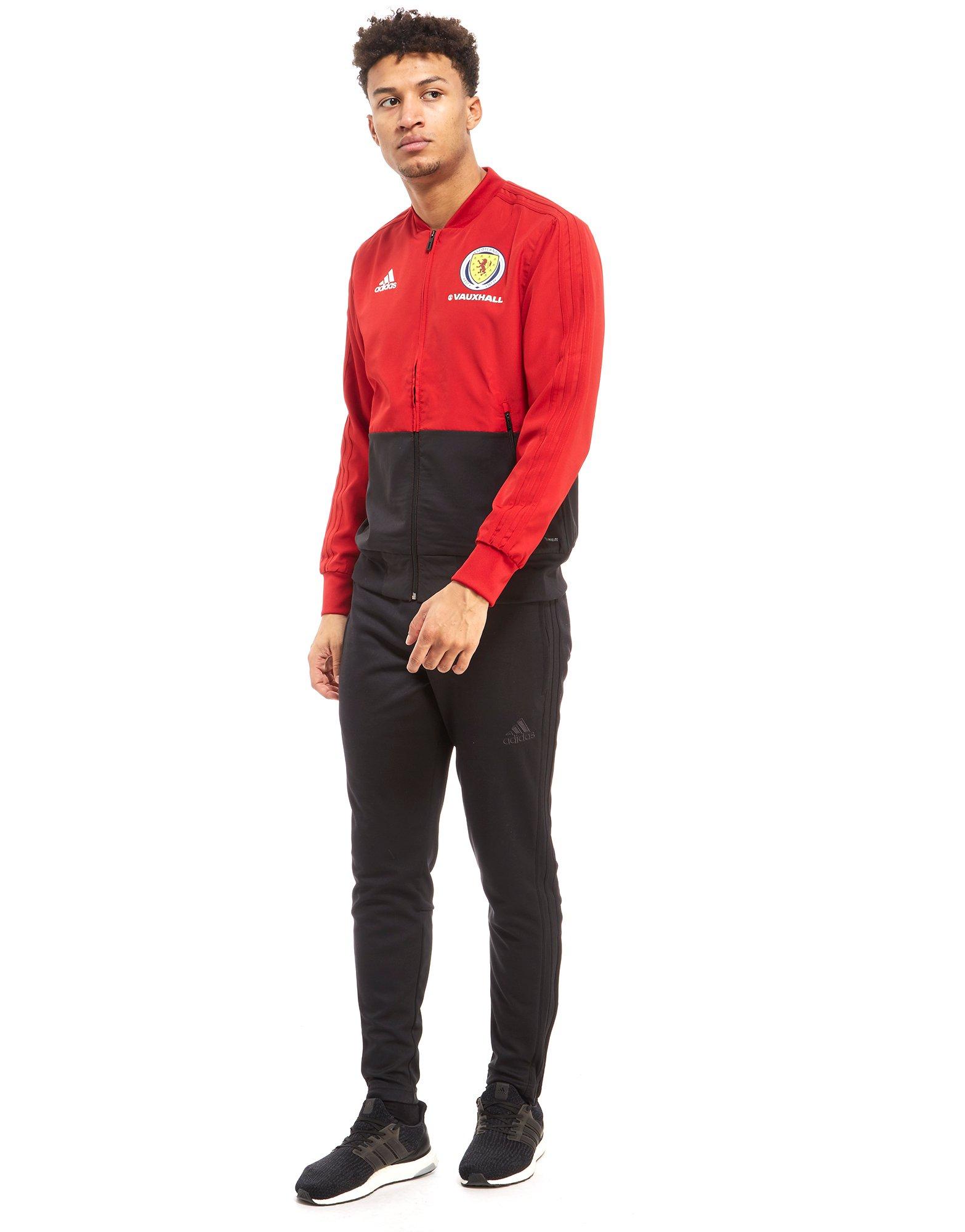 In a red colourway, the Adidas Scotland FA 2018 Presentation Jacket is built from durable fabric, which keeps you feeling cool and comfortable, and features a full zip fastening, funnel neckline and ribbed trims for a snug fit.