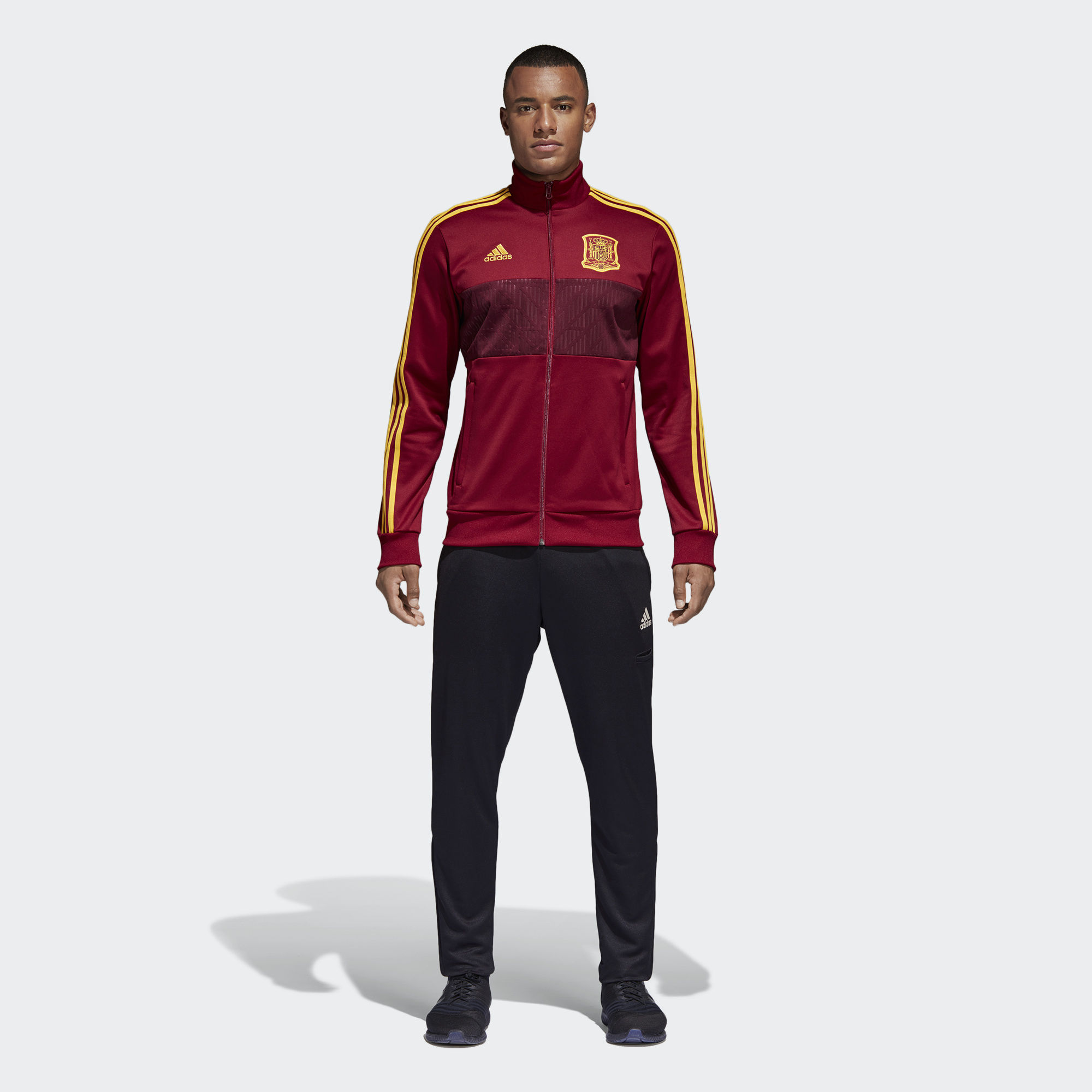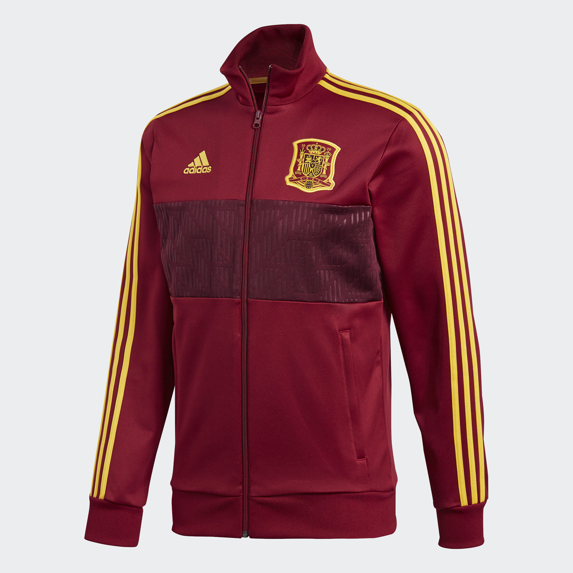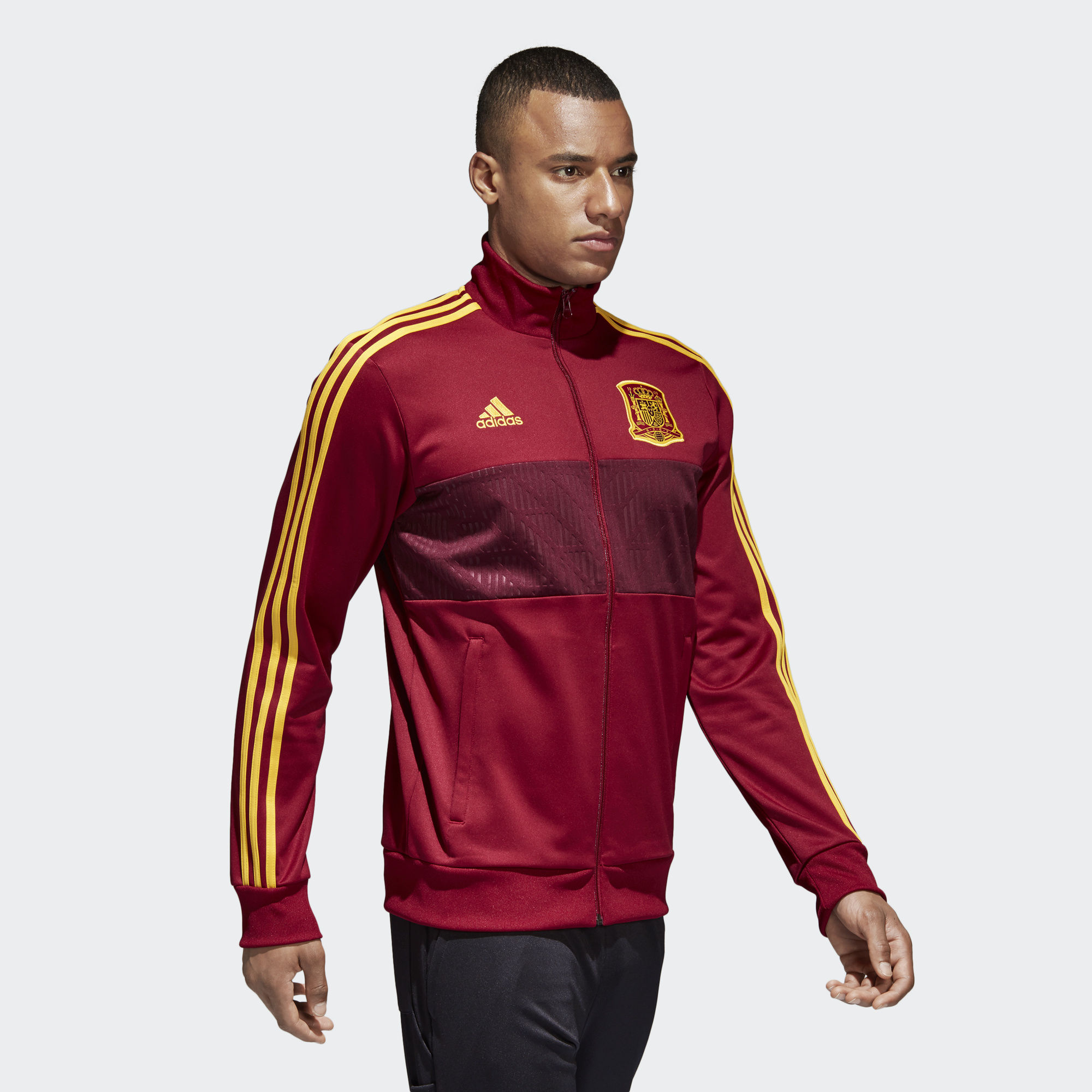 This Adidas Spain 3-stripes Track Jacket with a graphic front panel, back neck tape and zip pockets carries the Furia Roja crest with pride and is flanked by synonymous adidas branding, including the iconic Badge of Sport.