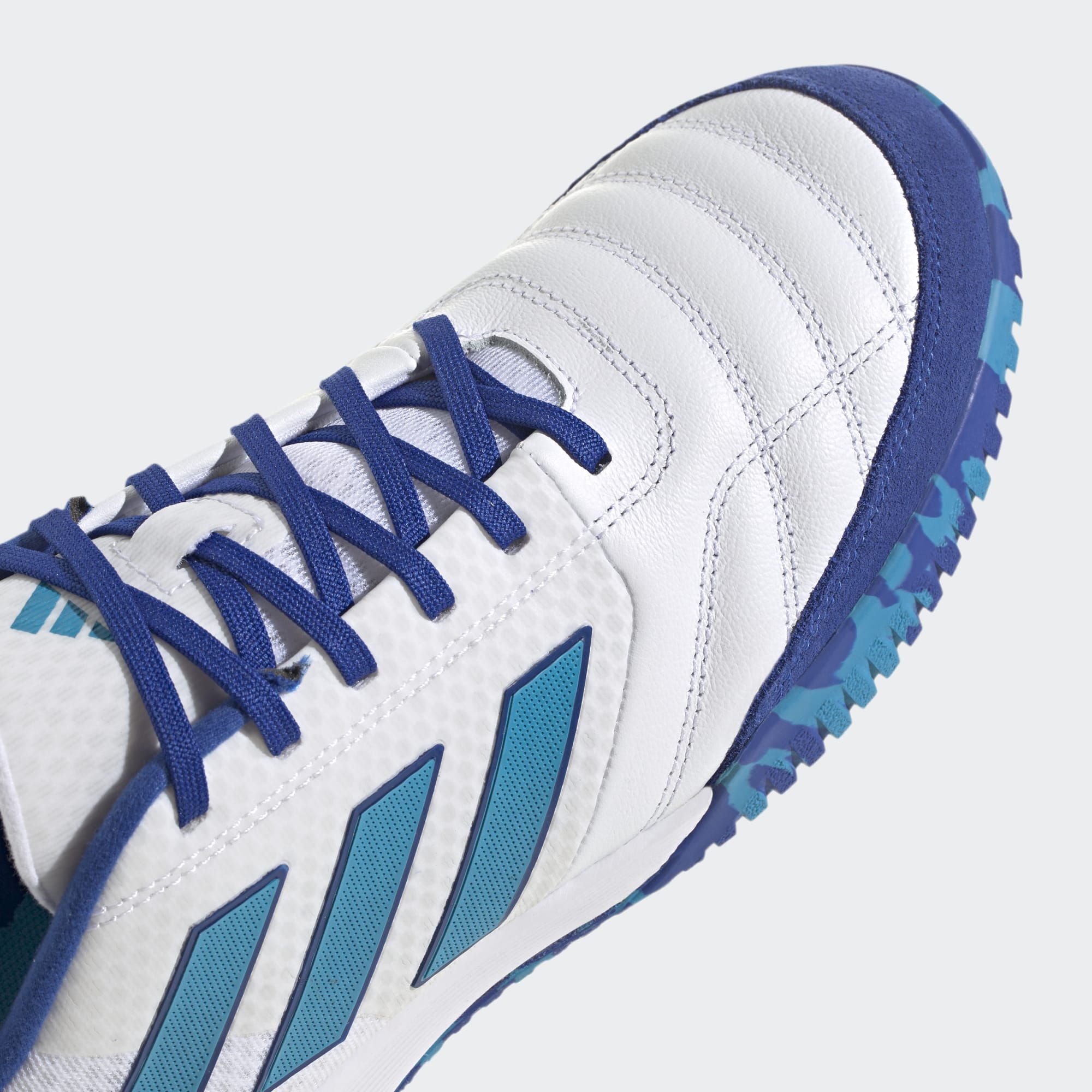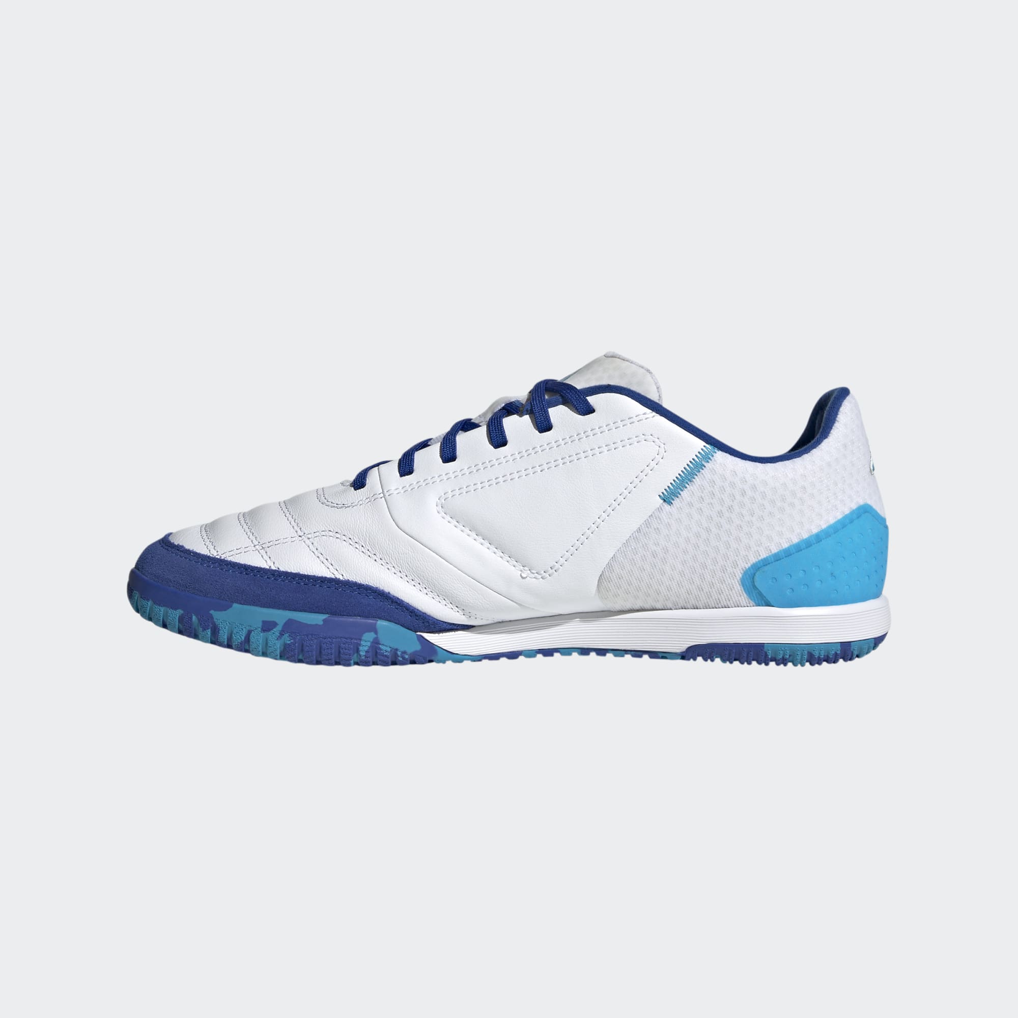 These adidas Top Sala Competition IN shoes in Cloud White/Bold Aqua/Royal Blue are optimized for indoor play and enhance skills in fast-paced futsal games.