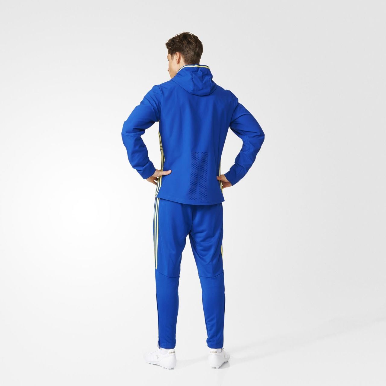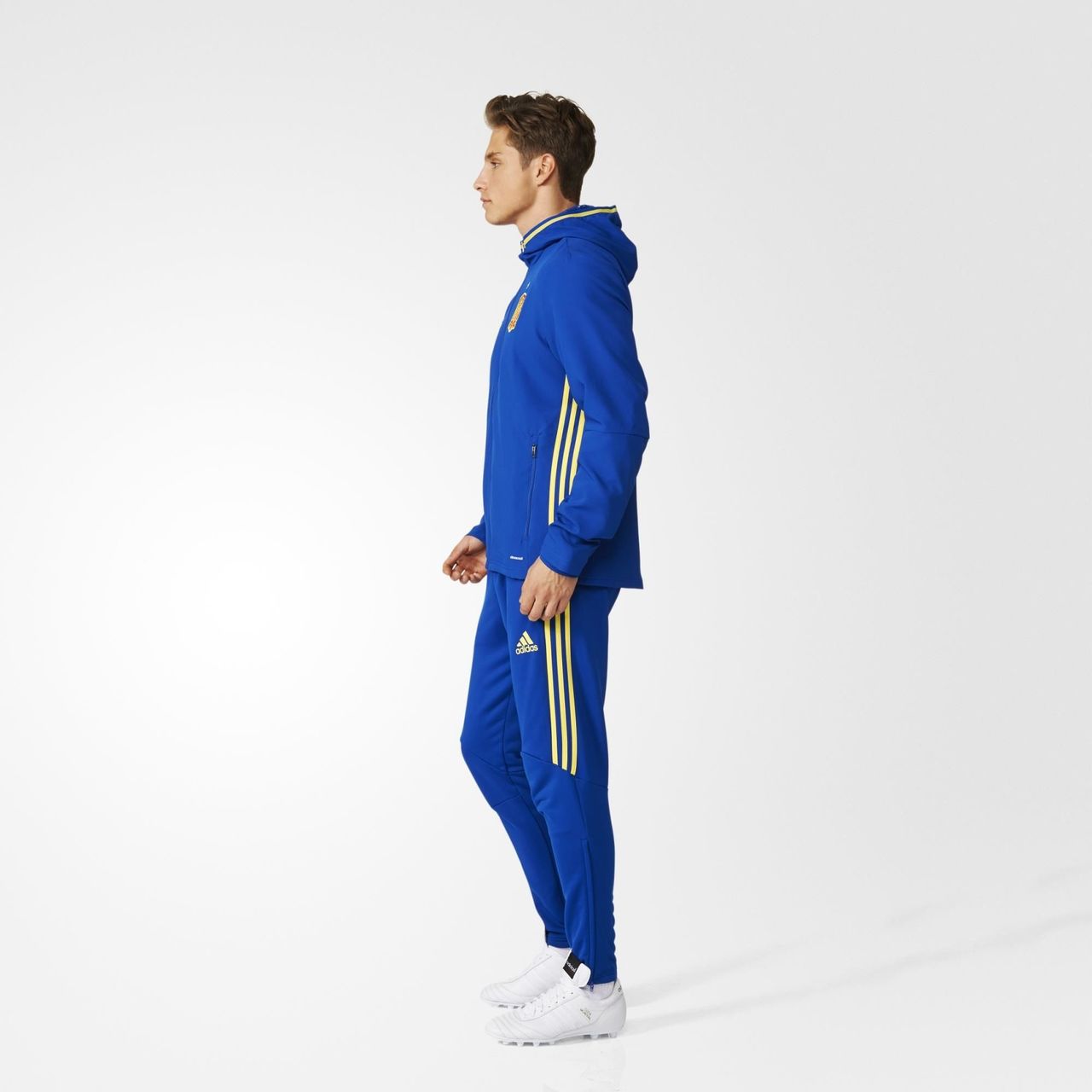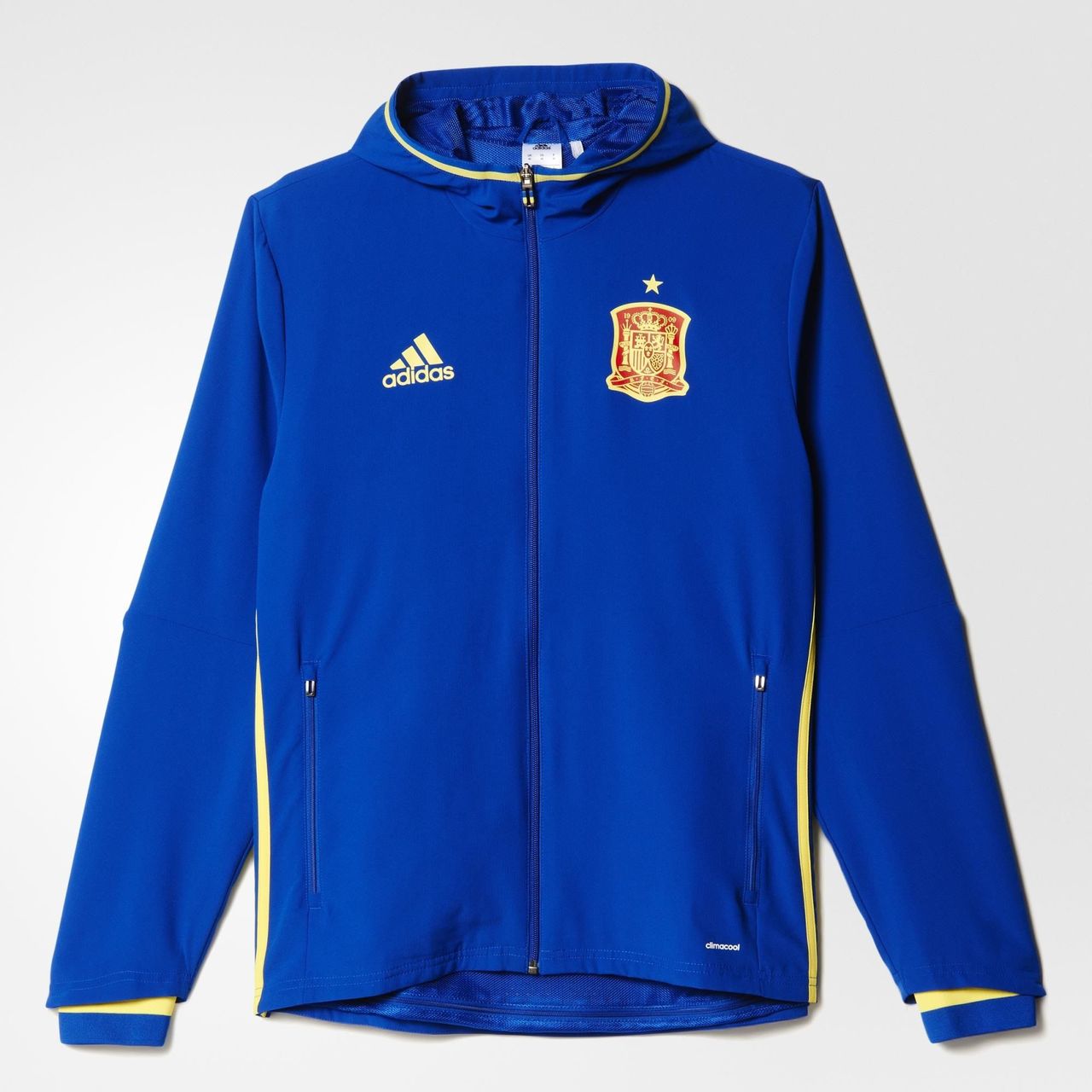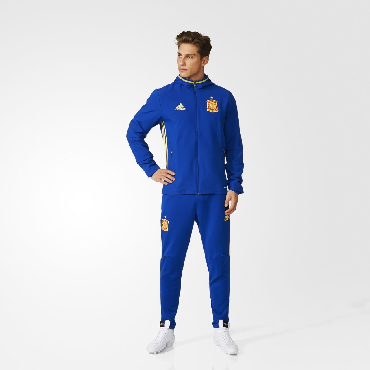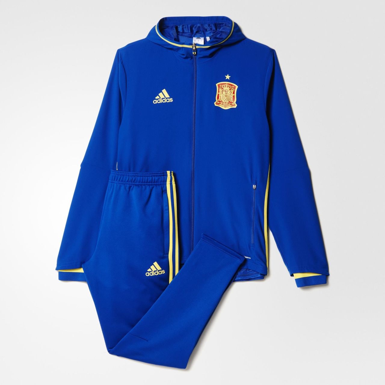 It's the presentation suit worn by the team for travel and entering the pitch as they seek victory at UEFA EURO 2016. The matching pants and jacket are mesh lined and made with ventilated climacool® to keep you cool through all of the action. Both pieces show off the Spanish Football Federation badge. Ankle zips give you on-and-off convenience.
