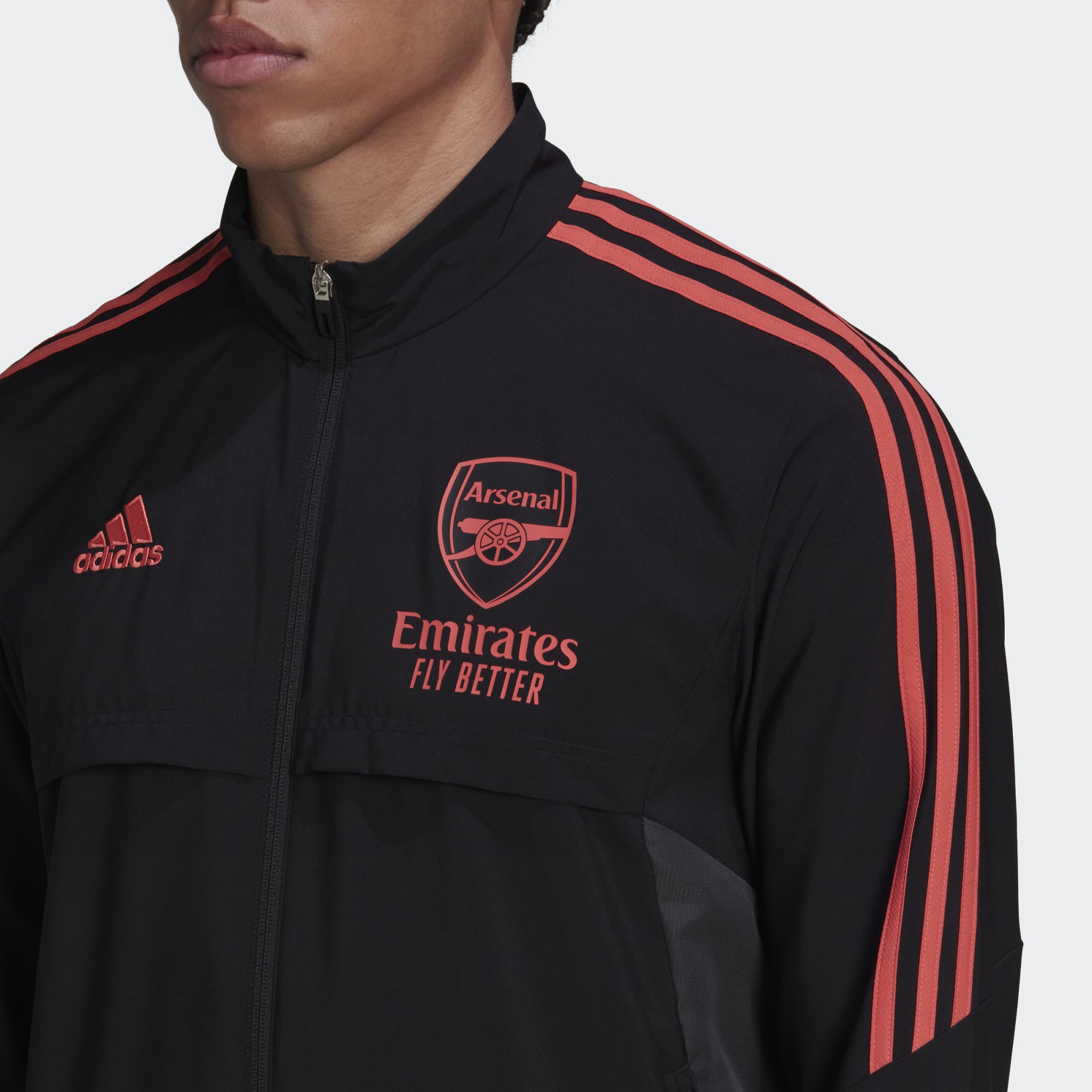 Arsenal players pull on this adidas football jacket when there are big matches on the horizon. Detailed in pink colours borrowed from the North London club's vibrant third kit, an embroidered badge shows their unity when they're in front of the cameras.