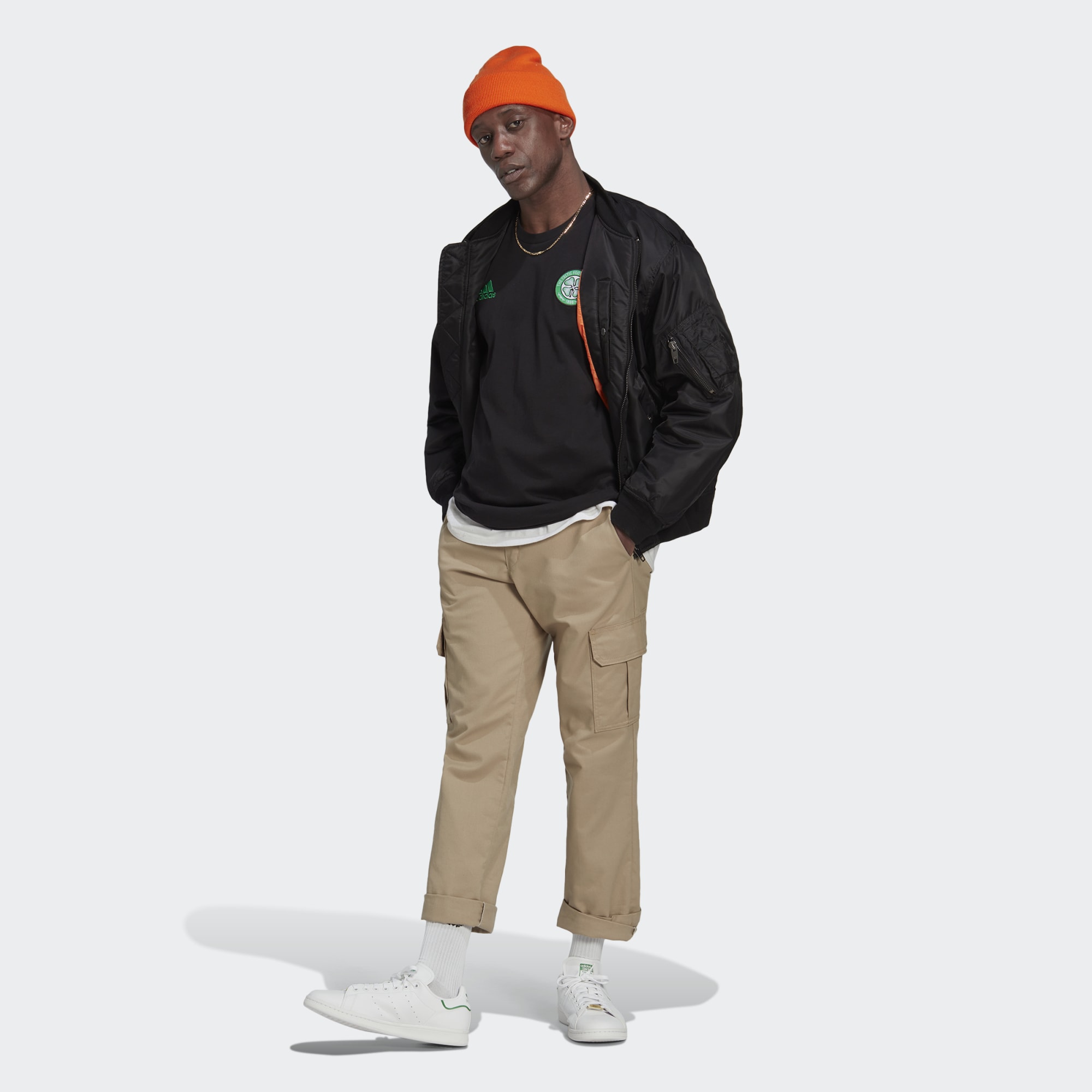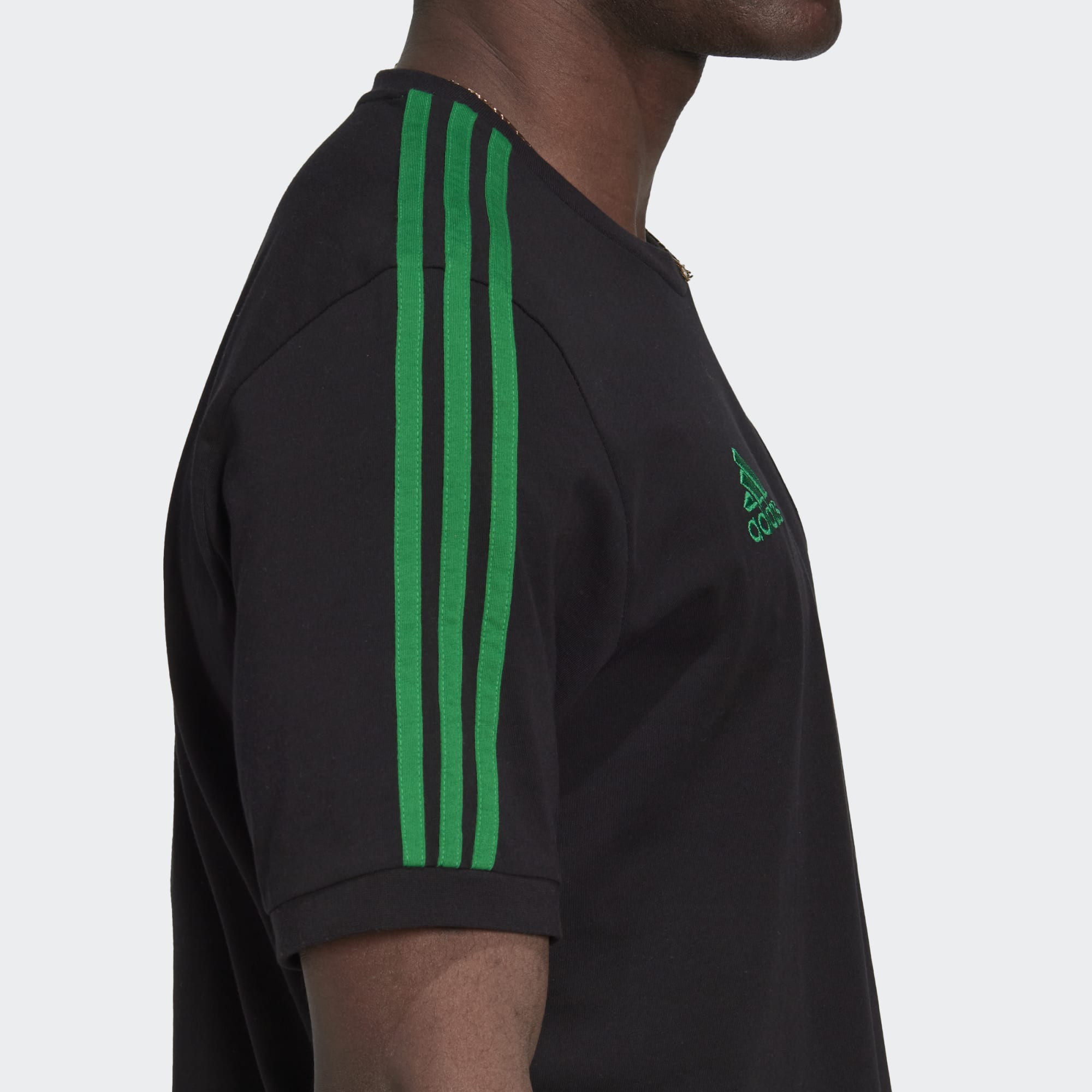 Green details and a woven version of the club's famous crest stand out from the black base of this adidas Celtic FC DNA 3-Stripes T-Shirt.