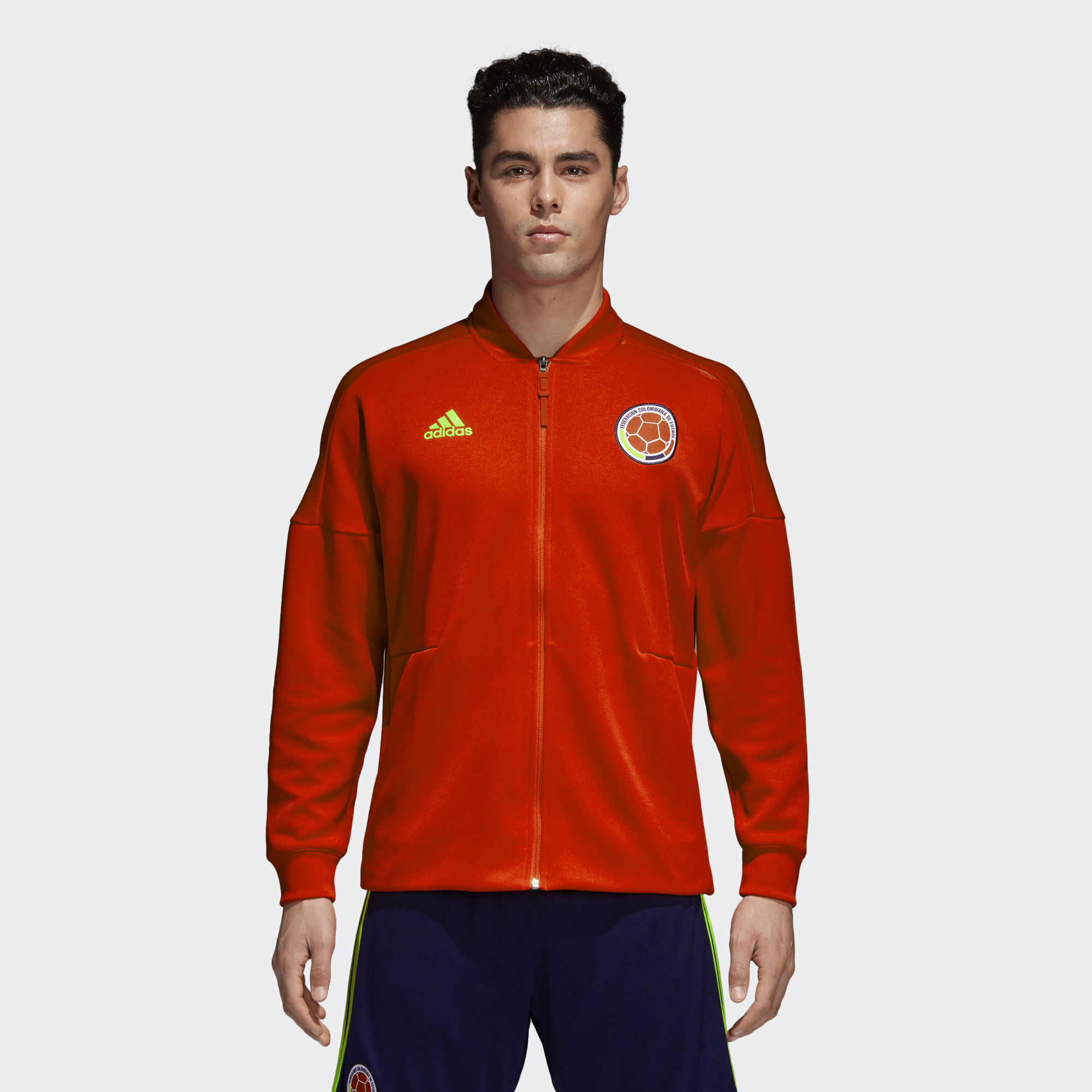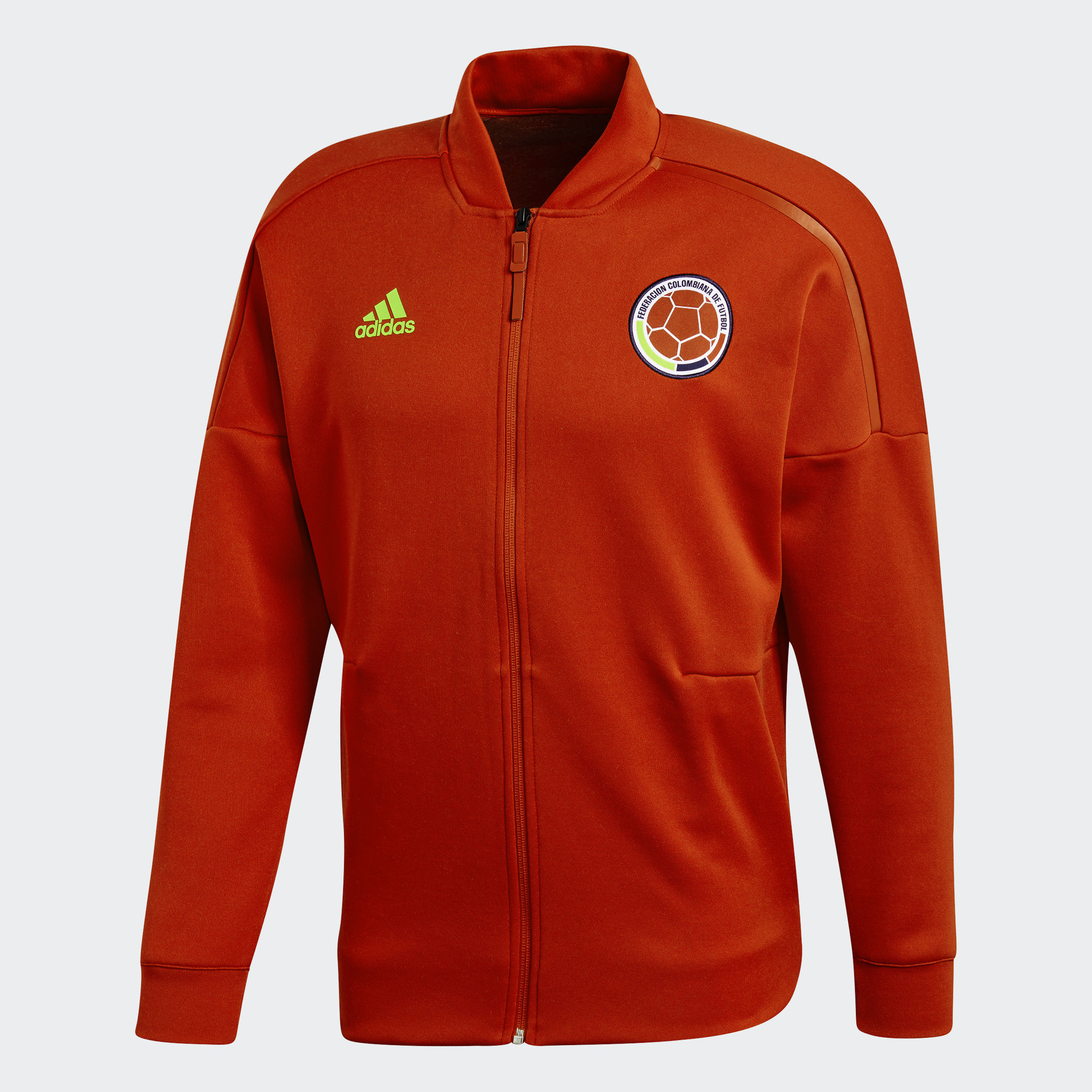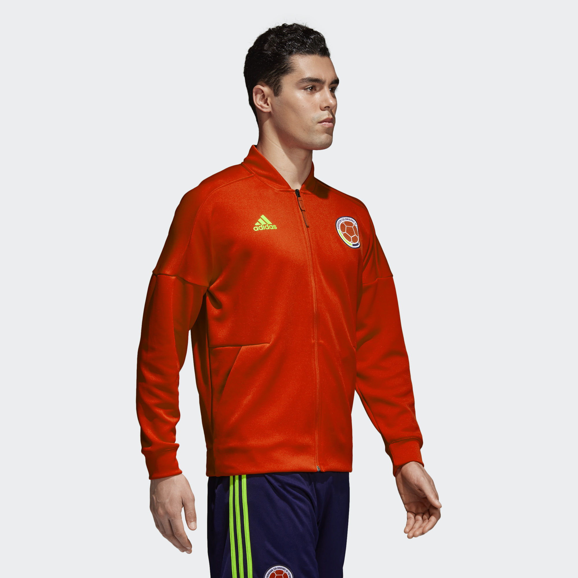 This Colombia 2018 Adidas Z.N.E. Jacket is made in Colombia's national colours and has both a printed Colombia graphic and a woven crest.