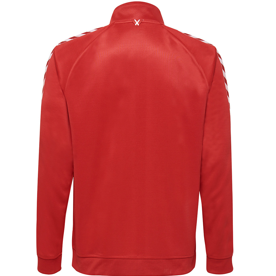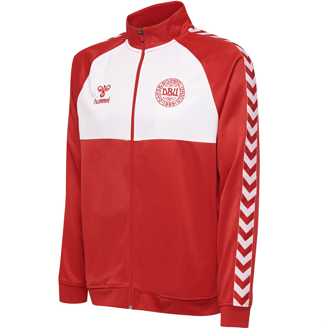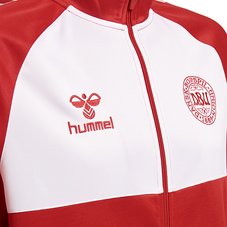 The Denmark track jacket from DFA’s fan collection features Hummel's iconic chevrons on the sleeves in red and white, as well as embroidered DFA and hummel logos in the front.
