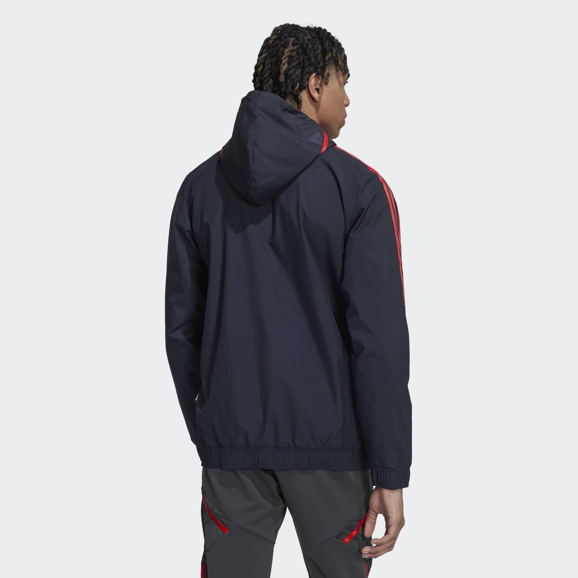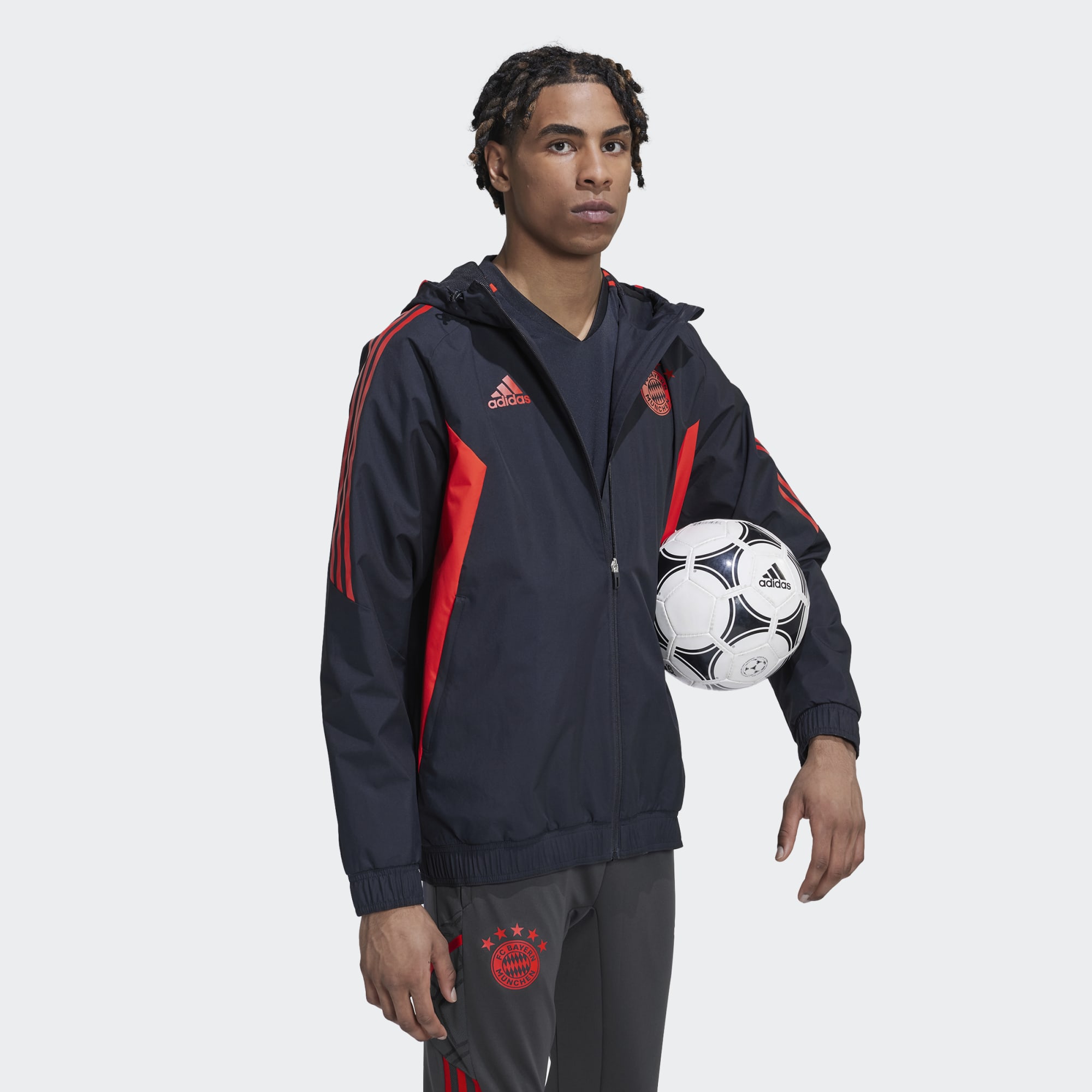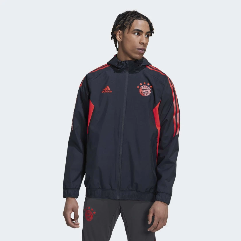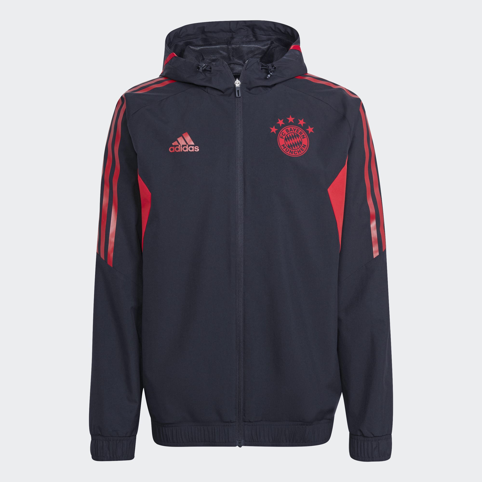This adidas FC Bayern Condivo 22 All-Weather Jacket combines a tough woven shell, water-repellent exterior and lined hood while also being light and comfortable enough to wear on the pitch. A printed badge finishes the look in football style.