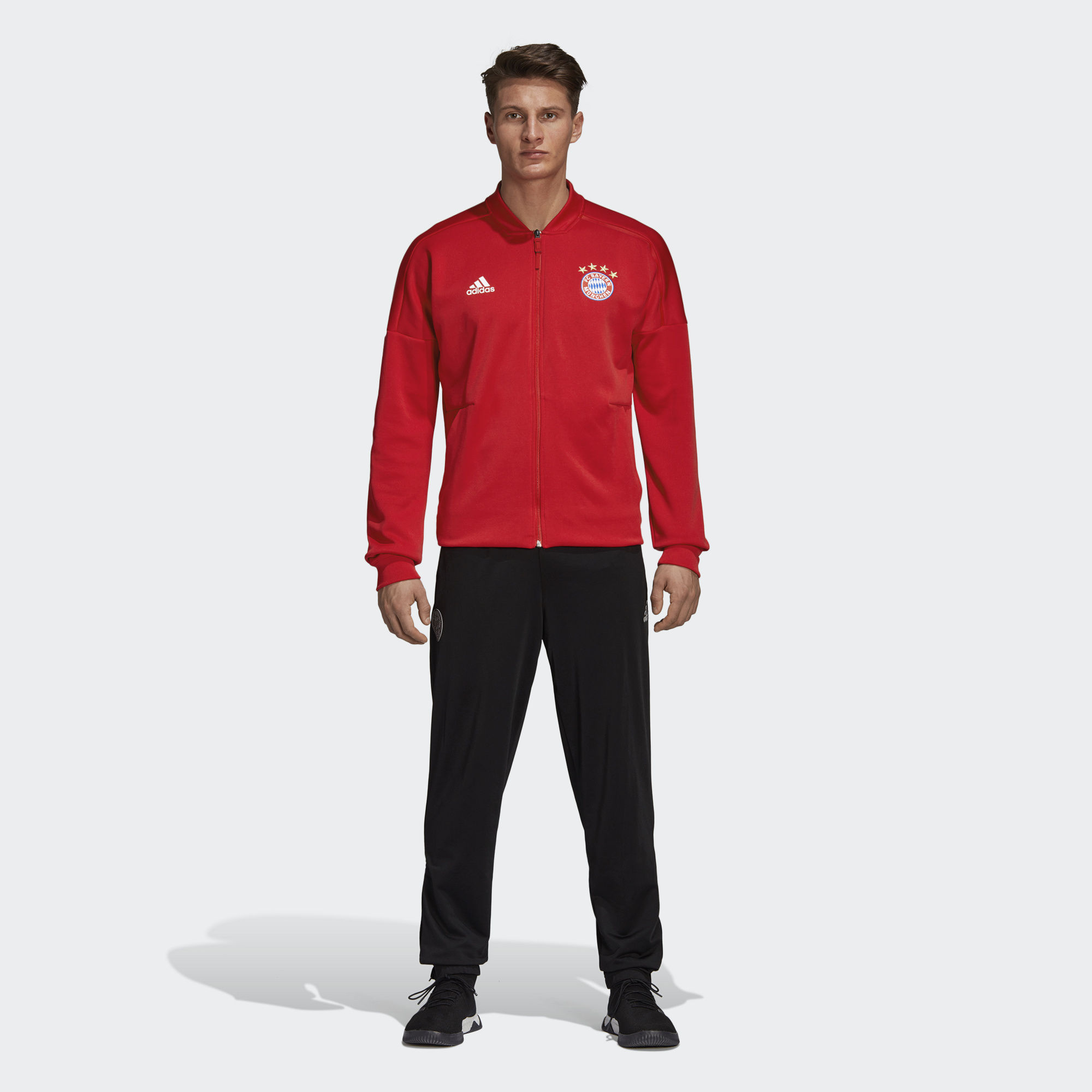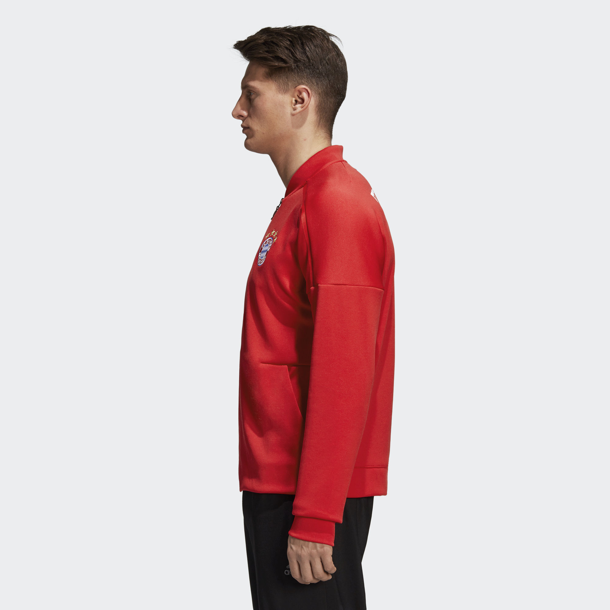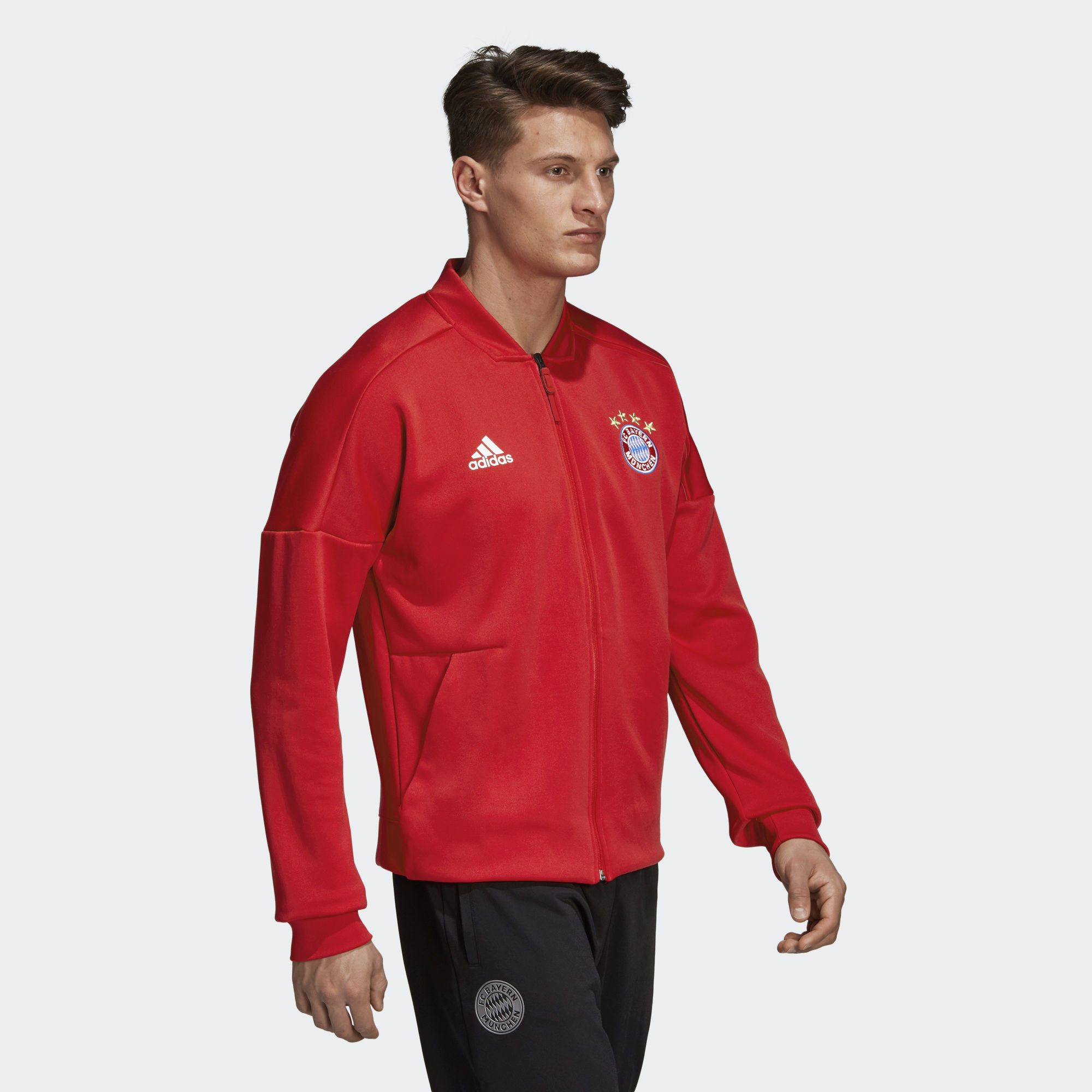 The adidas Z.N.E. collection was designed to keep athletes comfortable in the moments before competition. This Bayern München anthem jacket is made of smooth fabric that fits wider at the body. It's the same one players wear as they emerge from the tunnel and step into the spotlight