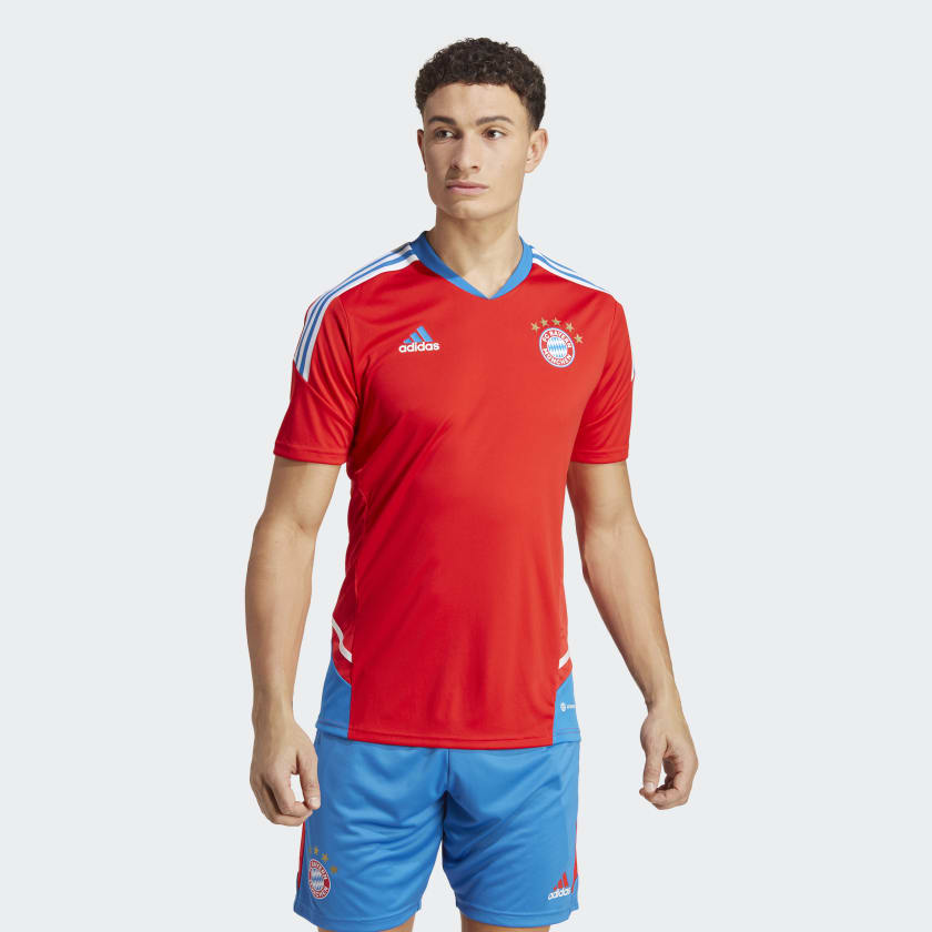 This FC Bayern Condivo 22 Training Jersey in Red / Bright Royal combines lightweight heat-transfer details with moisture-wicking AEROREADY to encourage lightning-quick play.