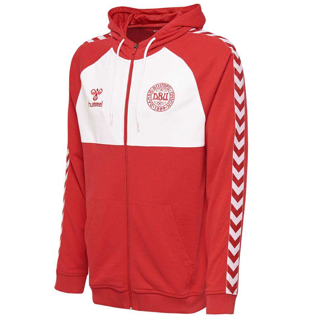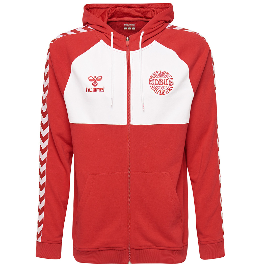 The zip-up hoodie has a front pouch. The red version features red/white colour blocking in the front; two strongly contrasting colours which clearly signify the national colours of the small but proud football nation of Denmark.