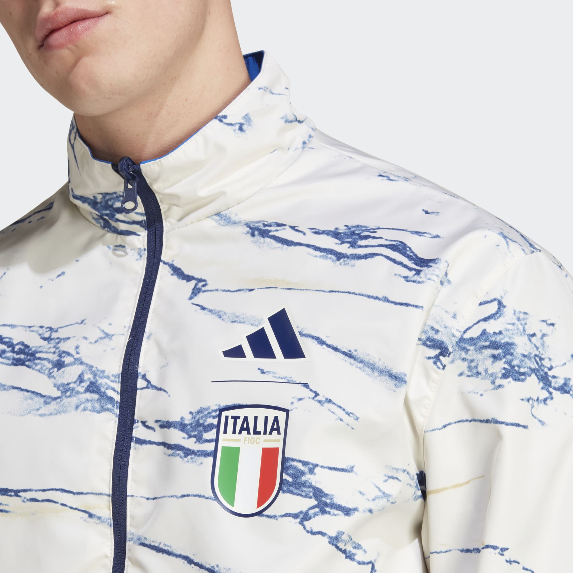 The top Italy national team players zip up before games, this adidas Anthem jacket displays the team's classic blue colours on one side and an away jersey-inspired design on the other.