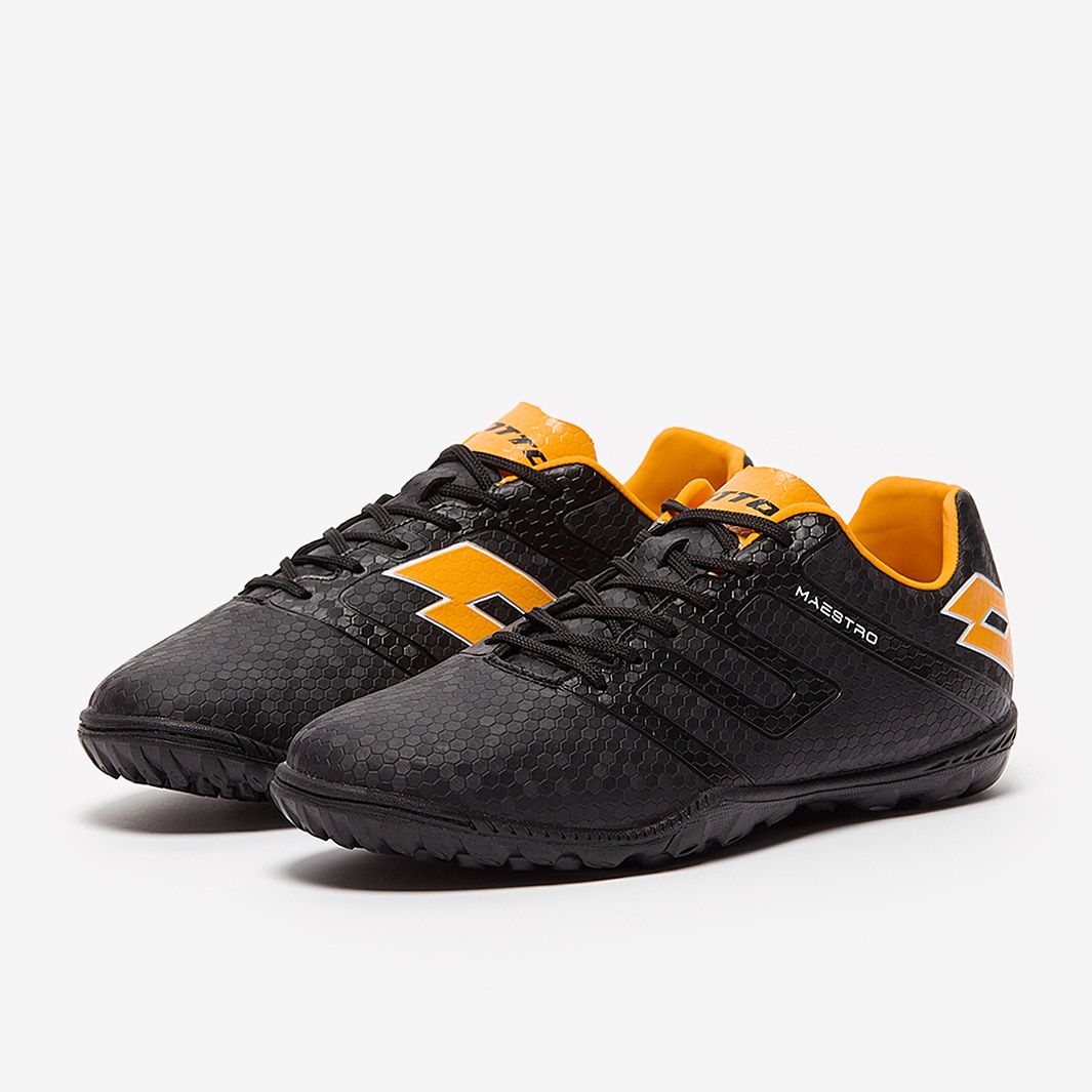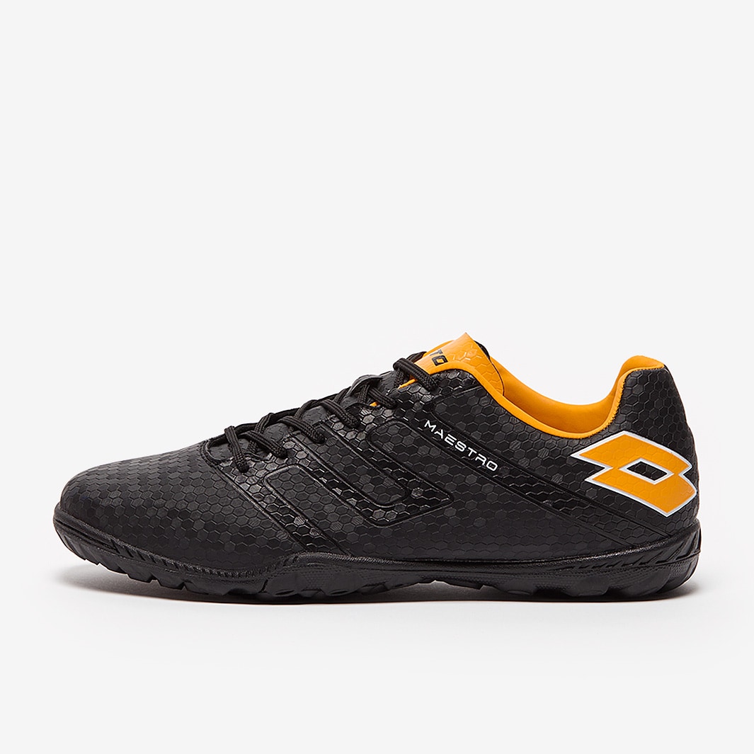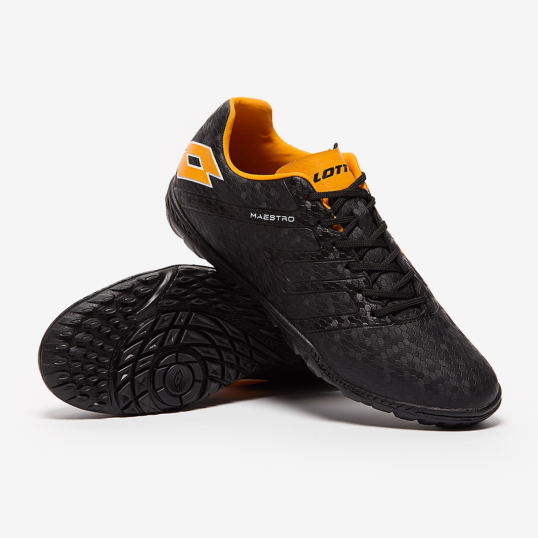 Control the game wearing Lotto Maestro 700 IV TF turf football shoes in All Black/Saffron, featuring a new outsole for superior traction on hard surfaces.