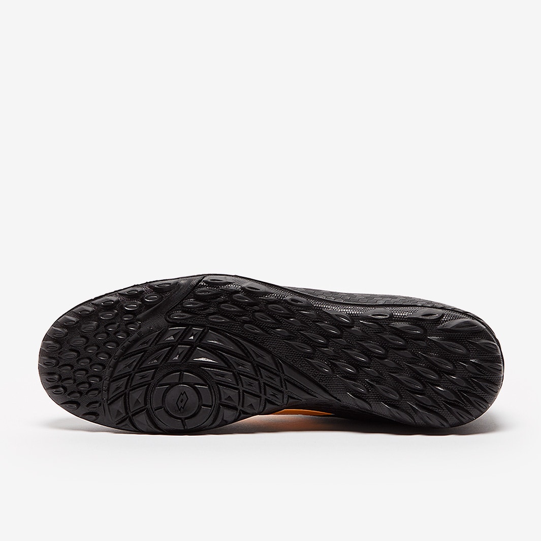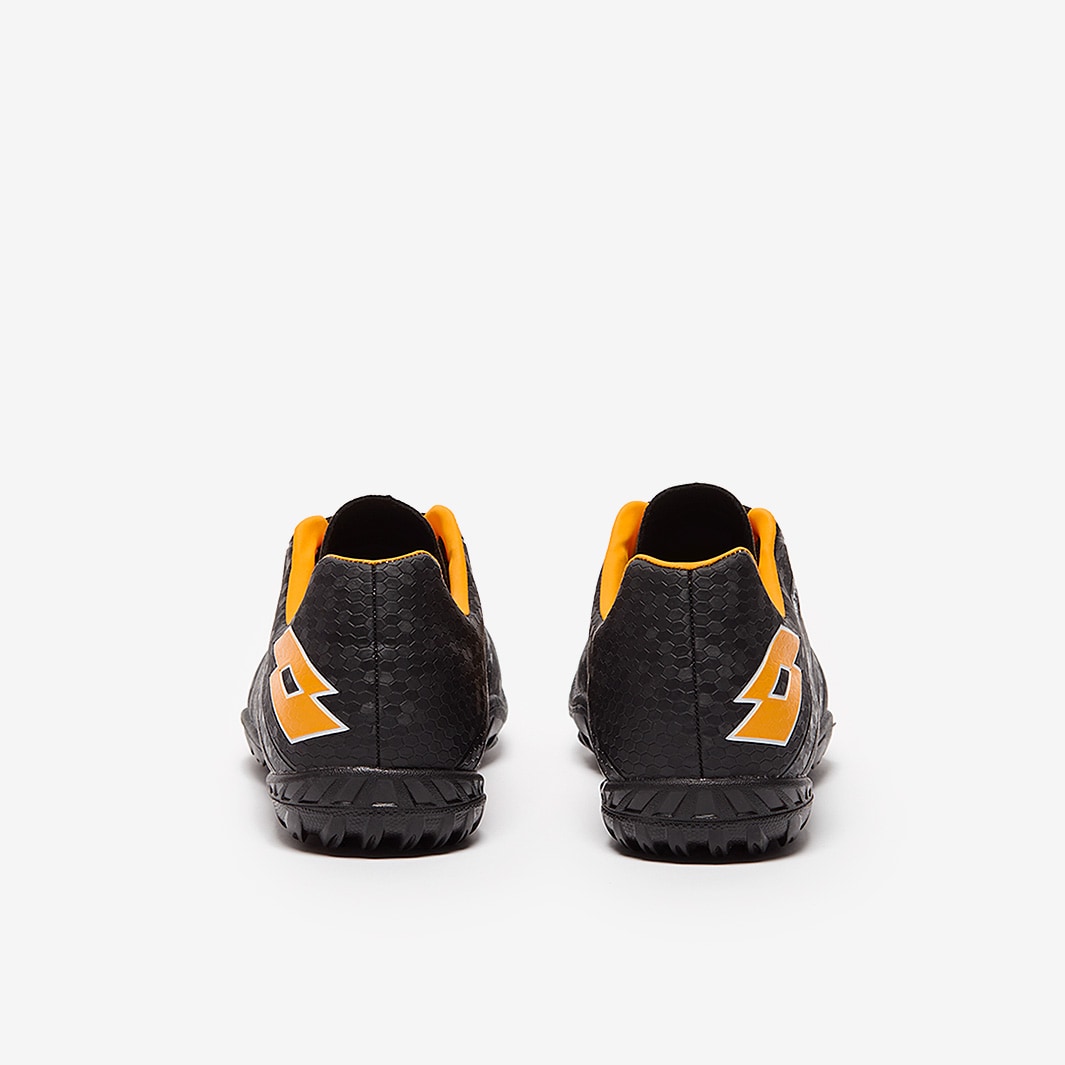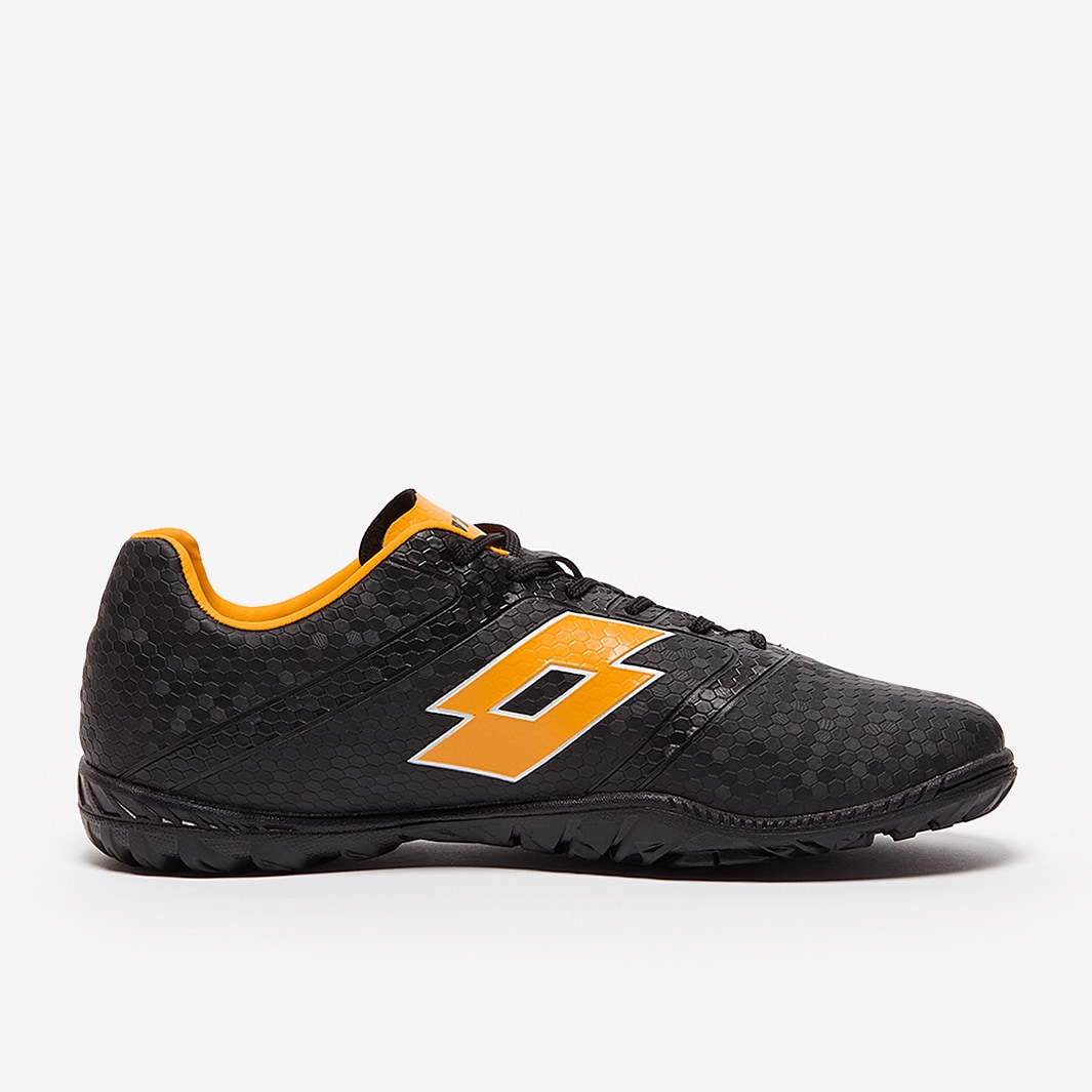 Control the game wearing Lotto Maestro 700 IV TF turf football shoes in All Black/Saffron, featuring a new outsole for superior traction on hard surfaces.