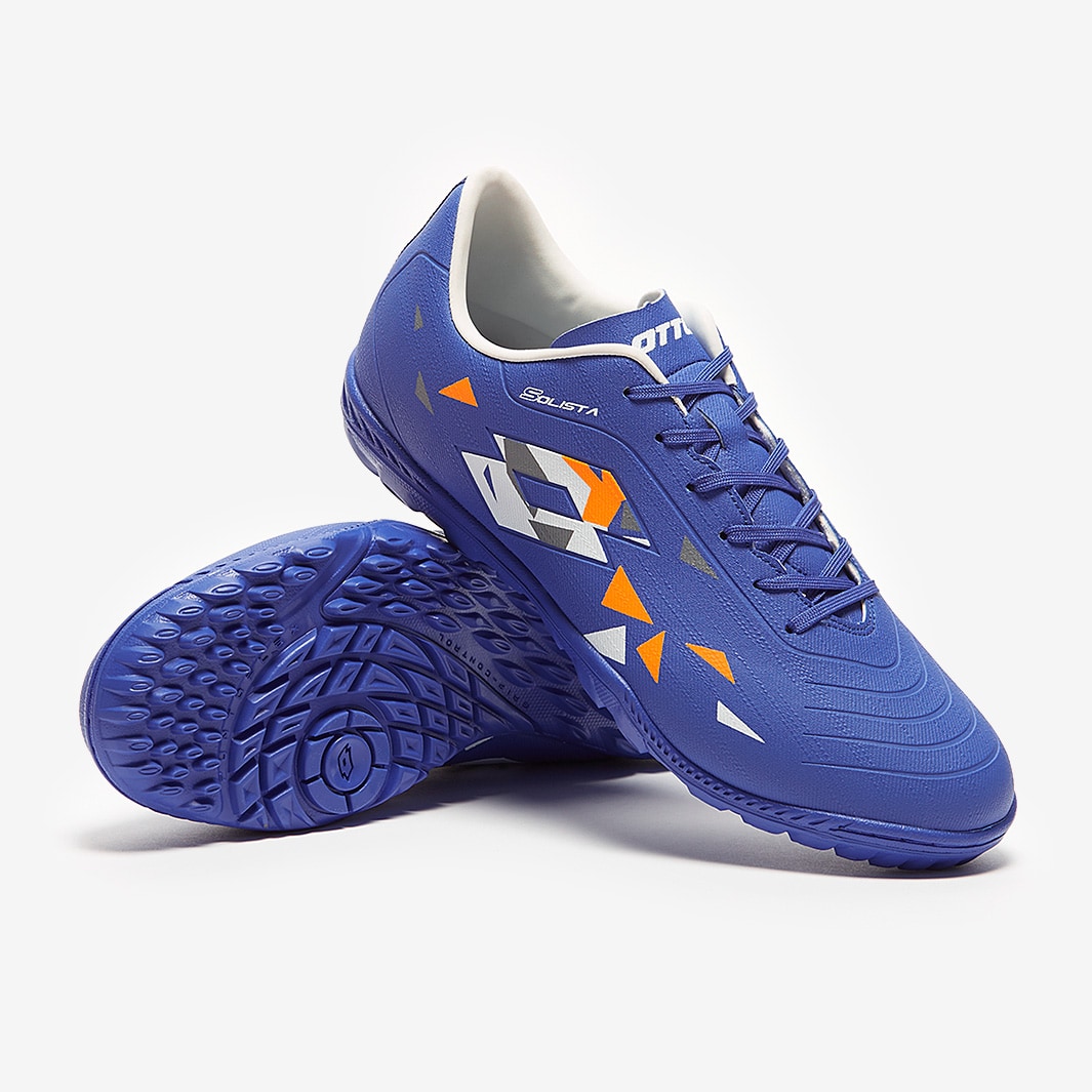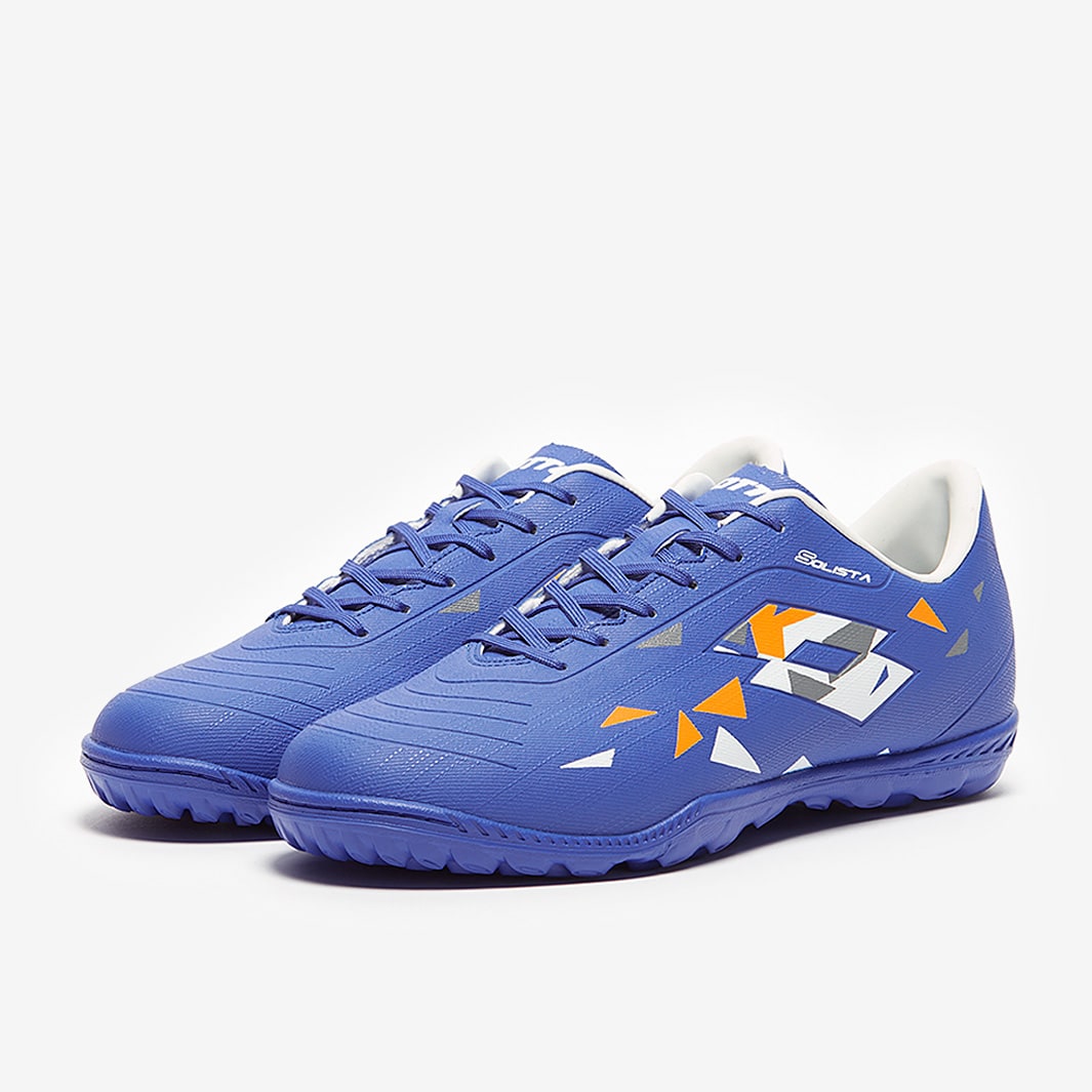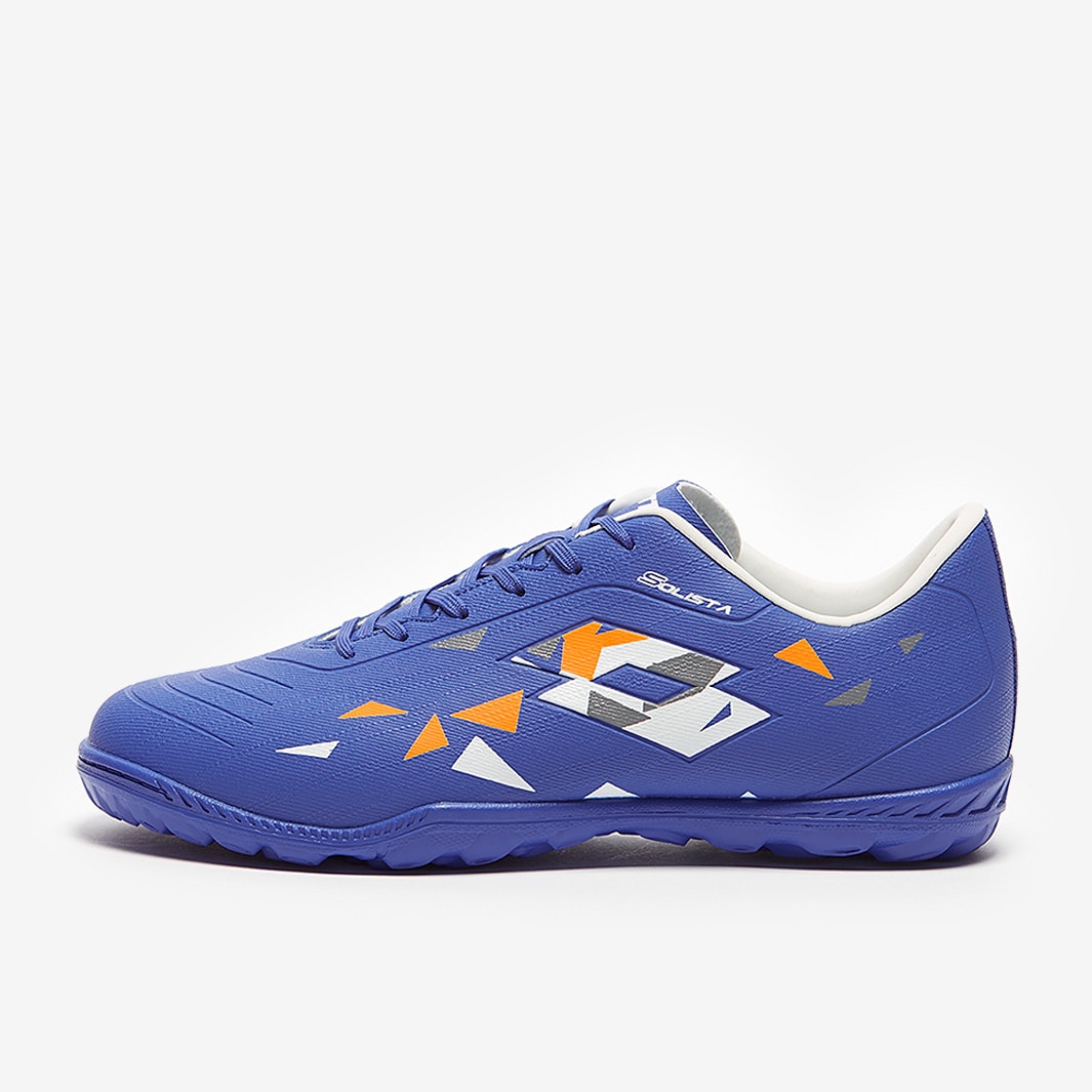 Lead the next generation of speed wearing Lotto Solista 700 V TF turf football shoes in Amparo Blue/All White/Orange Beat, designed to make the fastest players even faster.