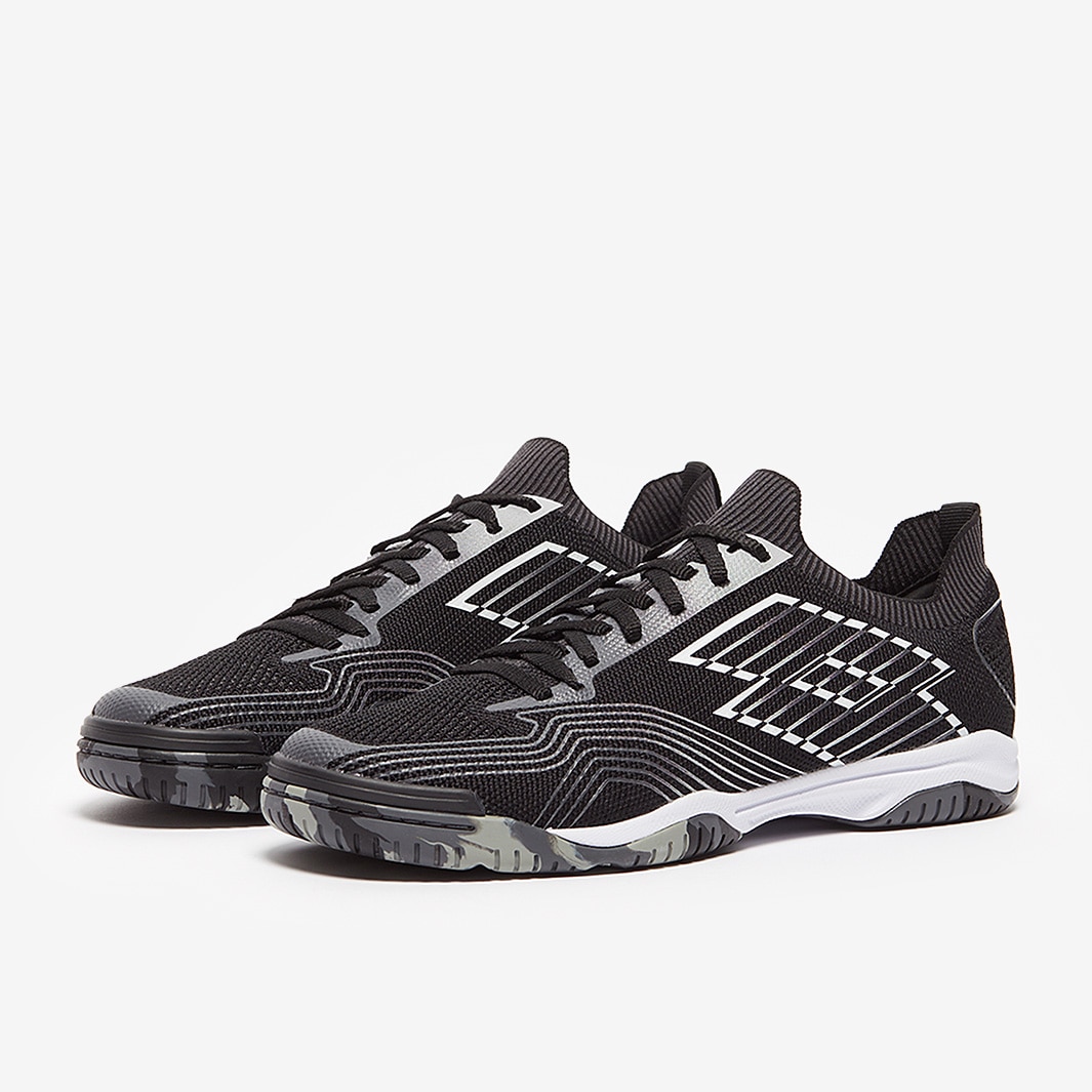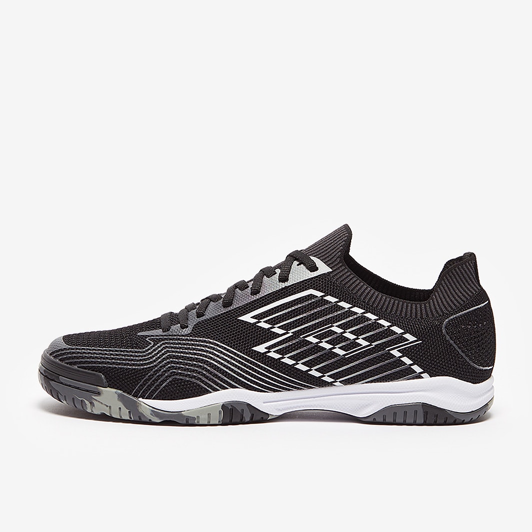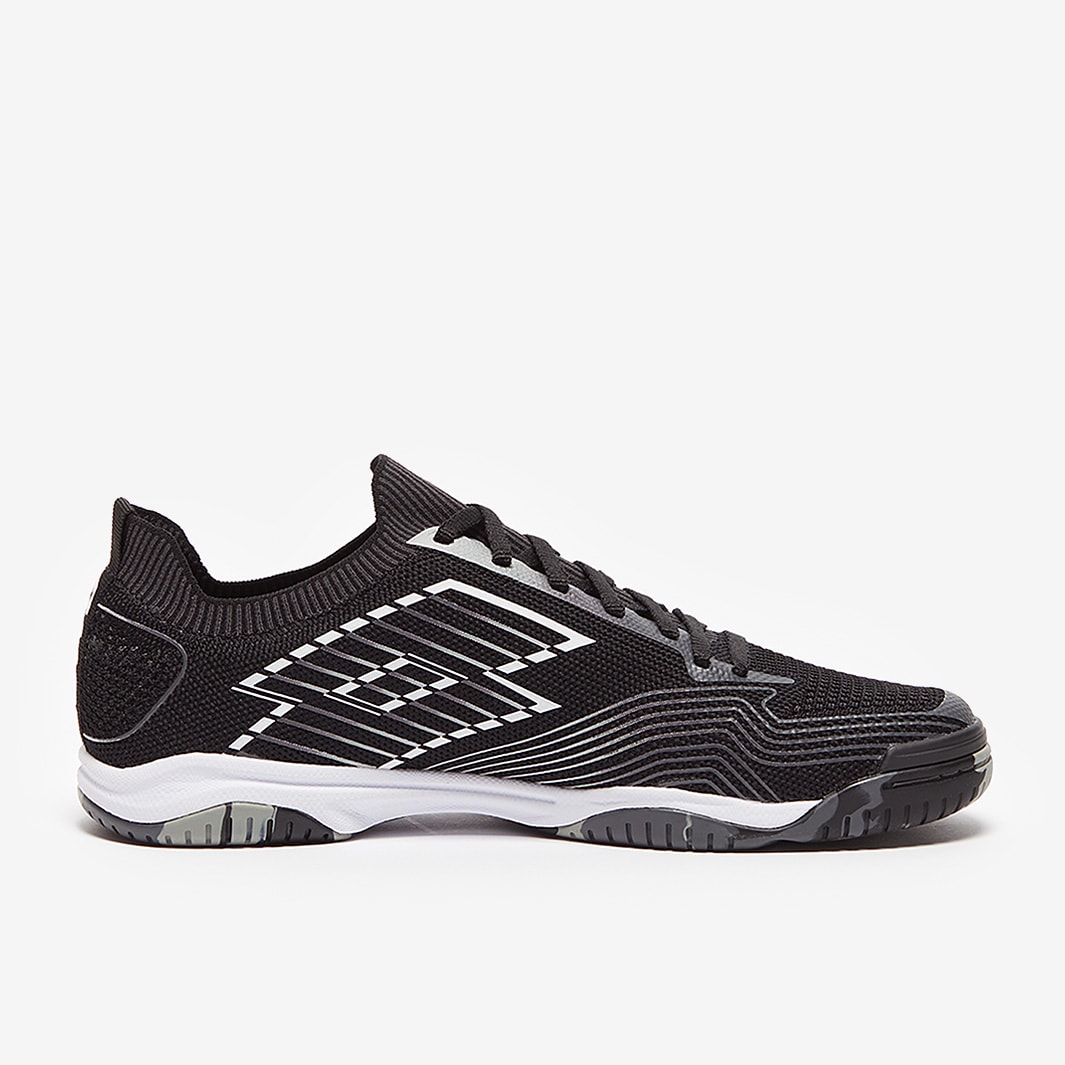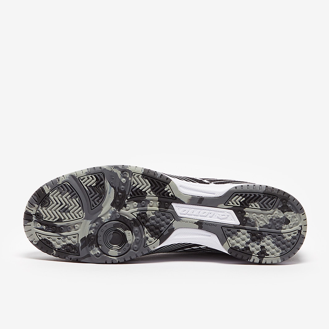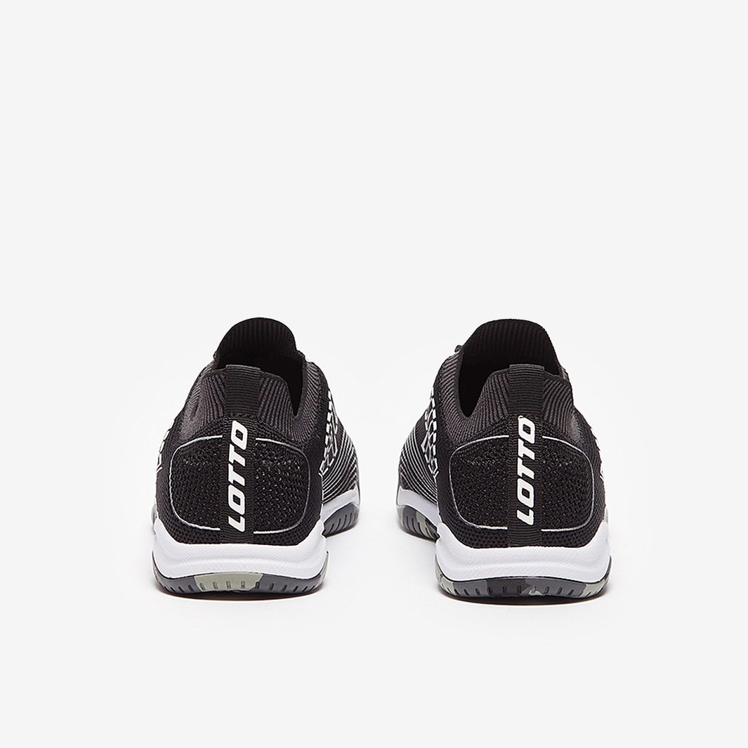 Master the small-sided game in comfort wearing Lotto Tacto 250 IN futsal shoes in All Black/All White/Cool Gray 7C, featuring a new knitted upper for light, agile performance.