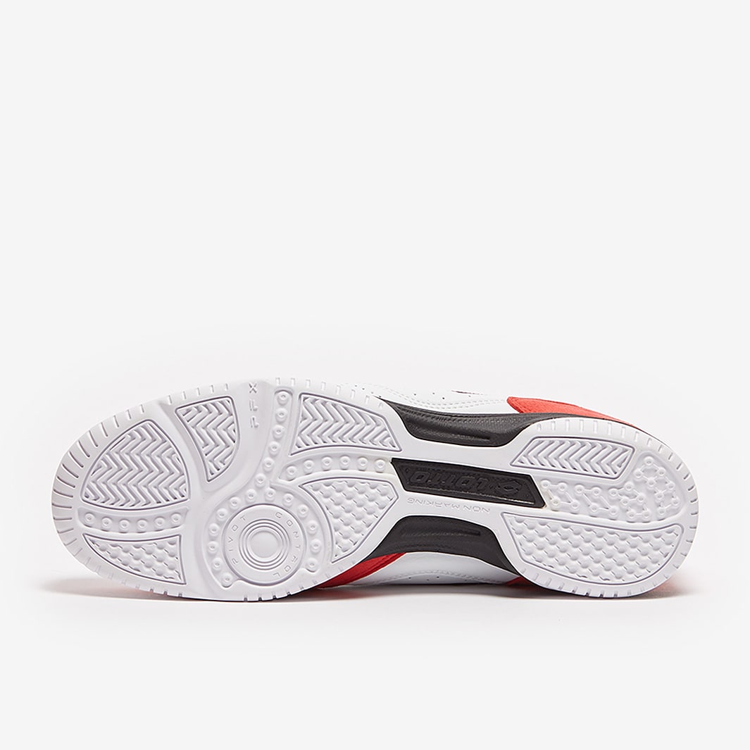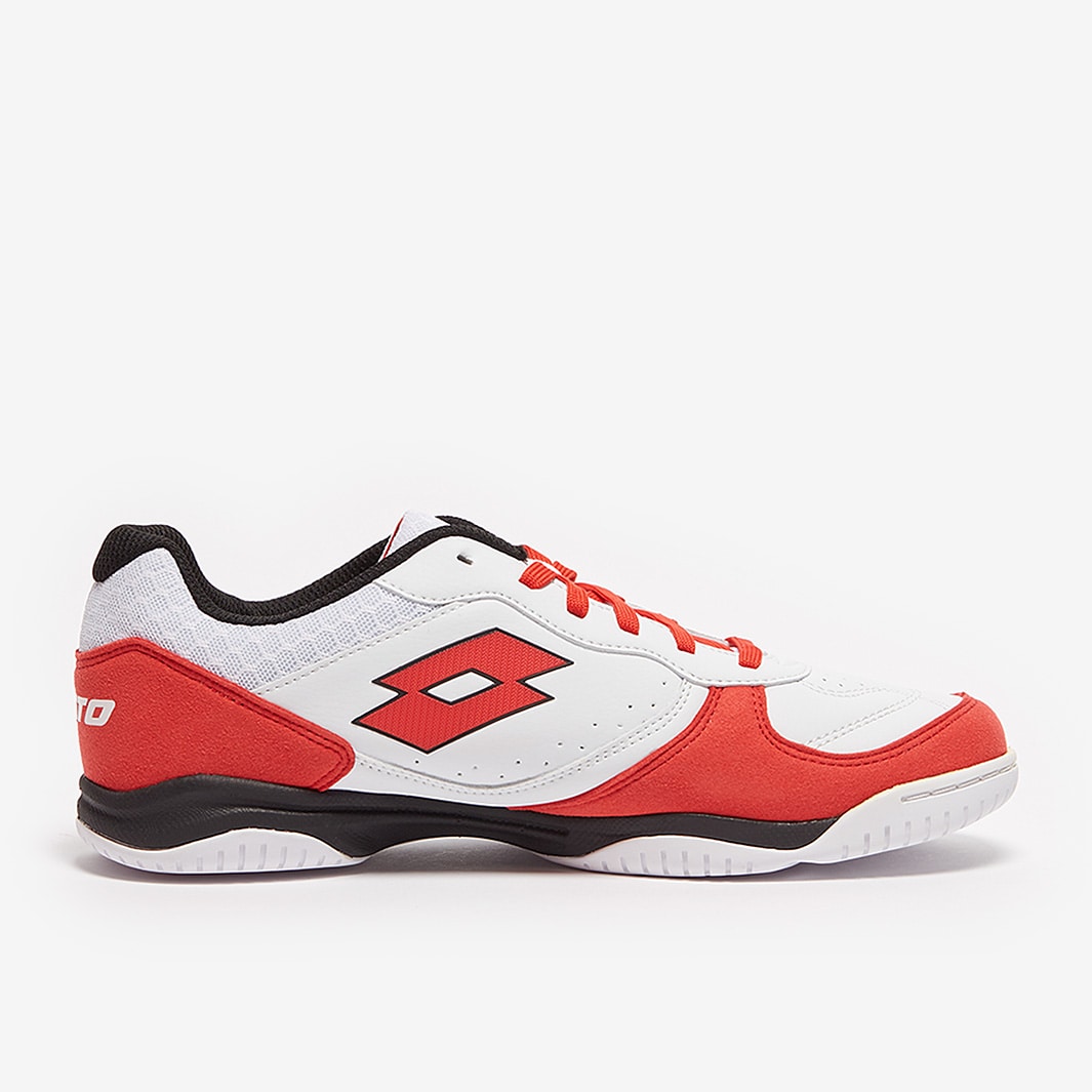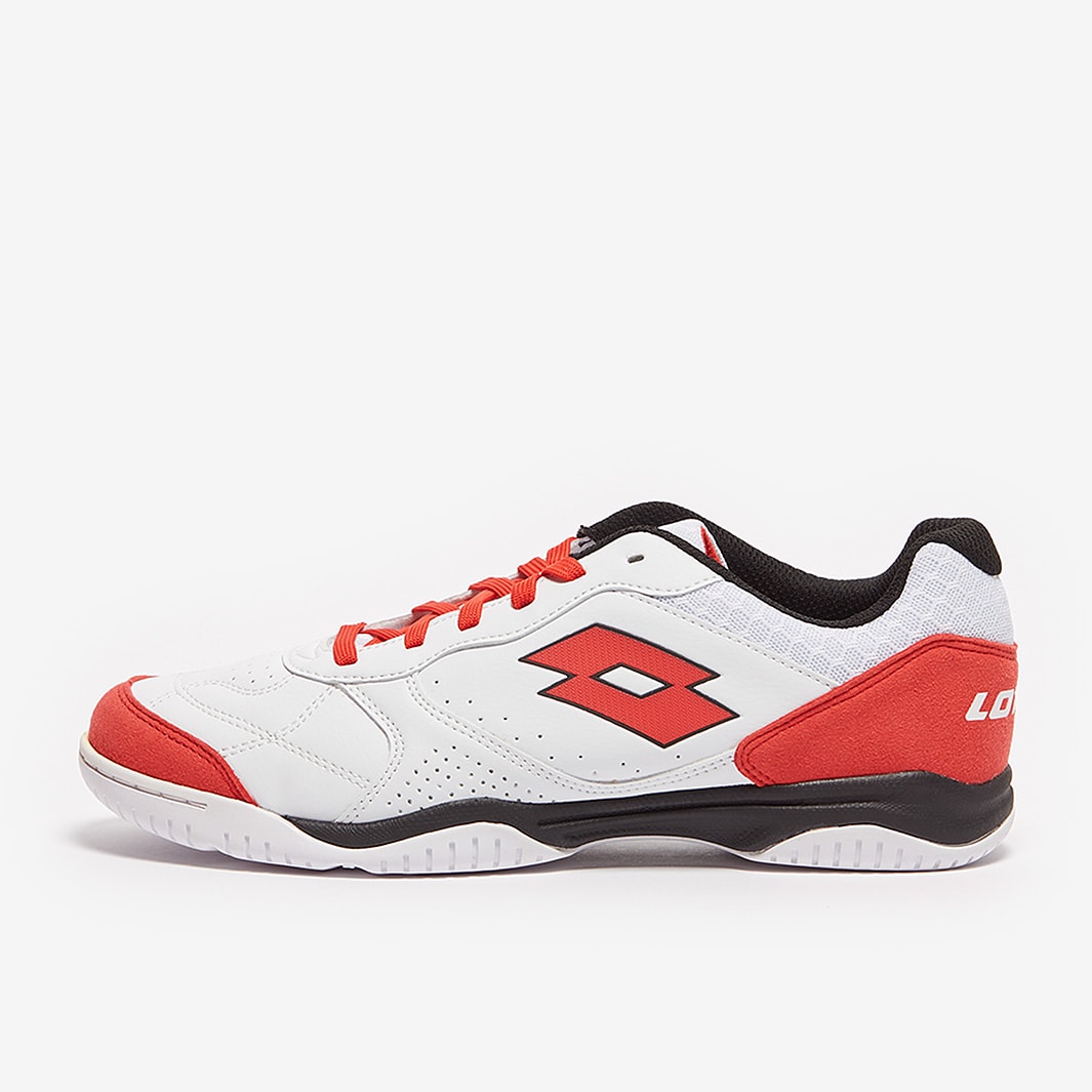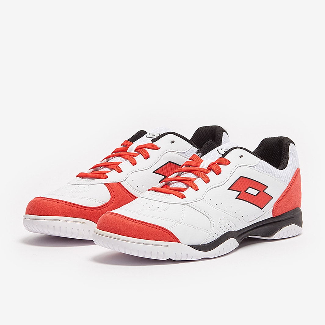 Master the small-sided game wearing Lotto Tacto 300 VI IN futsal shoes in All White/Cliff Red/All Black, featuring a synthetic leather upper for superior touch and comfort.