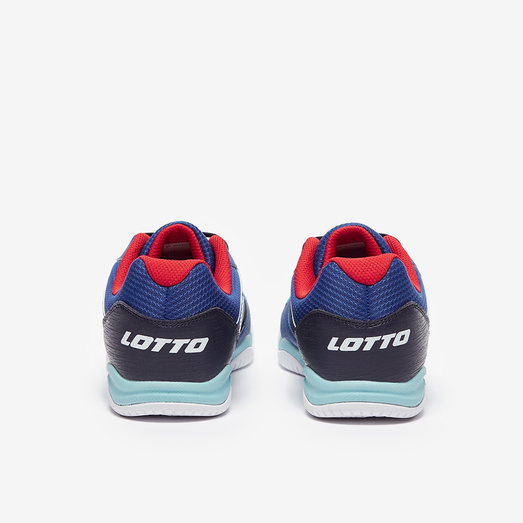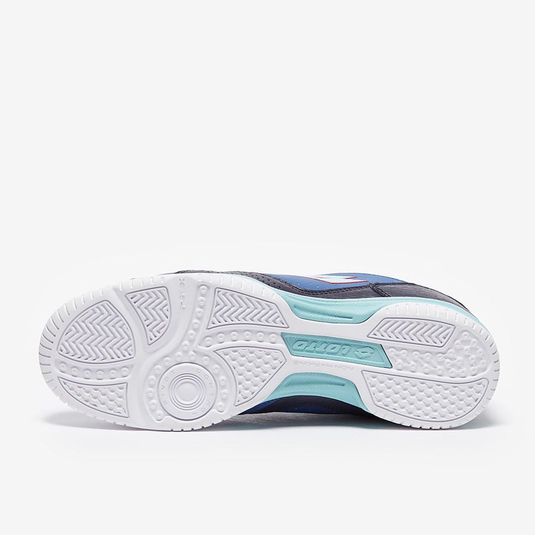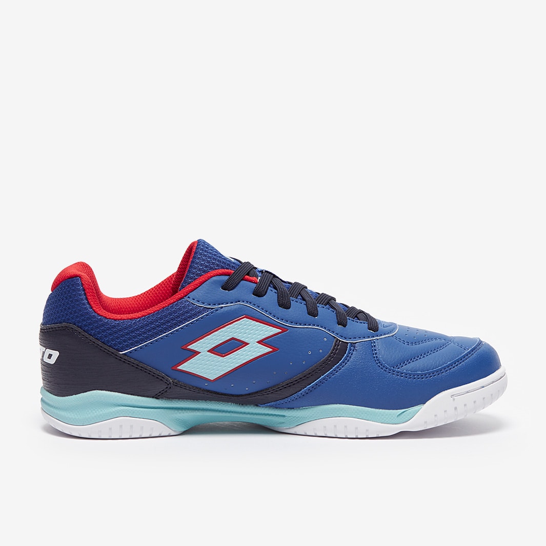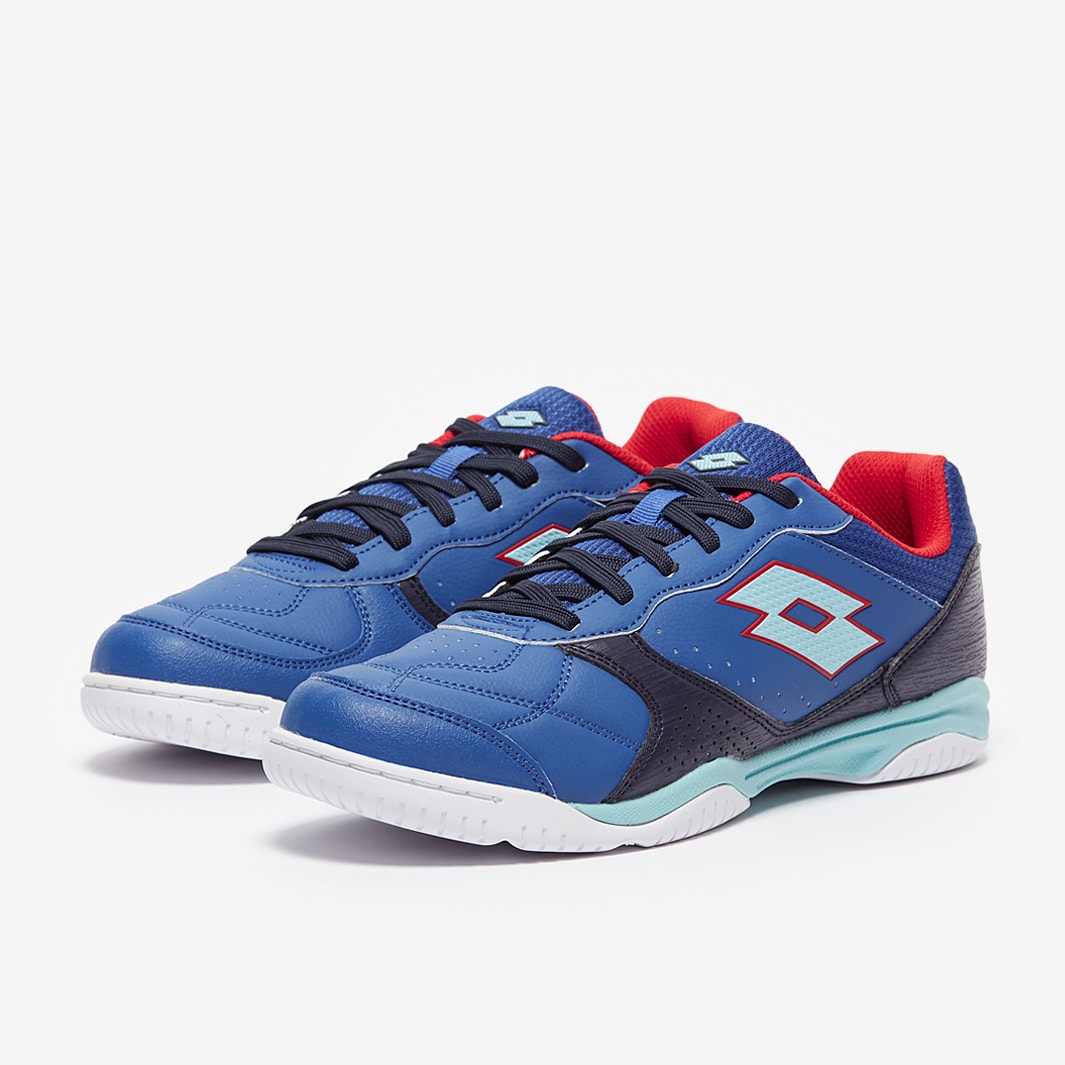 These are the Lotto Tacto 300 VI IN futsal shoes in Pacific Blue/Iced Aqua/Red Poppy, featuring a synthetic leather upper for superior touch and comfort.