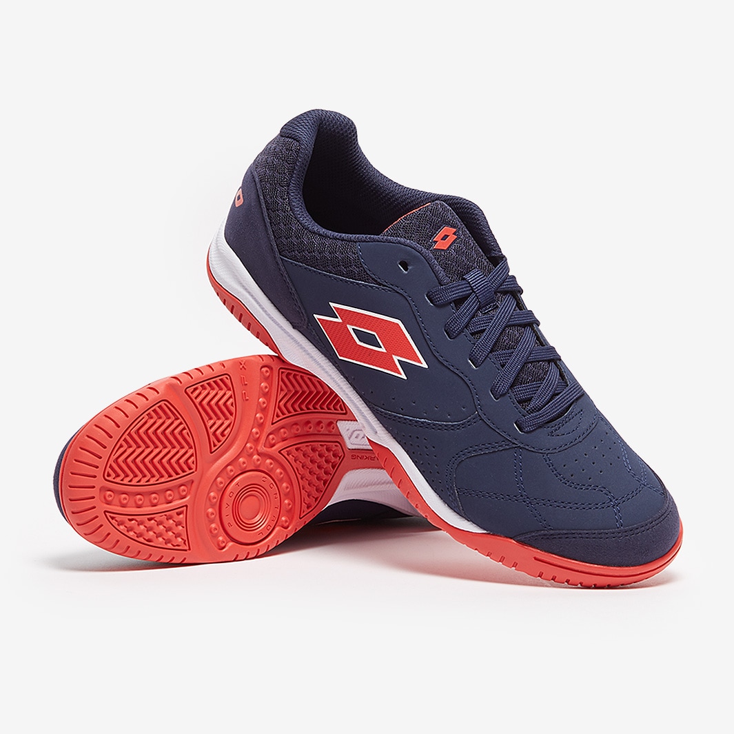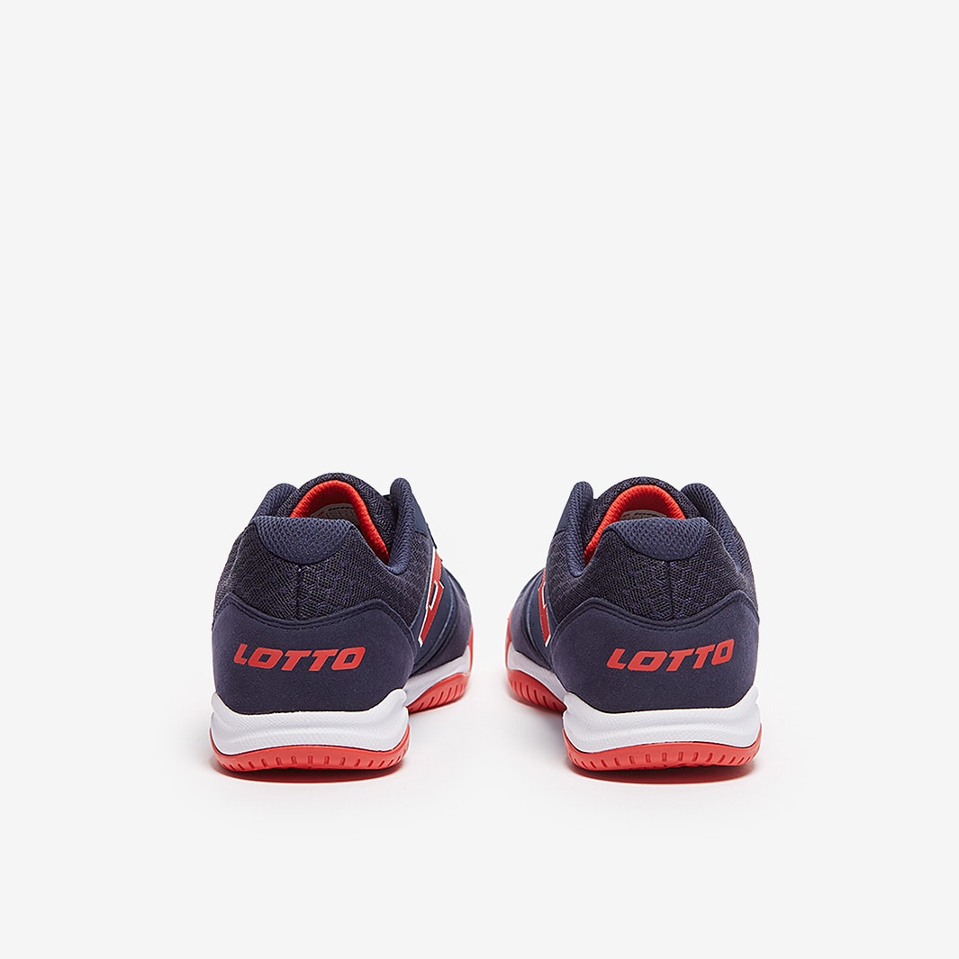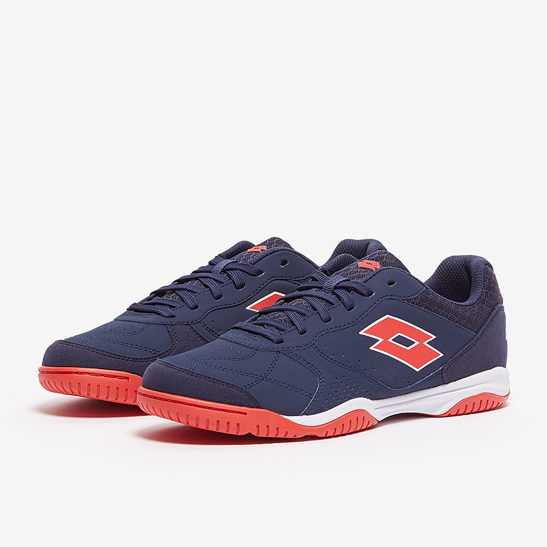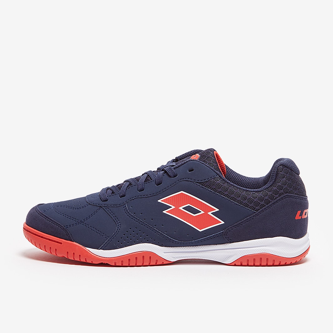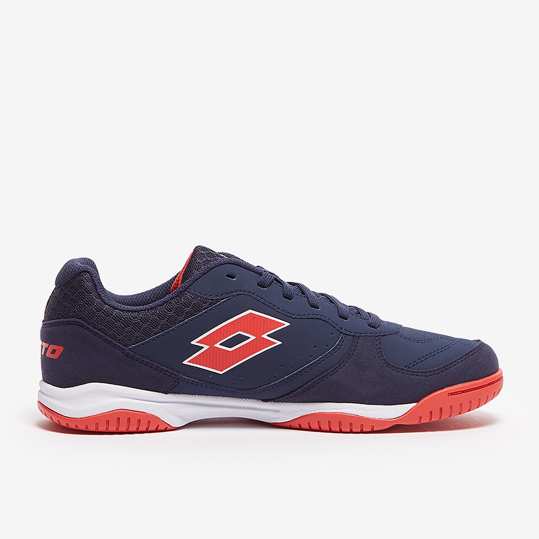 Master the small-sided game wearing Lotto Tacto 301 VI IN futsal shoes in Navy Blue/Cliff Red/All White, featuring a synthetic nubuck upper for superior touch and comfort.