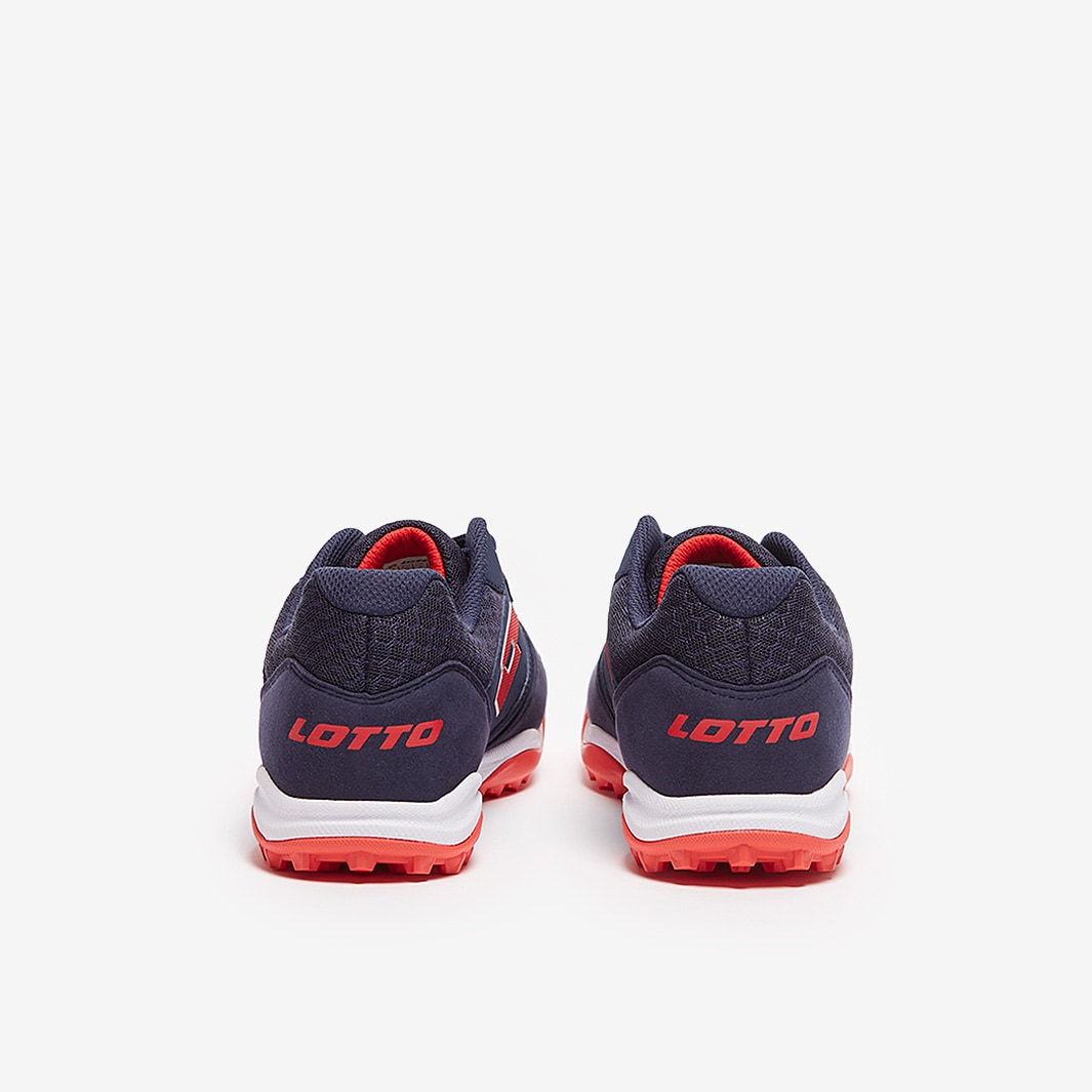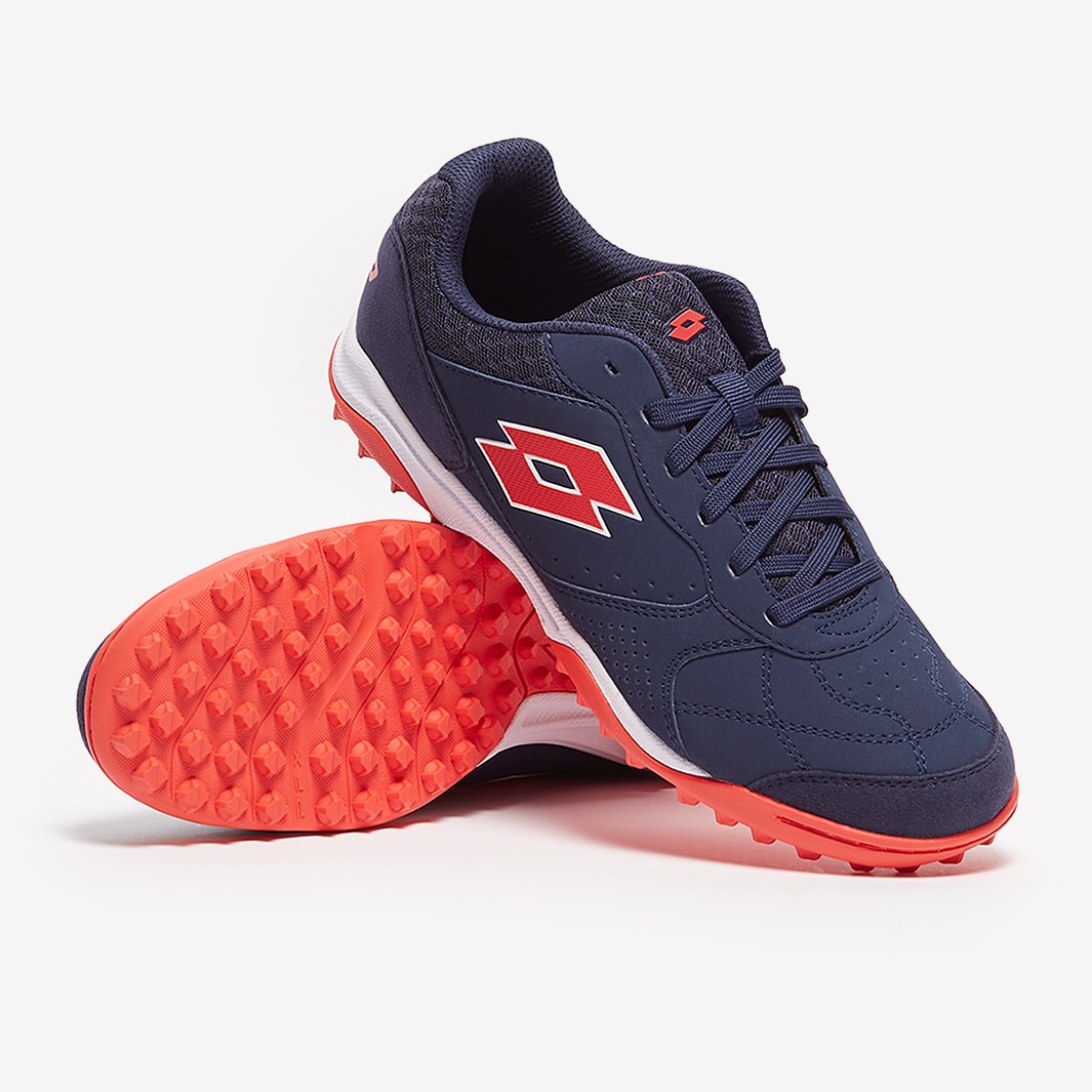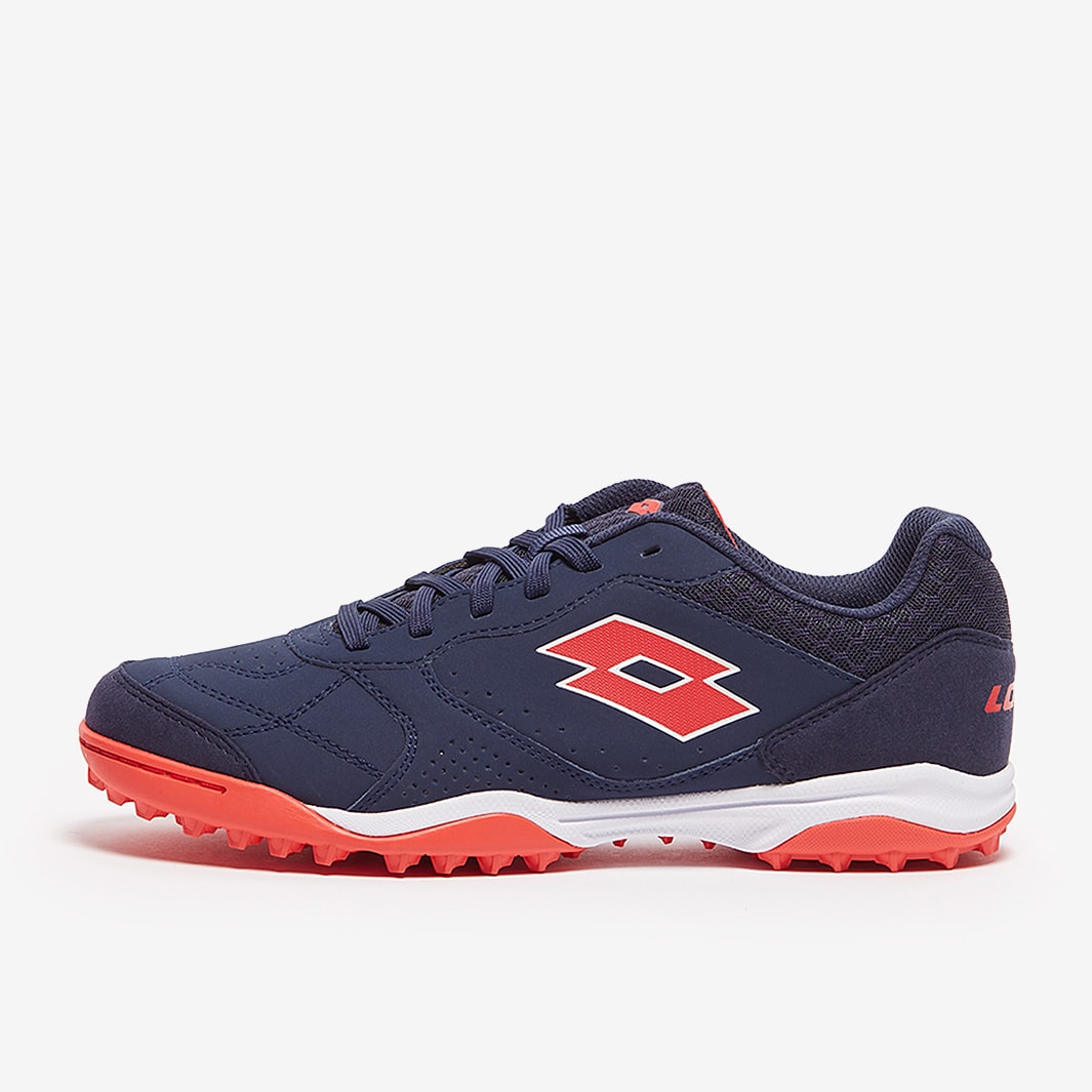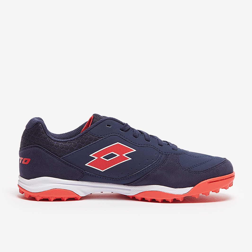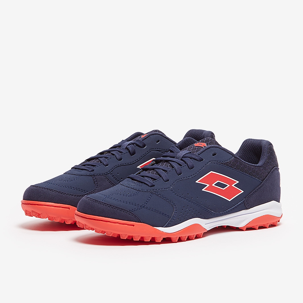 Master the small-sided game wearing Lotto Tacto 301 VI TF futsal shoes in Navy Blue/Cliff Red/All White, featuring a synthetic nubuck upper for superior touch and comfort.