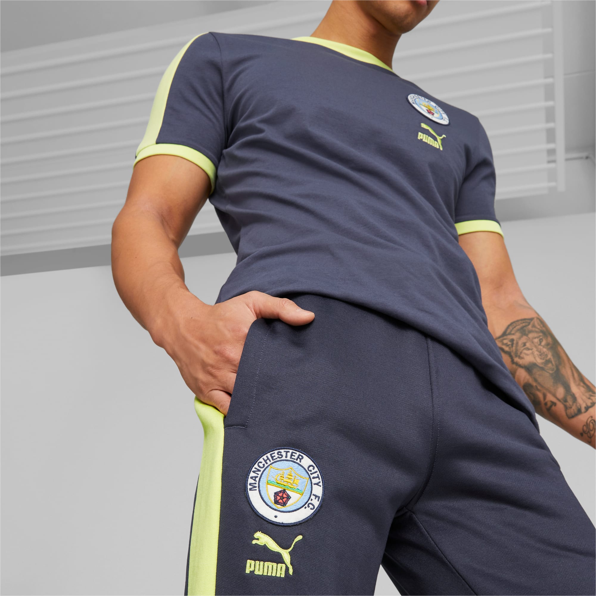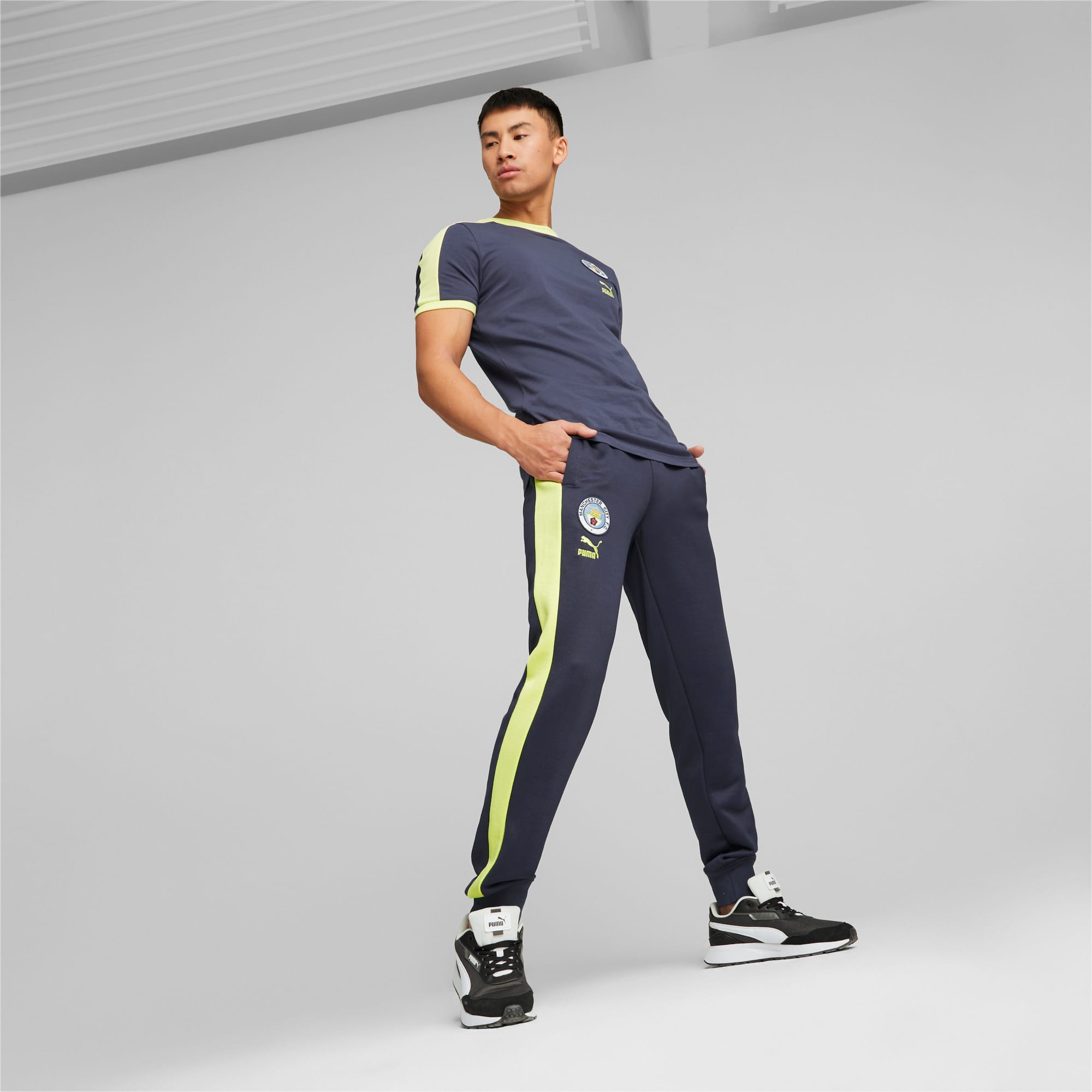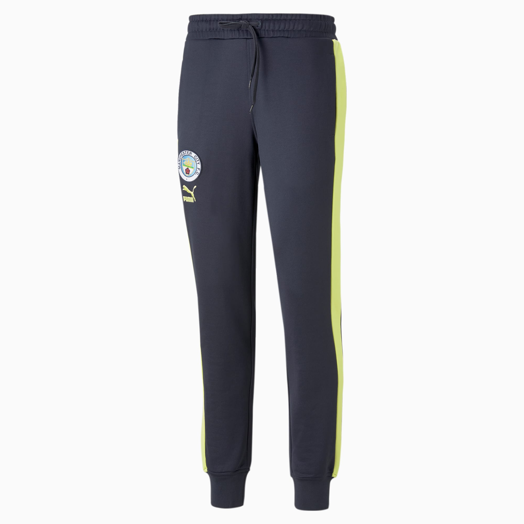 These are the new retro-inspired Puma Manchester City ftblHeritage T7 Track Pants in Parisian Night/Fresh Yellow.