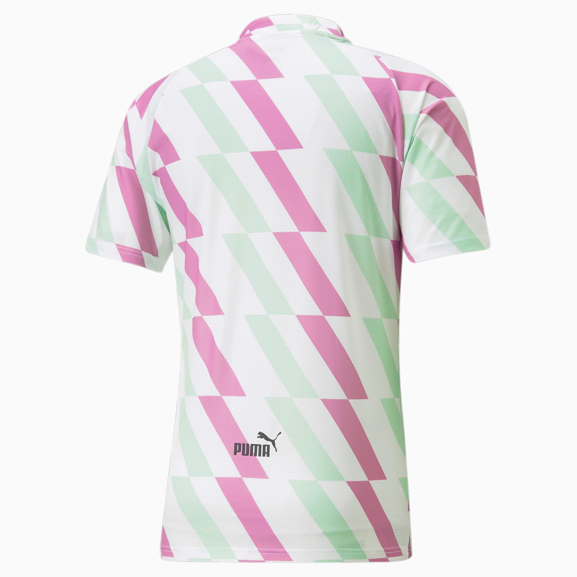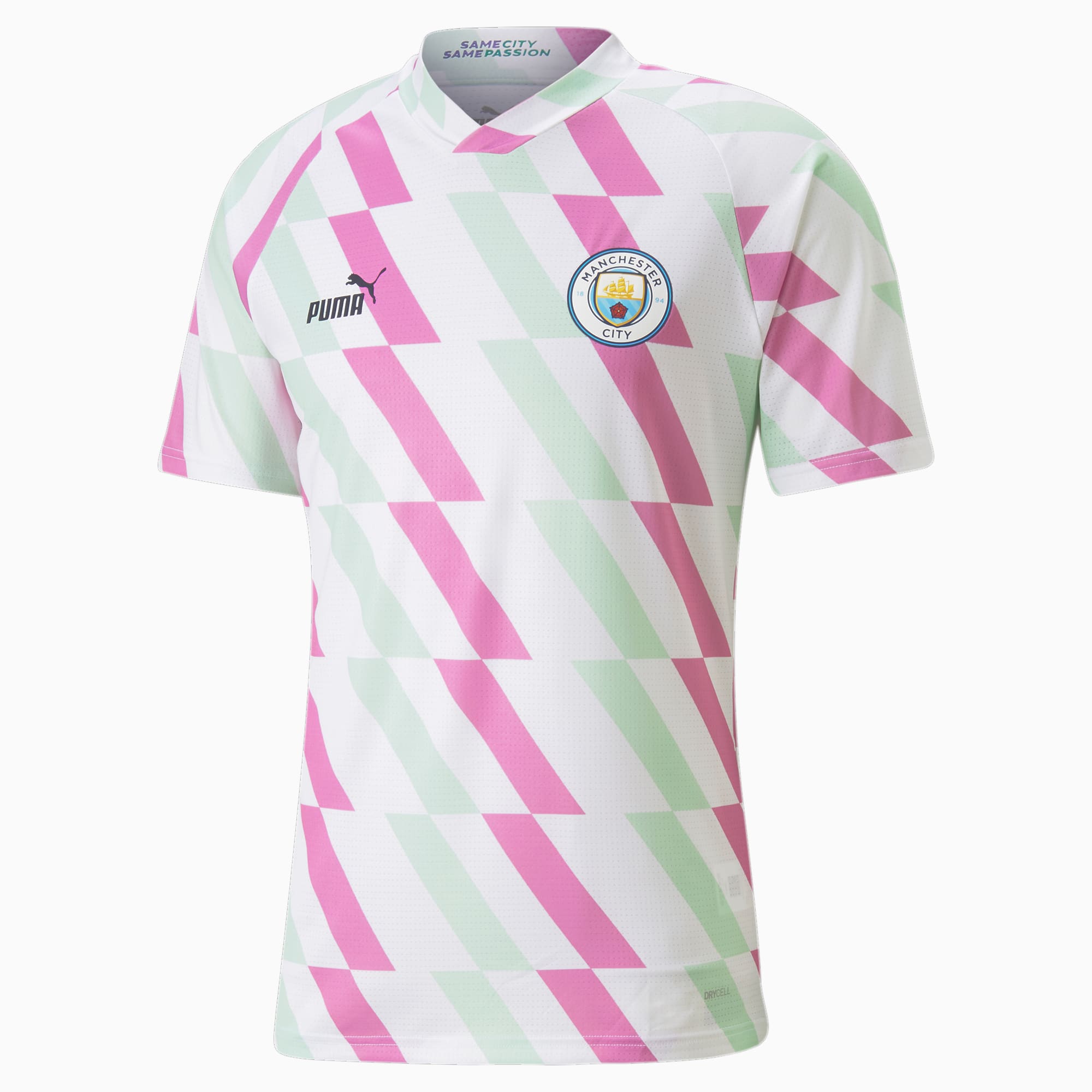 The Manchester City Prematch Jersey in Puma White/Mist Green/Mauve Pop is a tribute to the influential activist Emmeline Pankhurst, who played a significant role in shaping the UK suffragette movement.