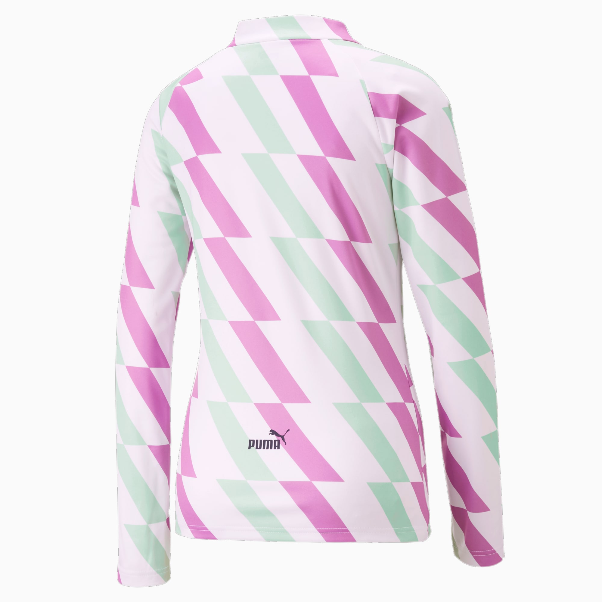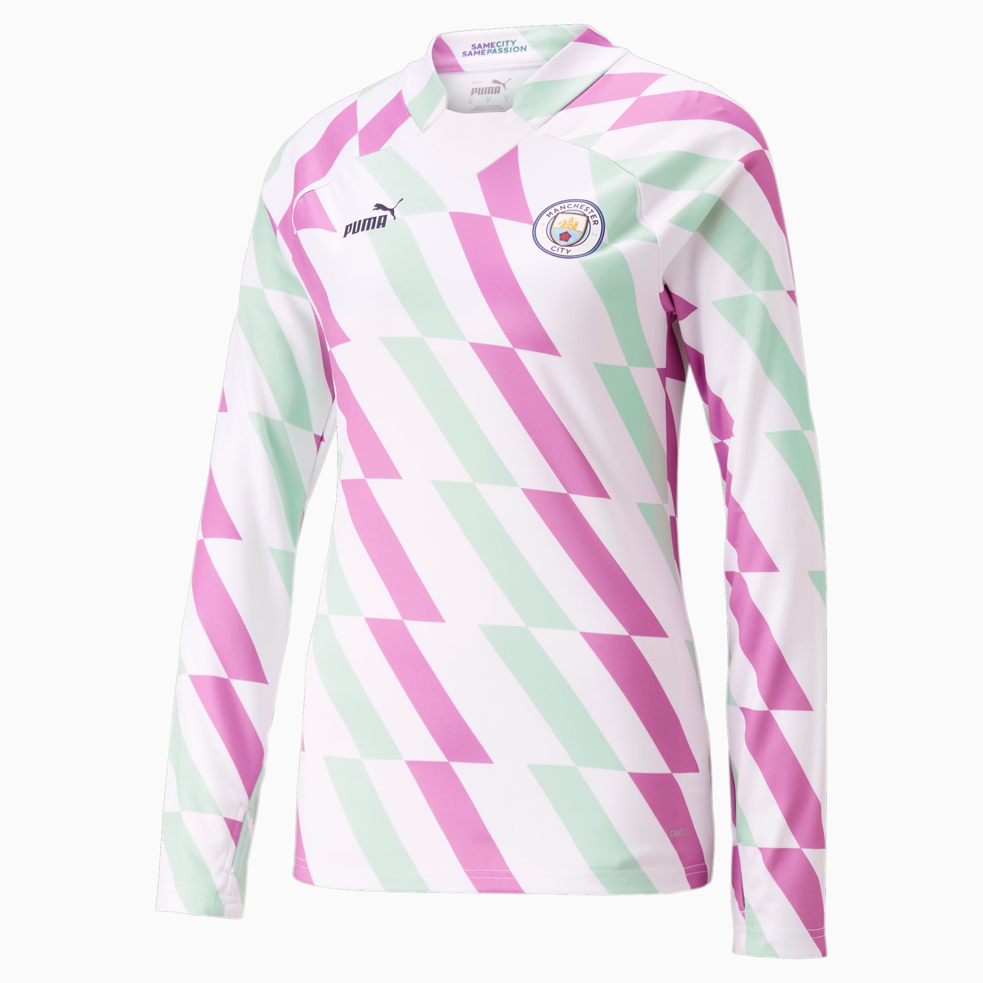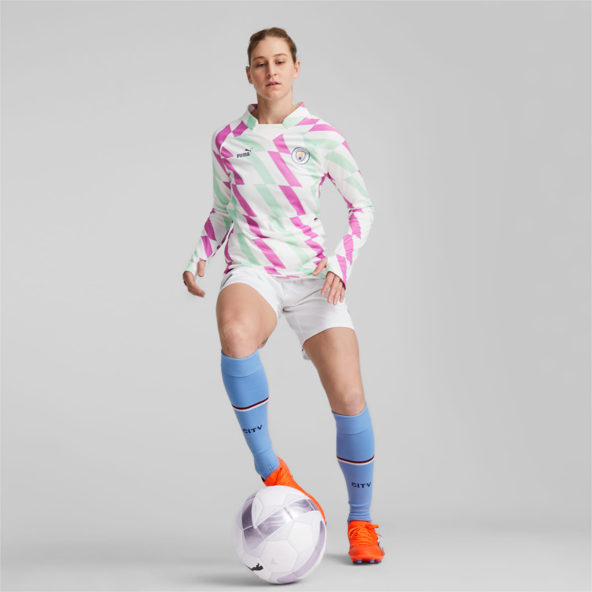 This Puma Manchester City Prematch Sweatshirt in White/Mist Green/Mauve Pop pays tribute to activist Emmeline Pankhurst, who played a significant role in the UK suffragette movement.
