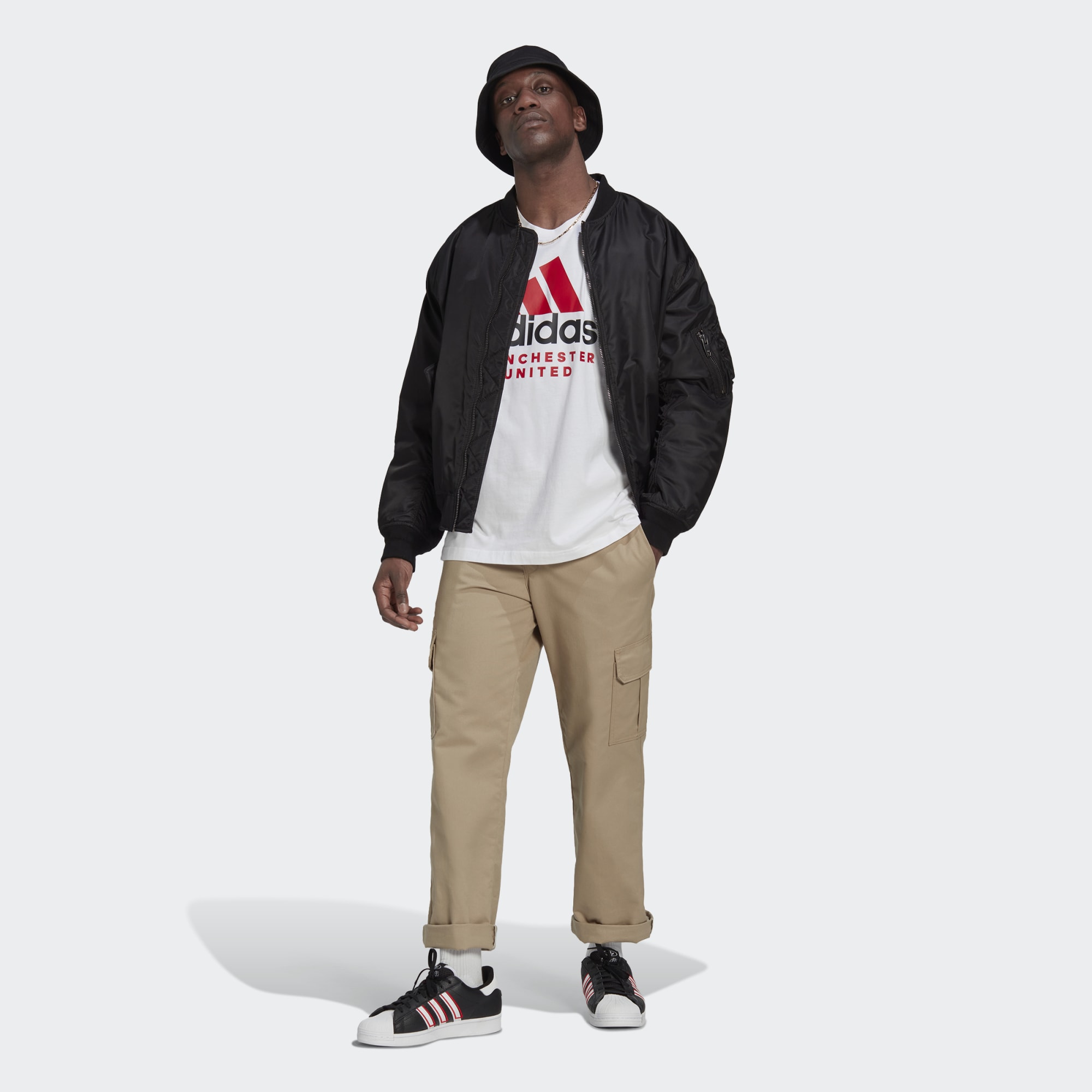 The name of Manchester United stands out underneath the adidas Badge of Sport for a classic look.