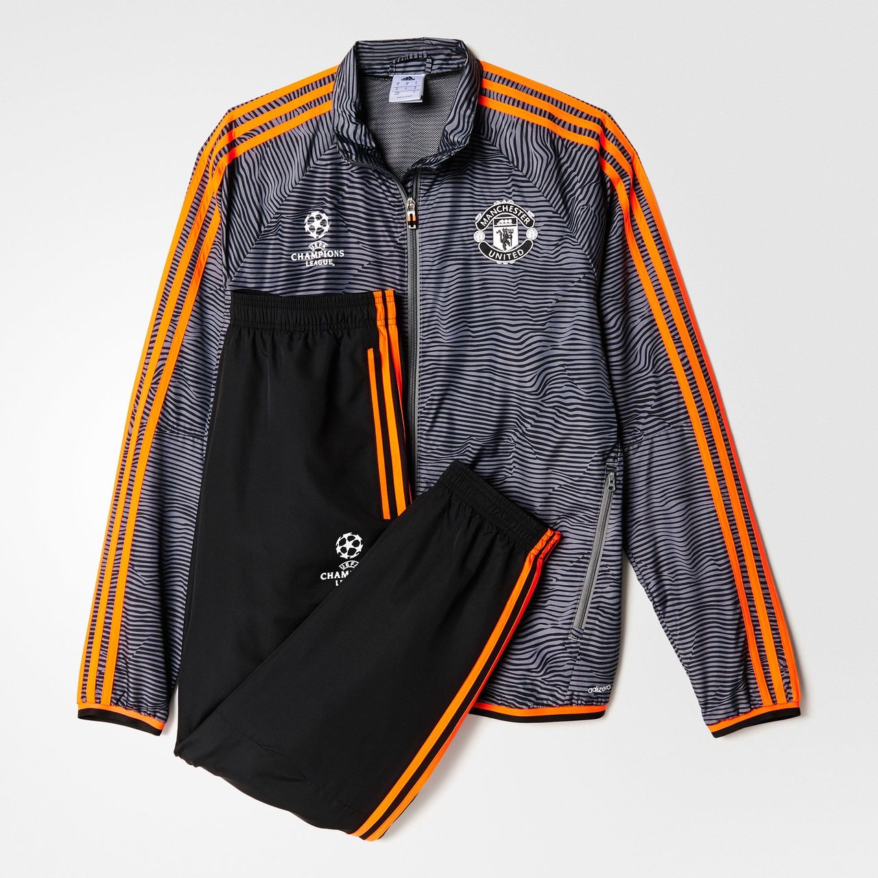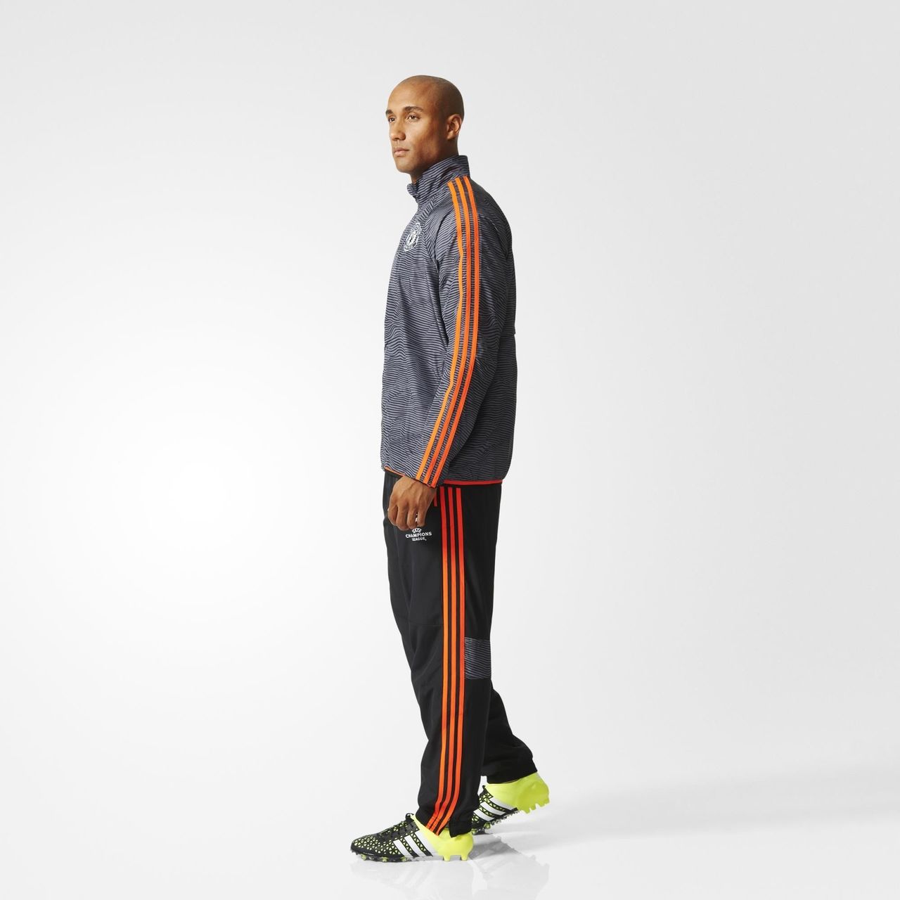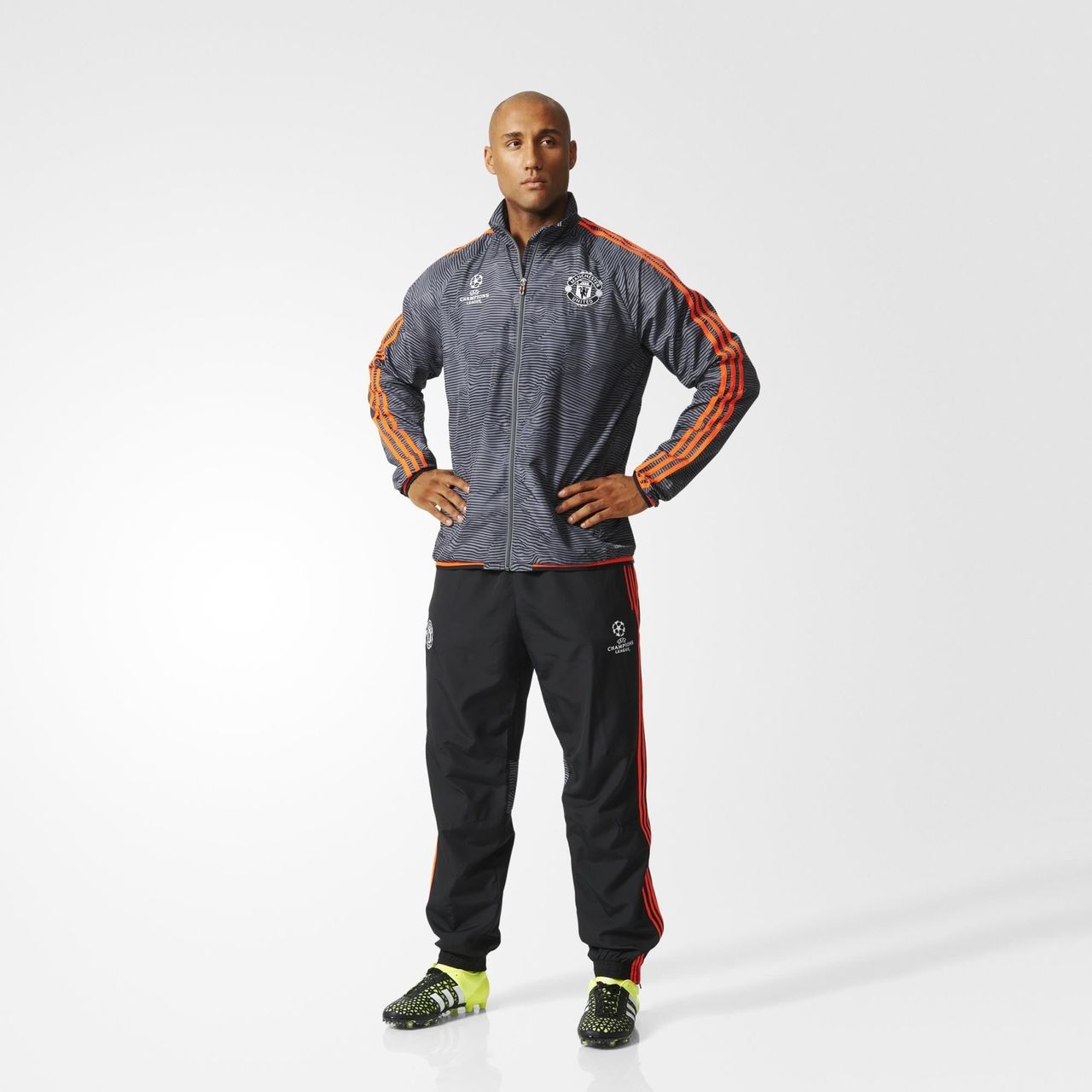 You can cheer on the Red Devils in this Manchester United FC UCL Presentation Suit. Made of sweat-wicking climalite fabric to keep you dry and comfortable. Showing off the team badge on the chest, the jacket packs away for easy carrying. The pants feature a team badge at the hip and are finished with convenient ankle zips.