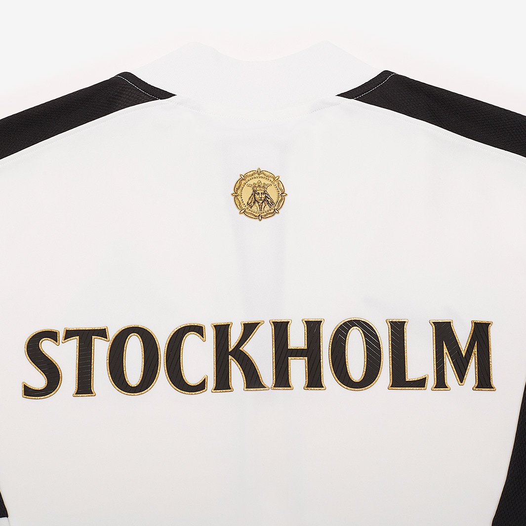 The club crest is prominently displayed over the heart, and the back neck features a bold print showcasing the city seal of Stockholm. The original Nike Swoosh logo adds a touch of elegance to the overall look.