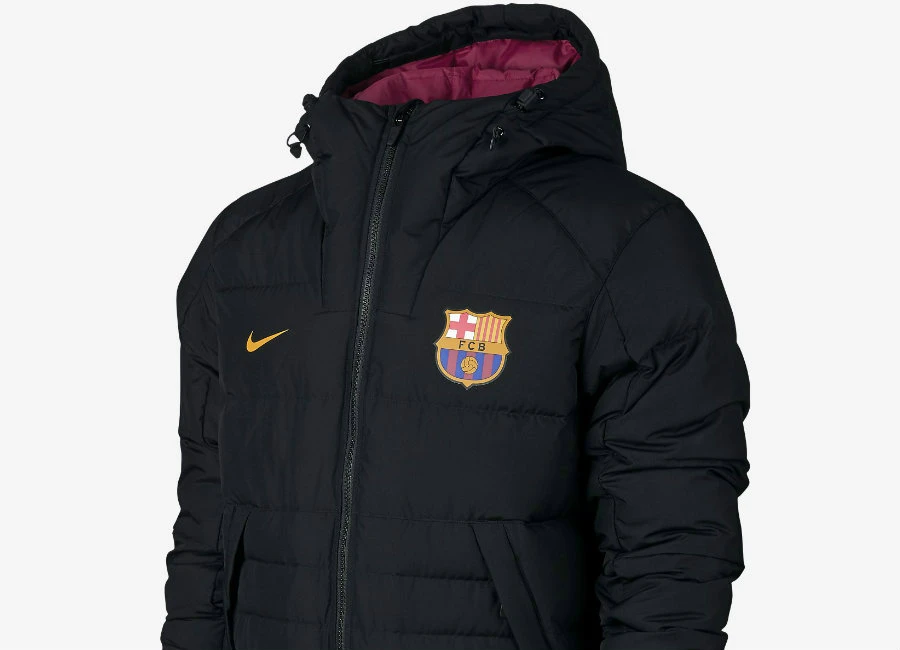The Nike 17/18 FC Barcelona Jacket features warm down fill and an adjustable hood for insulated warmth and enhanced coverage in the cold.