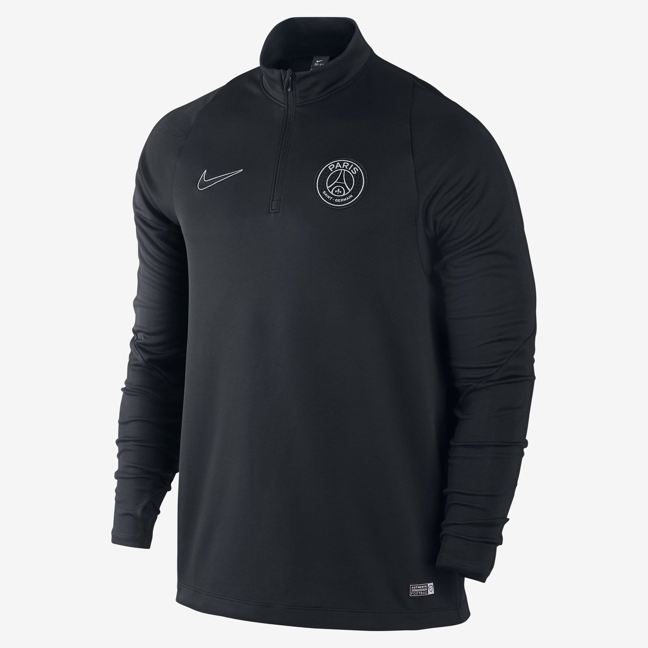 The quarter-zip Paris Saint-Germain Ignite Midlayer Nike Football Shirt is made with sweat-wicking fabric and mesh sleeve panels for comfort and ventilation during practice and warmups. A team logo on the chest pays tribute to an elite football club.