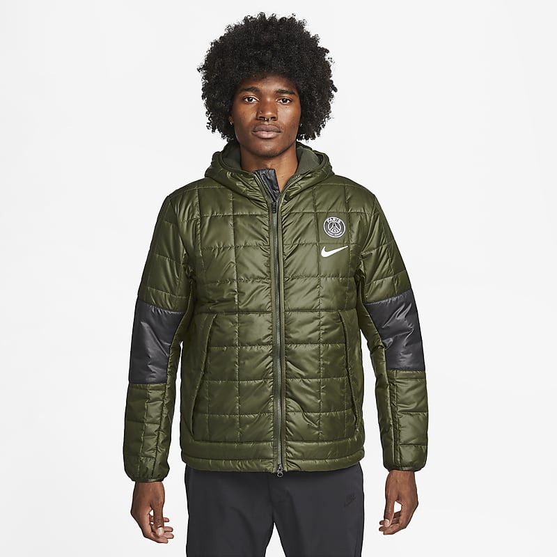 Gear up for chilly or rainy matches and other cold-weather outings in this Paris Saint-Germain Fleece-Lined Hooded Jacket in Cargo Khaki/Black/White.