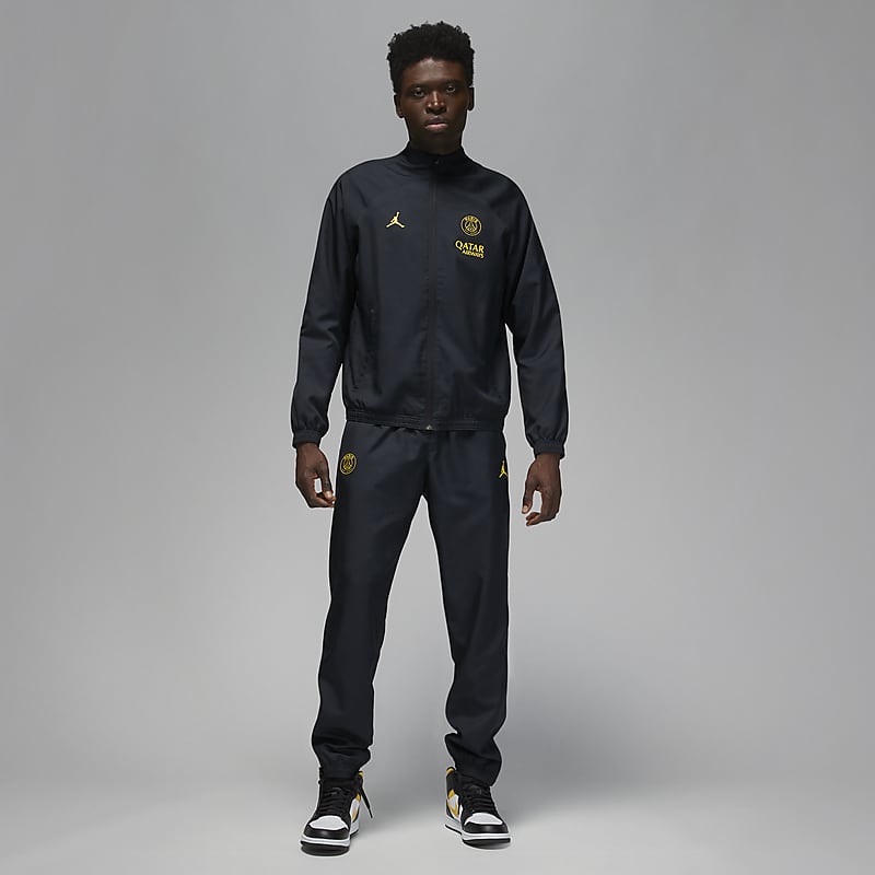 This Paris Saint-Germain Strike Fourth Jordan Dri-FIT Woven Football Tracksuit in Black/Tour Yellow is designed for football enthusiasts who want to showcase their team pride while training.